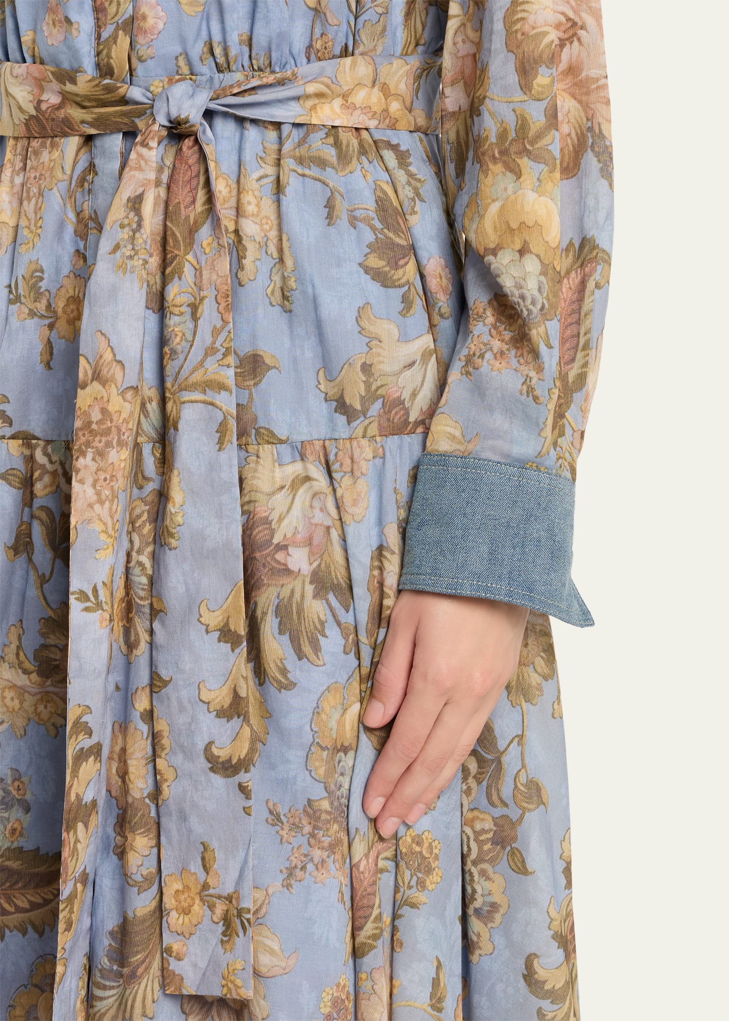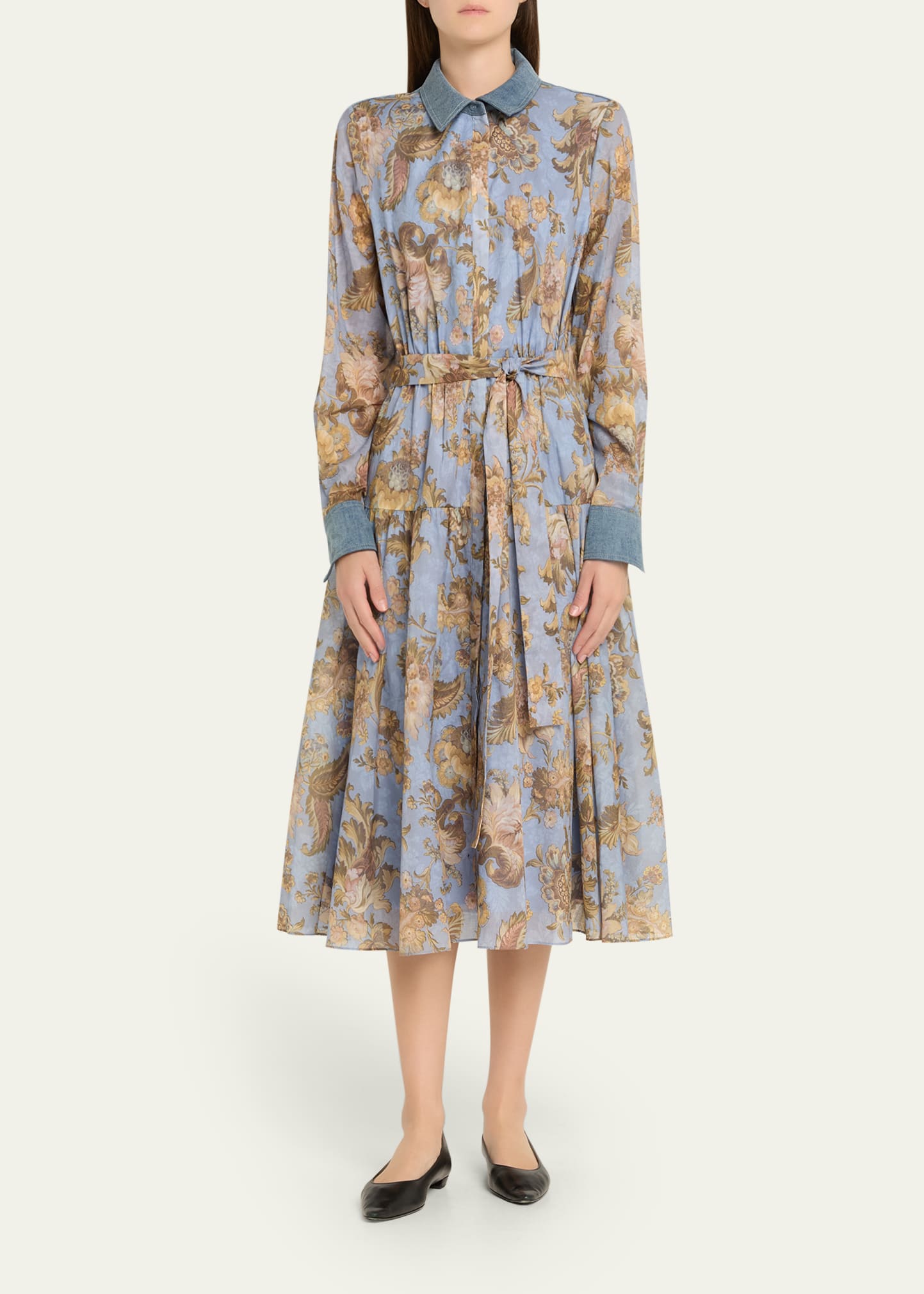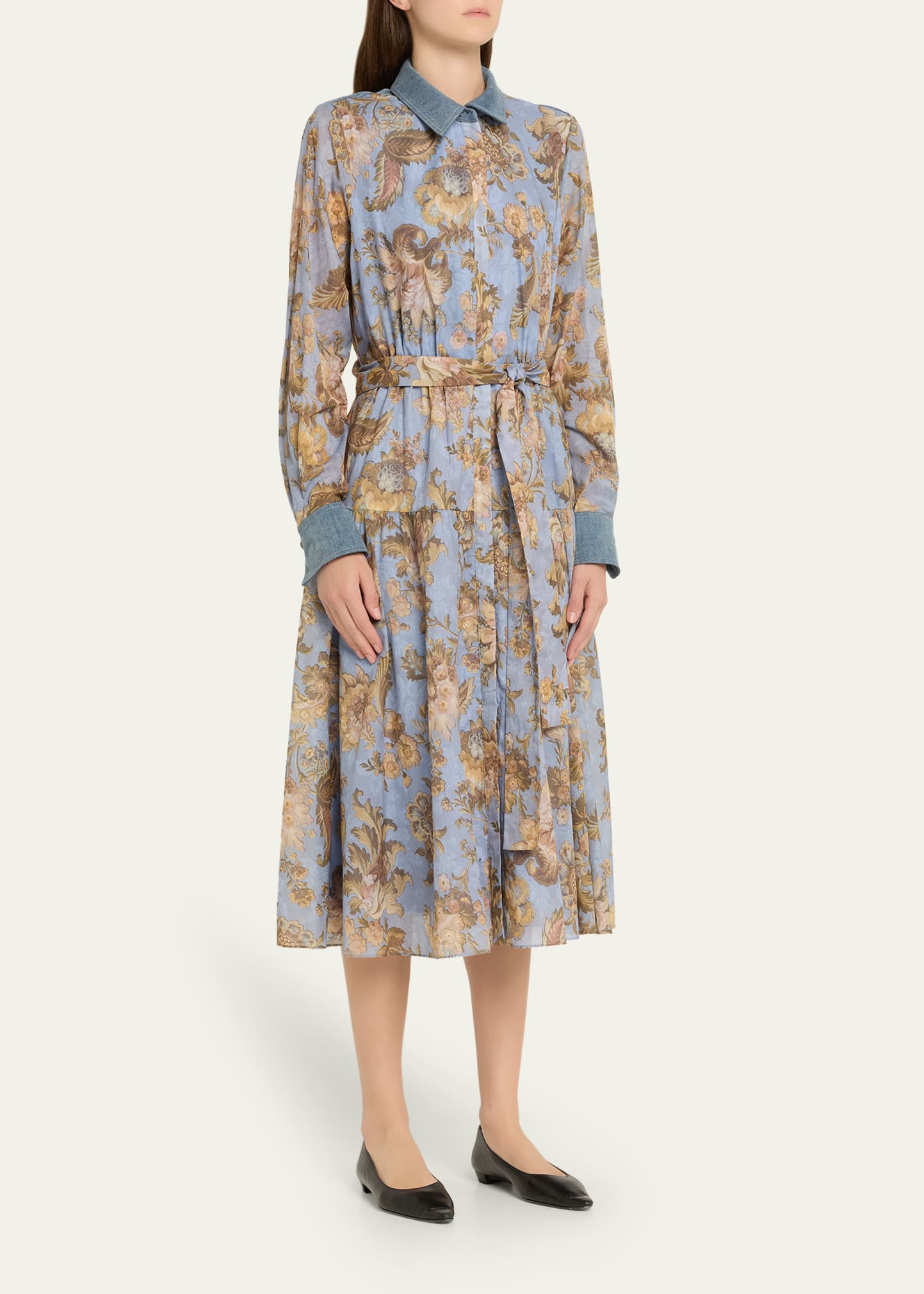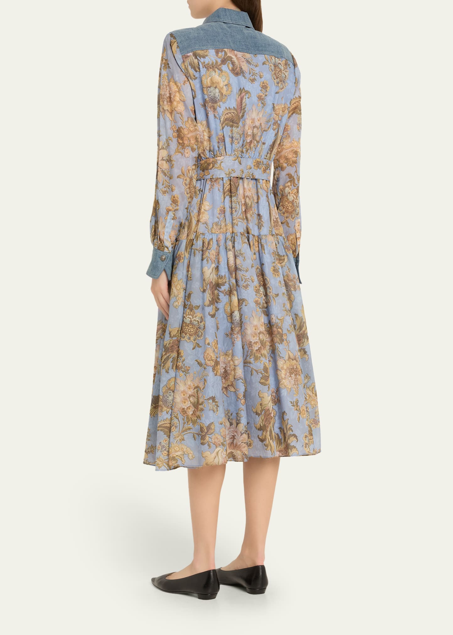 • Printed with bright florals, the Kobi Halperin "Evans" midi shirtdress features denim cuffs, collar, and back yoke for a touch of solid contrast