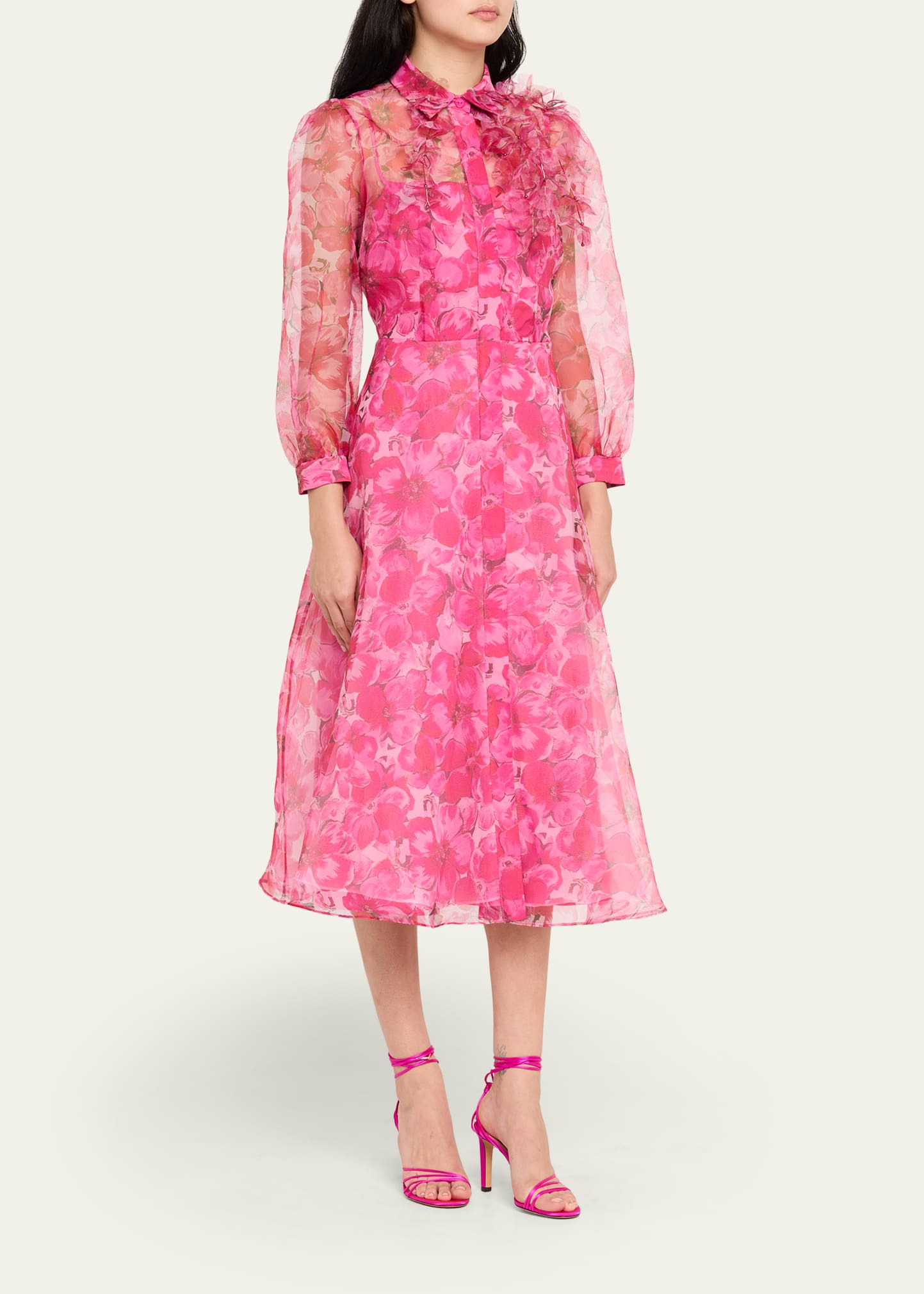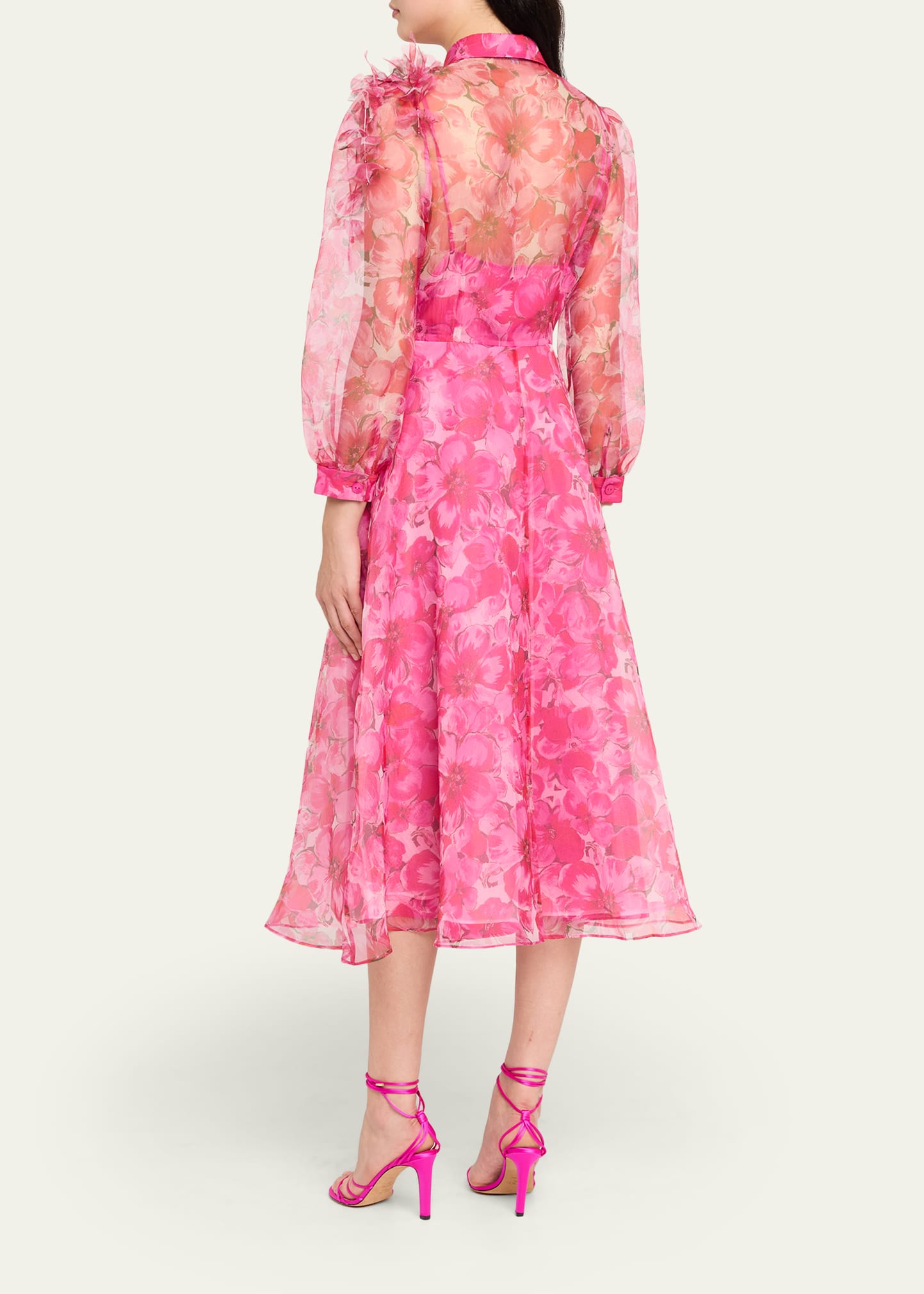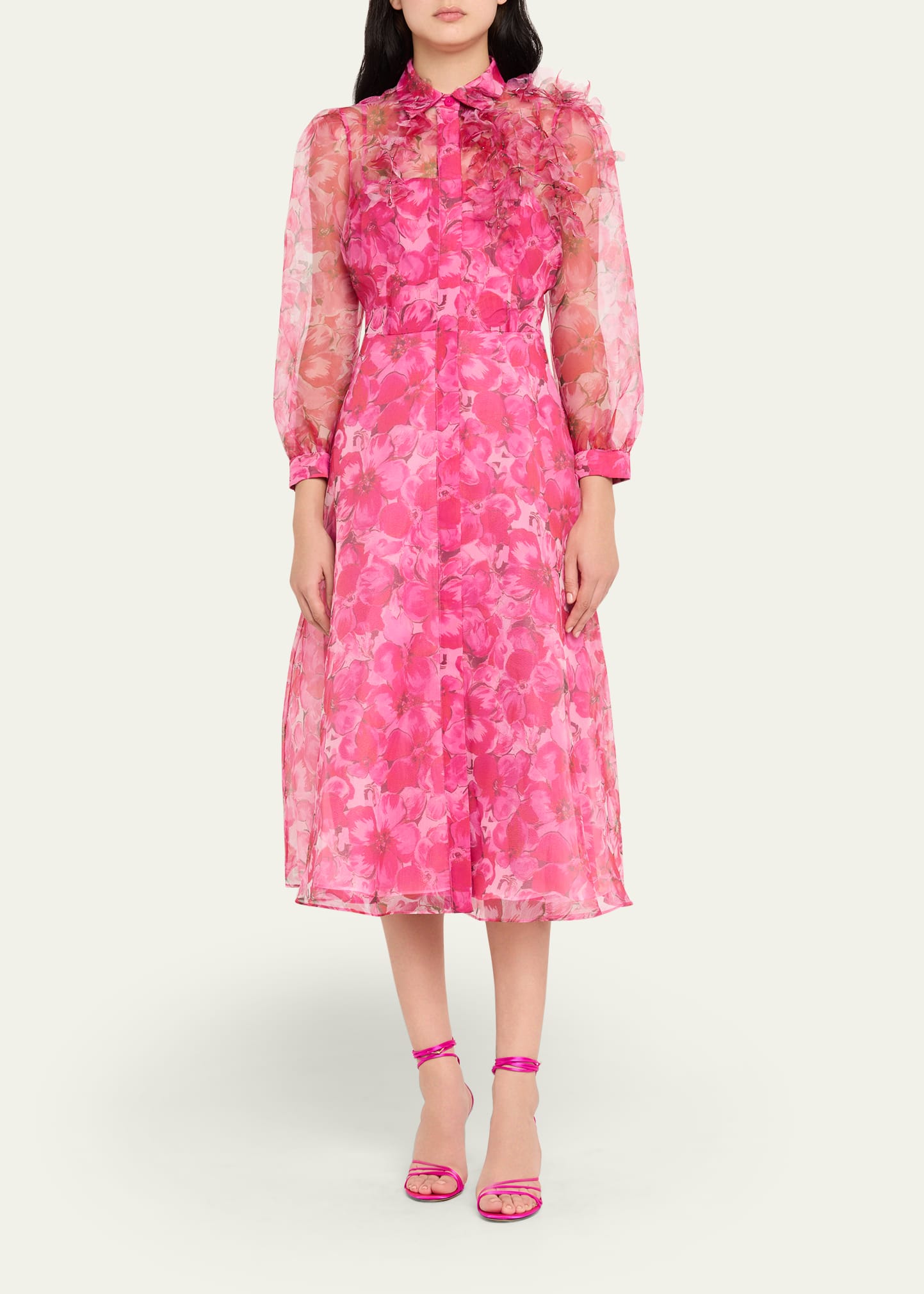 Rickie Freeman for Teri Jon Floral-Print Organza Midi Shirtdress