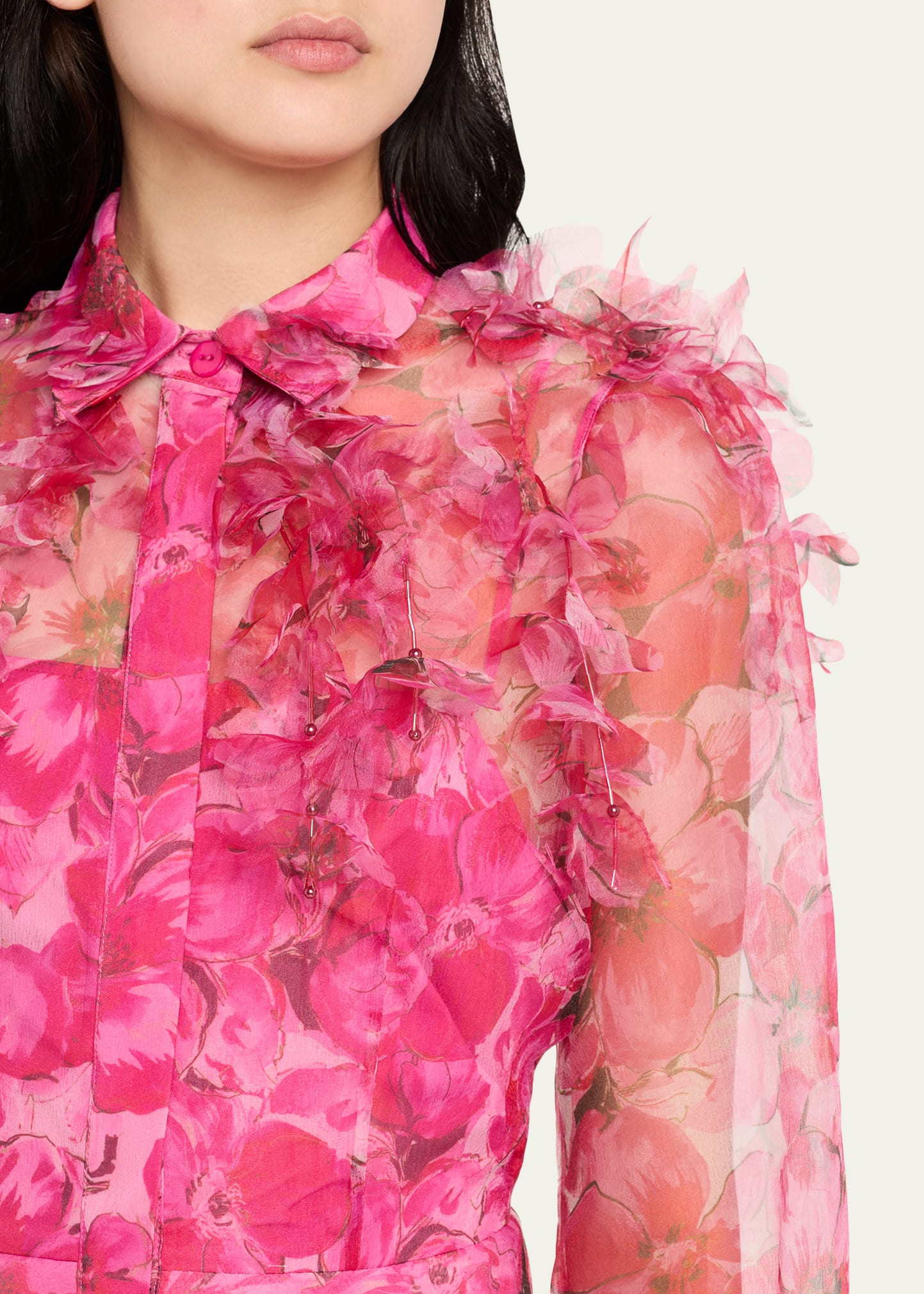 • Crafted in a floral-print organza, this Rickie Freeman for Teri Jon midi shirtdress flutters with bead and floral appliqué tassels