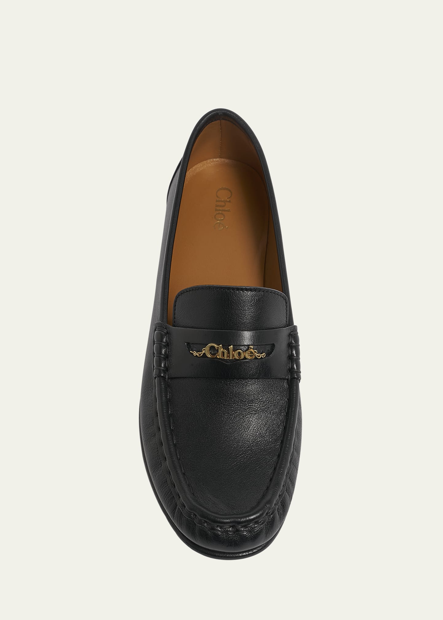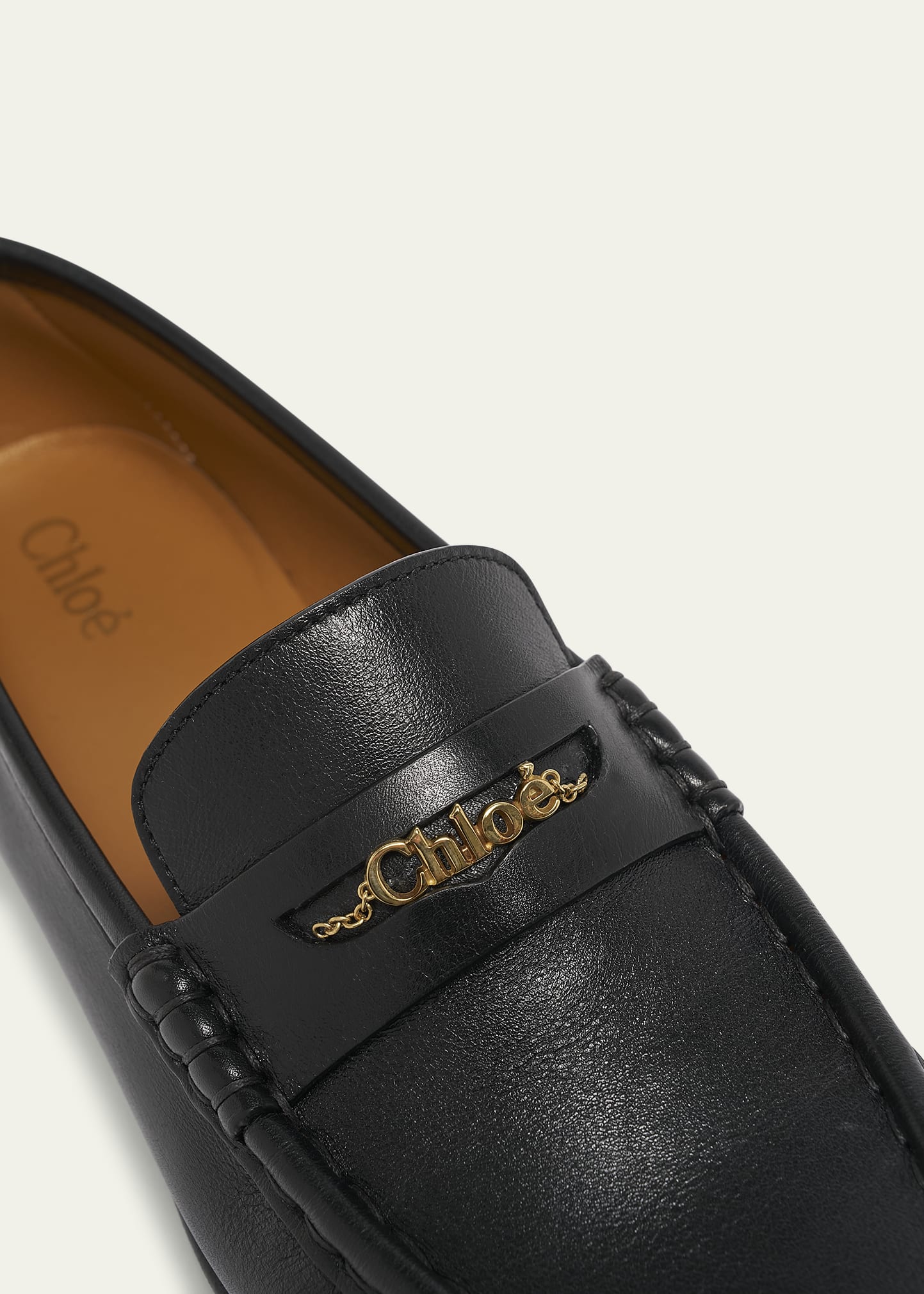 • Chloe calf leather loafers featuring a goldtone logo chain detail