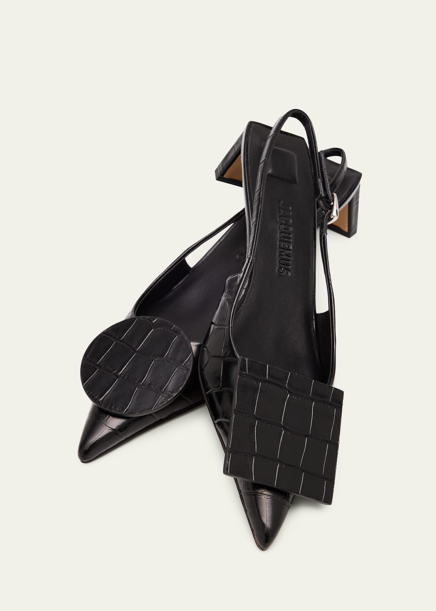 • Adorned with statement circular and square decorative accents, these pumps by Jacquemus are crafted from croc-embossed Italian calf leather
