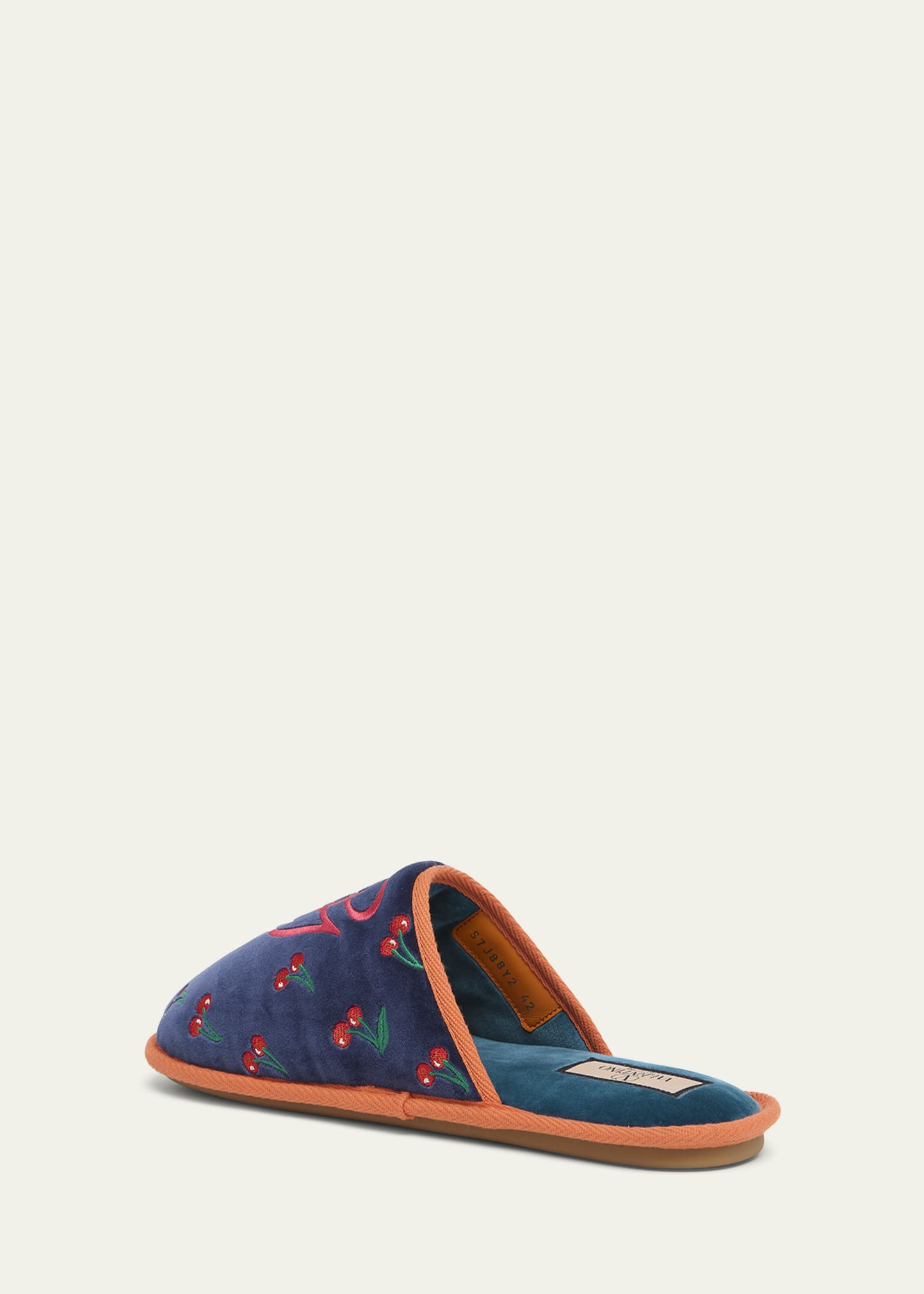 • Valentino Garavani "Chambre" house slippers featuring cherry motifs with monogram embroidery on the vamp
