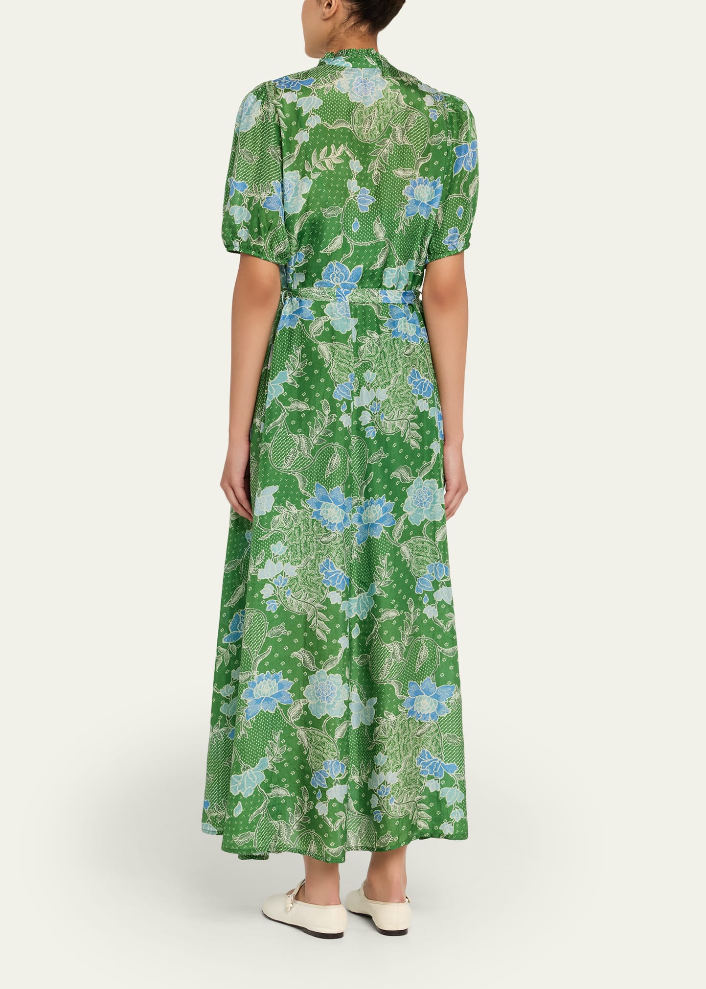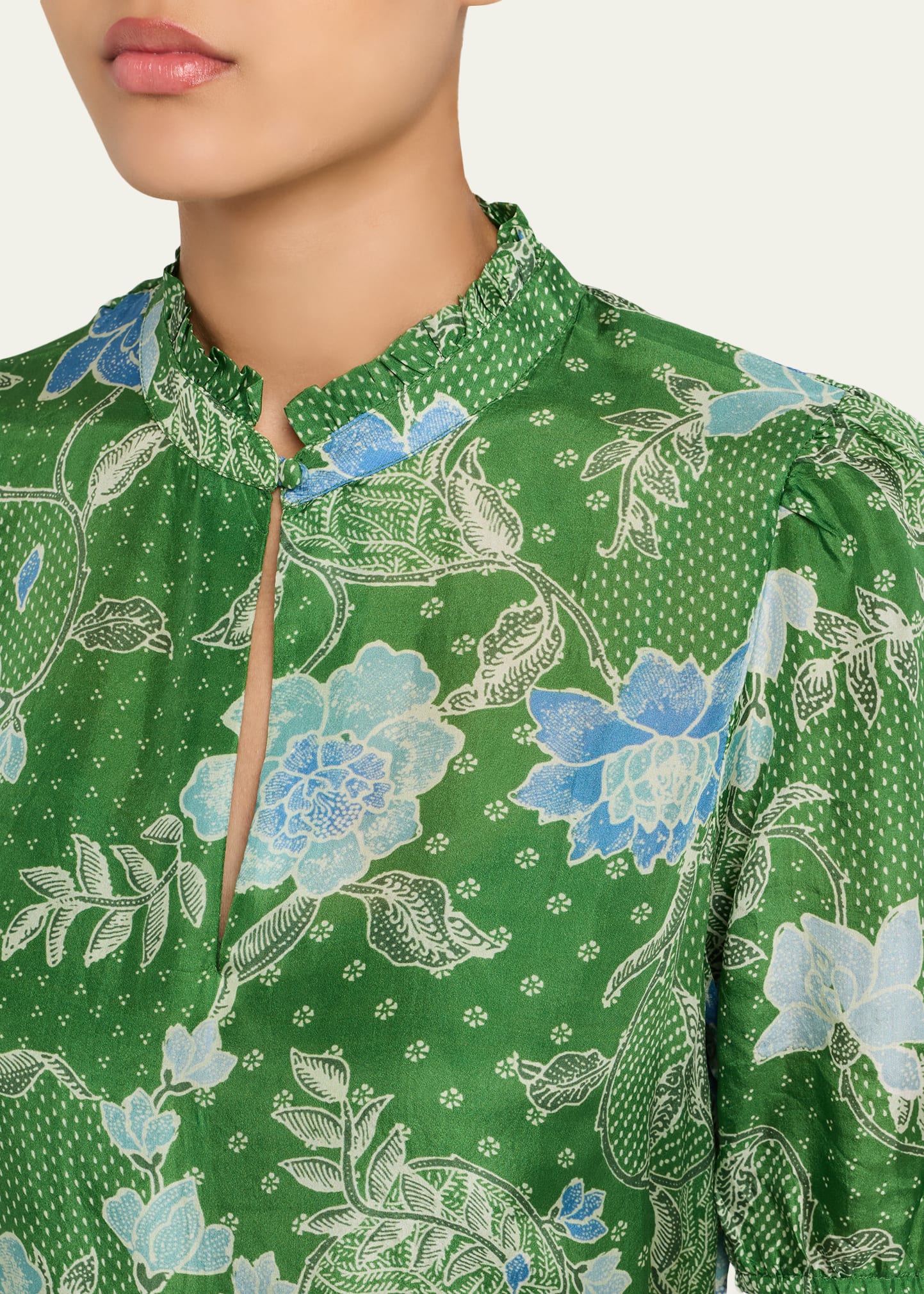 • Stand collar with frill trim; self-cobered button closure