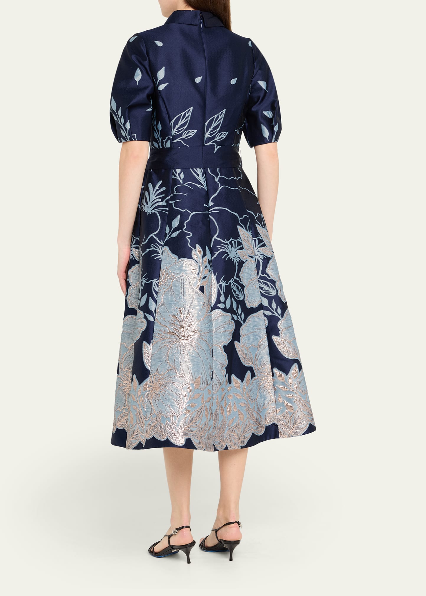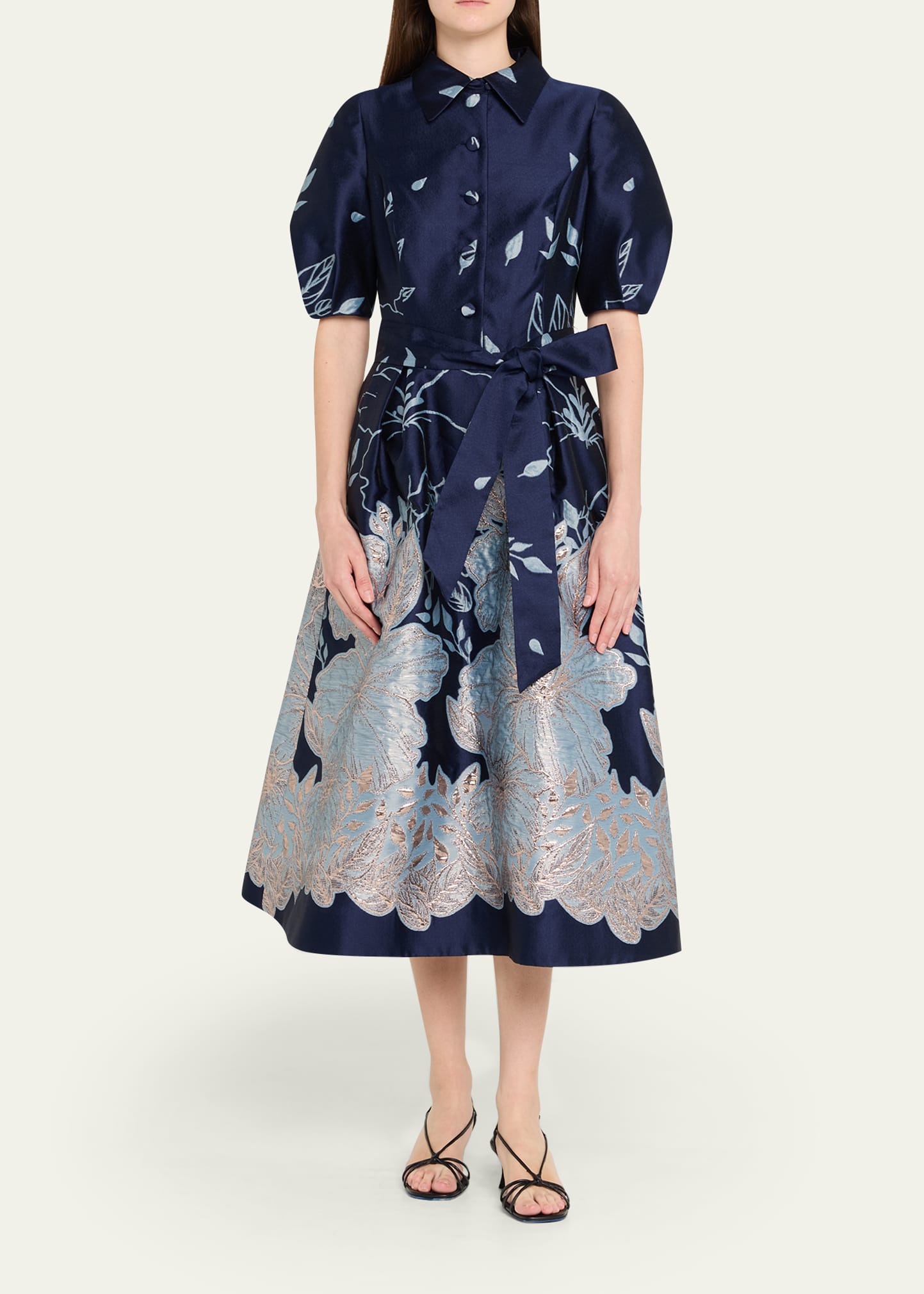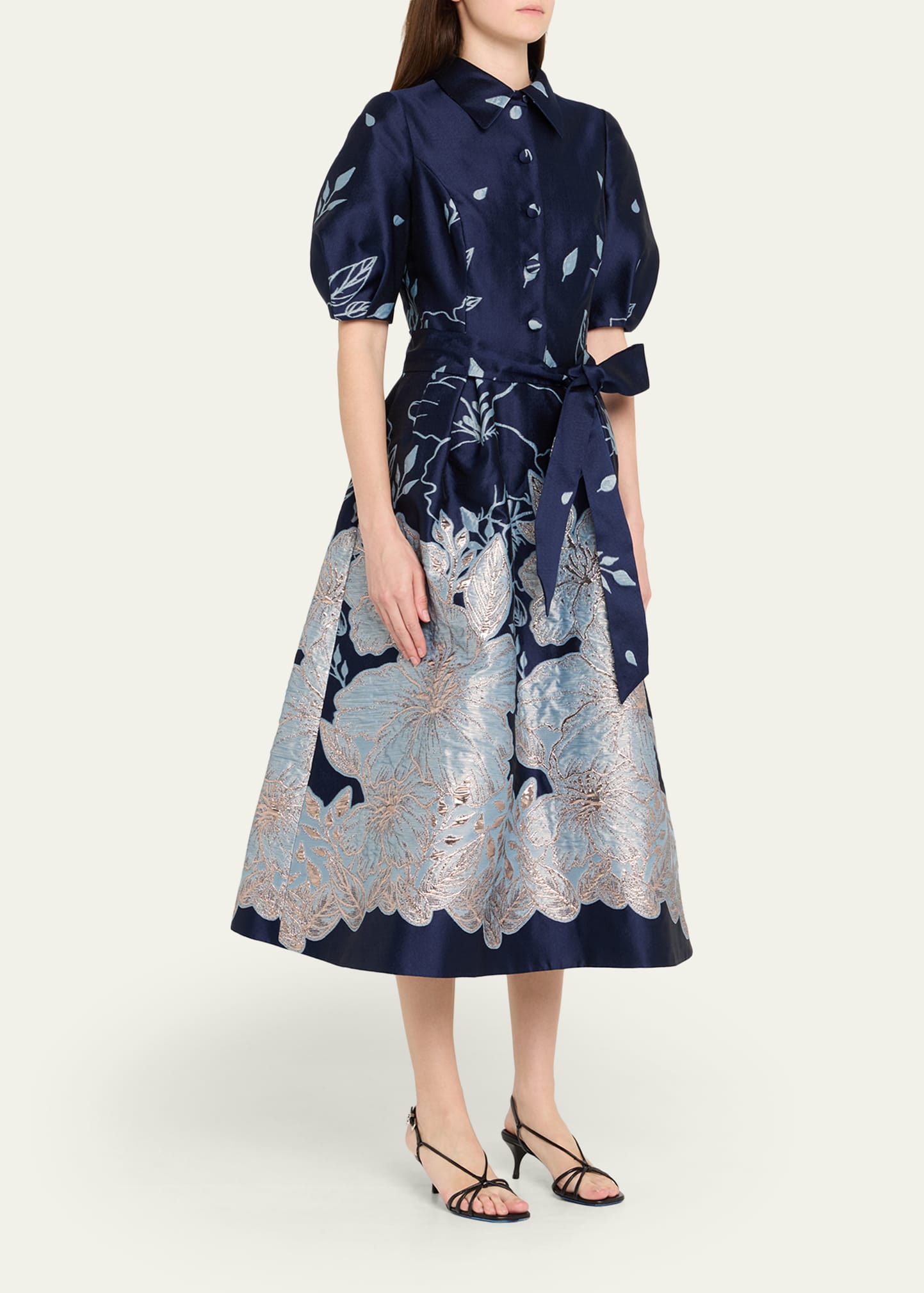 Rickie Freeman for Teri Jon Puff-Sleeve Floral Jacquard Midi Shirtdress