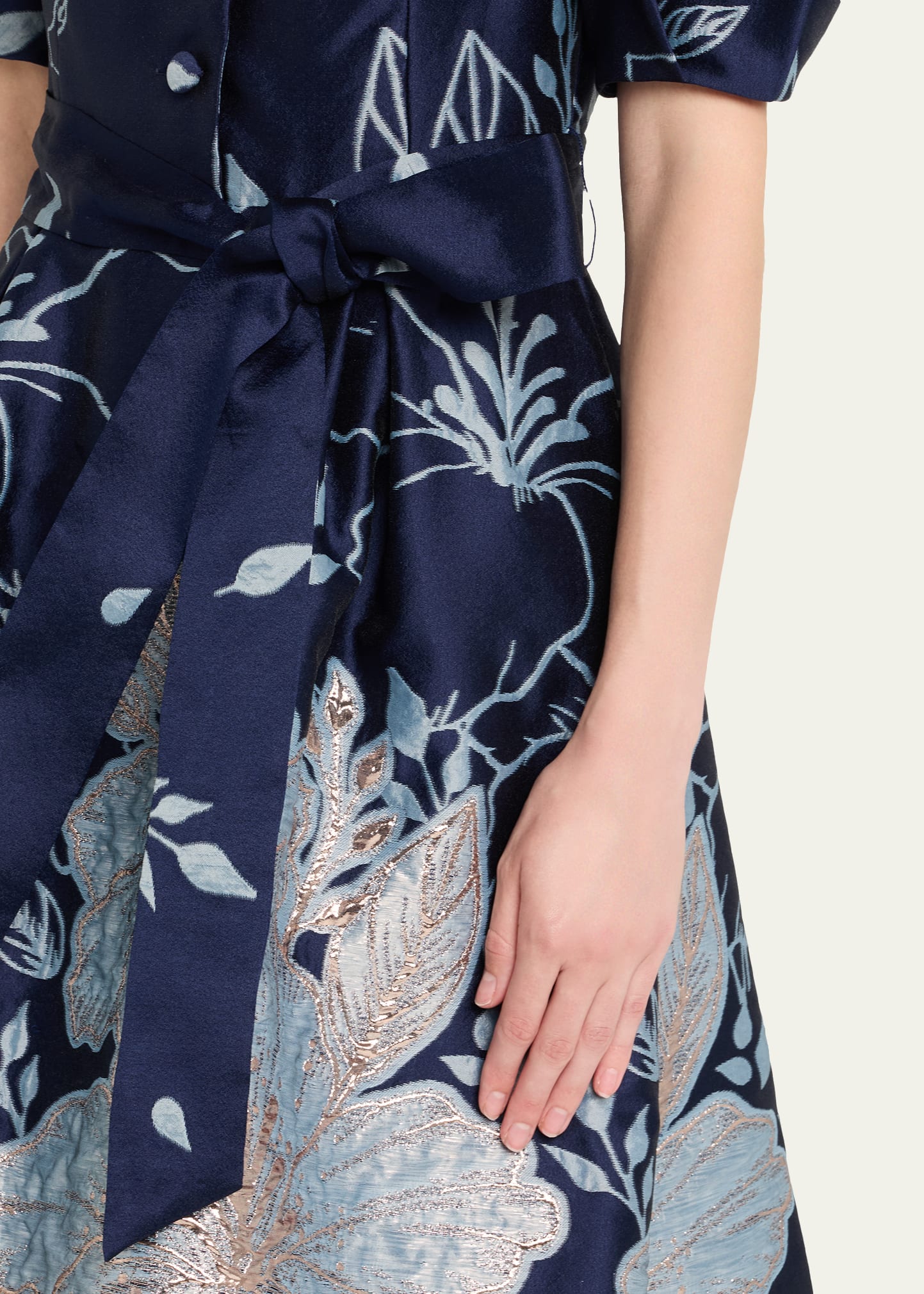• This classic midi shirtdress from Rickie Freeman for Teri Jon shimmers in metallic floral jacquard, the structured skirt adding a perfect figure-flattering flare