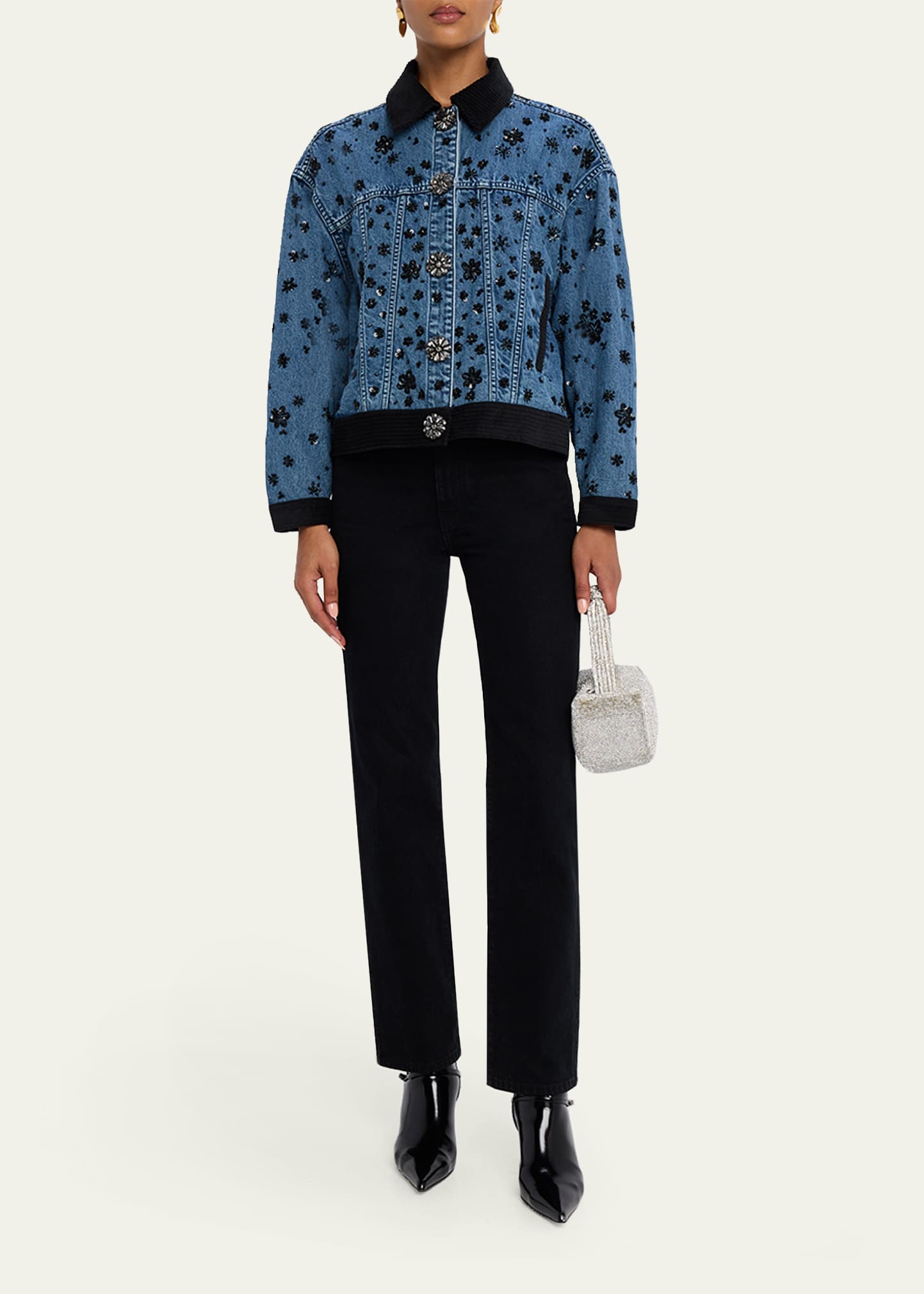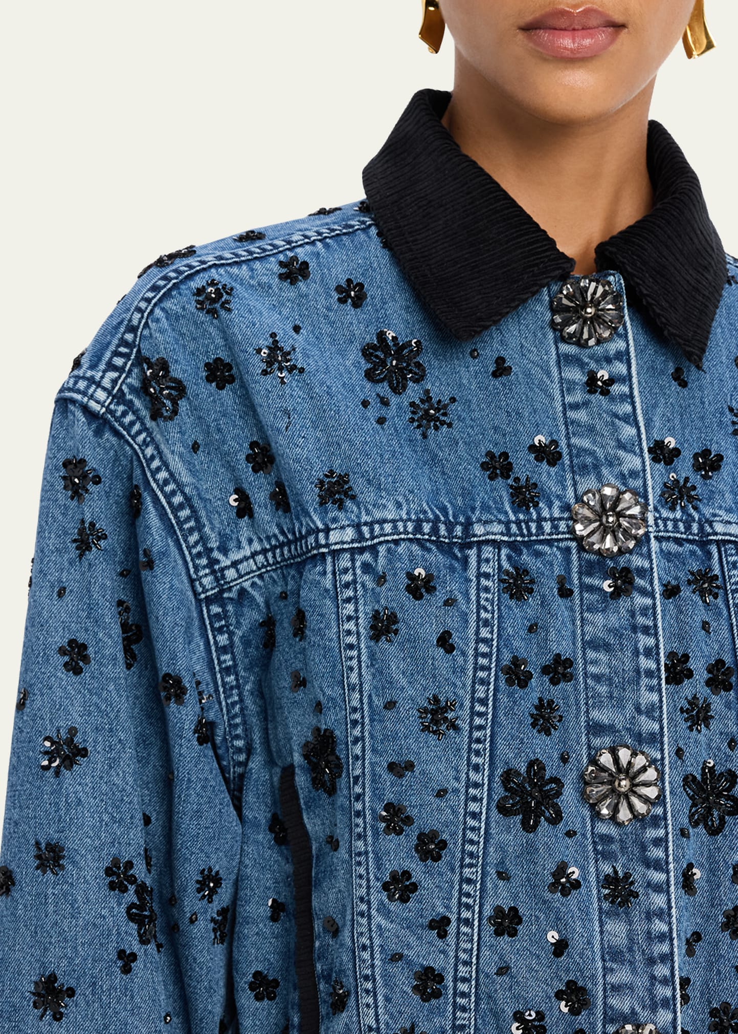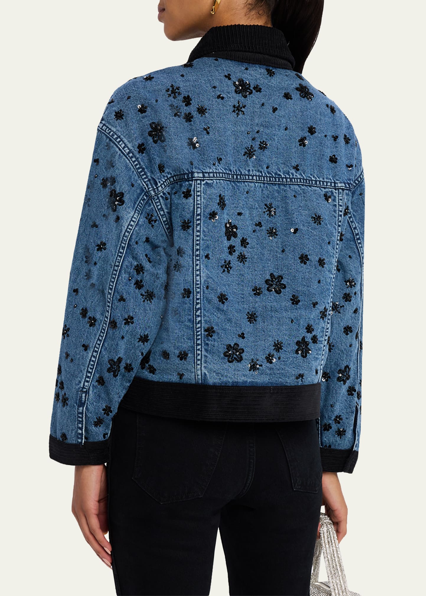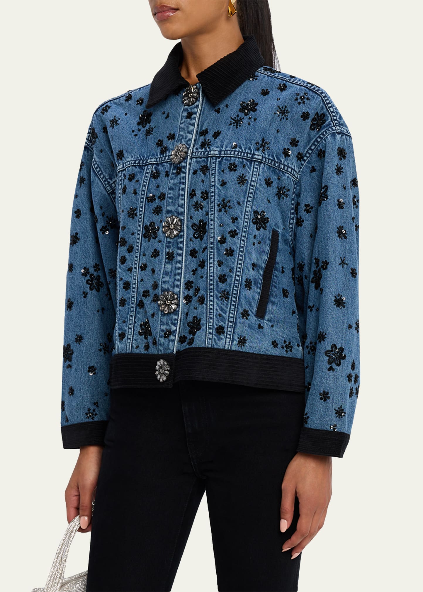 • Floral embroidery, sequins, flower jewelry buttons, and contrasting trims add a feminine edge to the Robin denim jacket by Ramy Brook