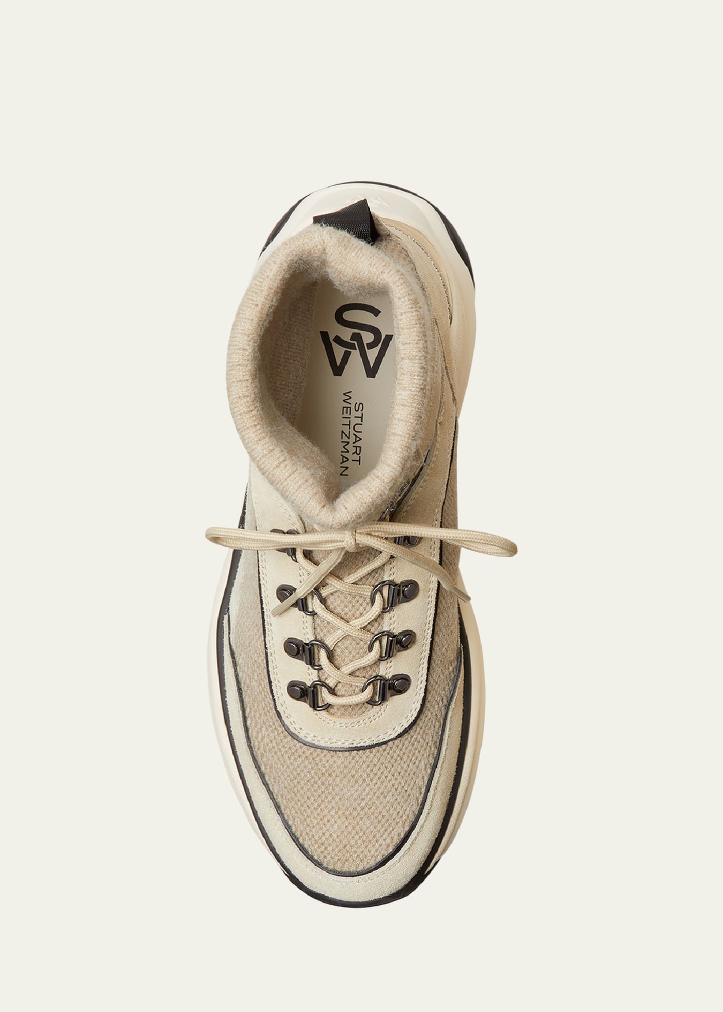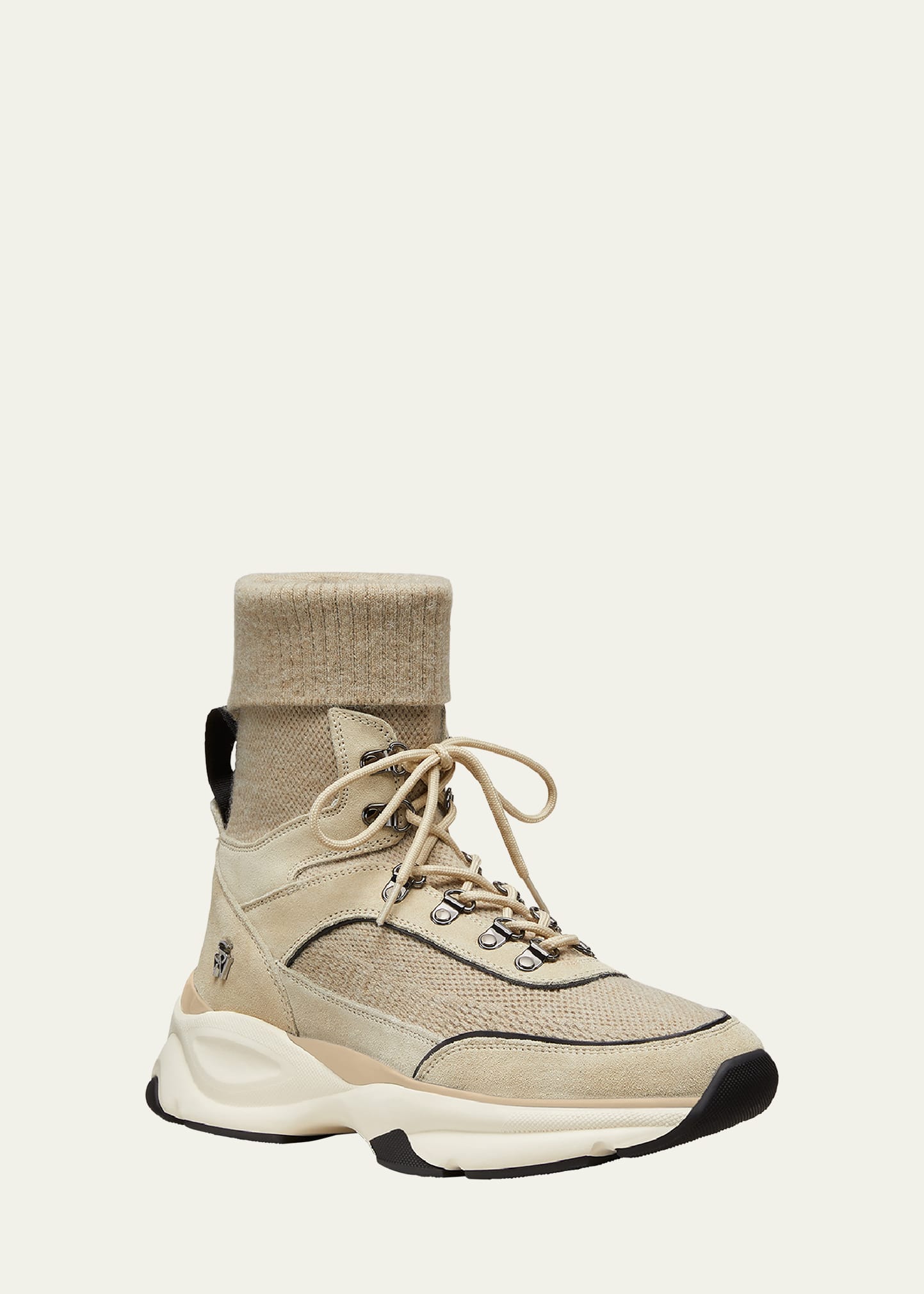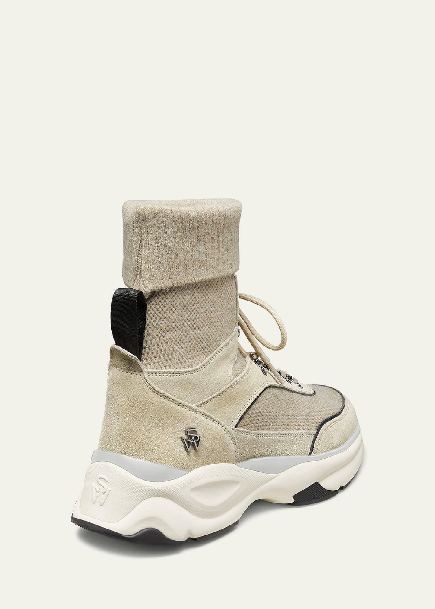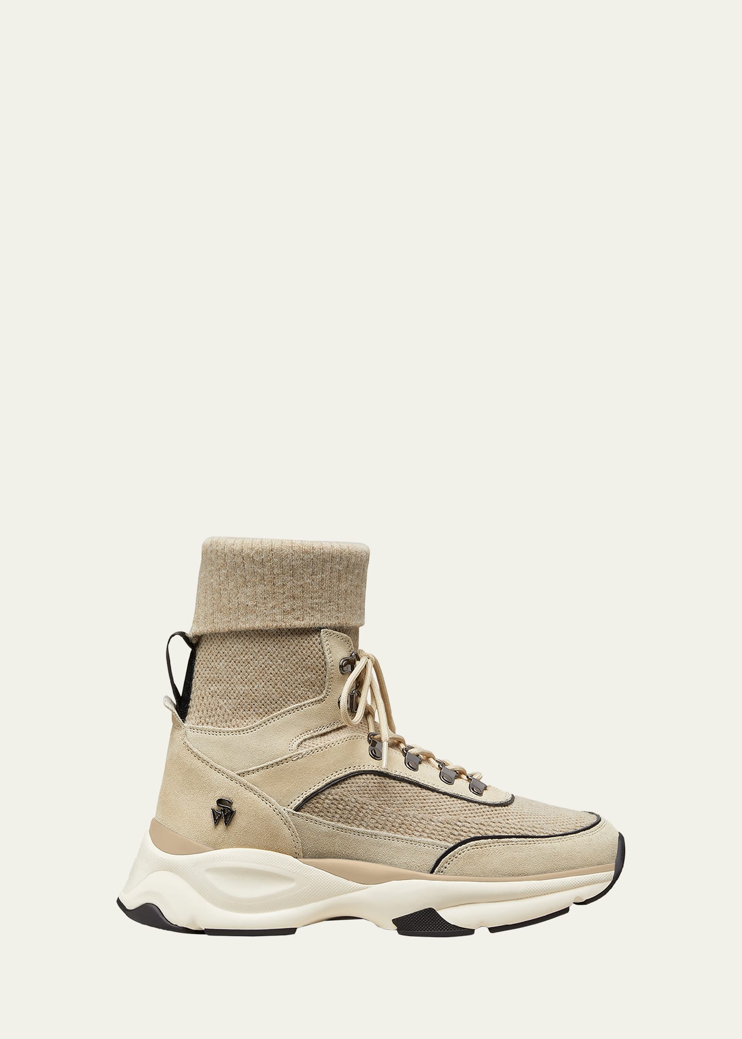 • Stuart Weitzman "SW" high-top hiker trainer sneakers in calf leather, goat leather, and cashmere mesh fabric