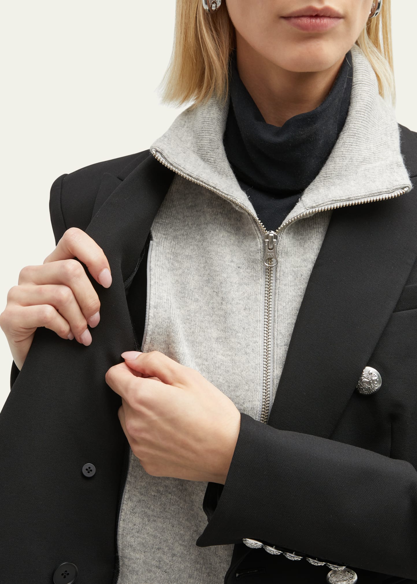 • High neckline; two-way zip front.