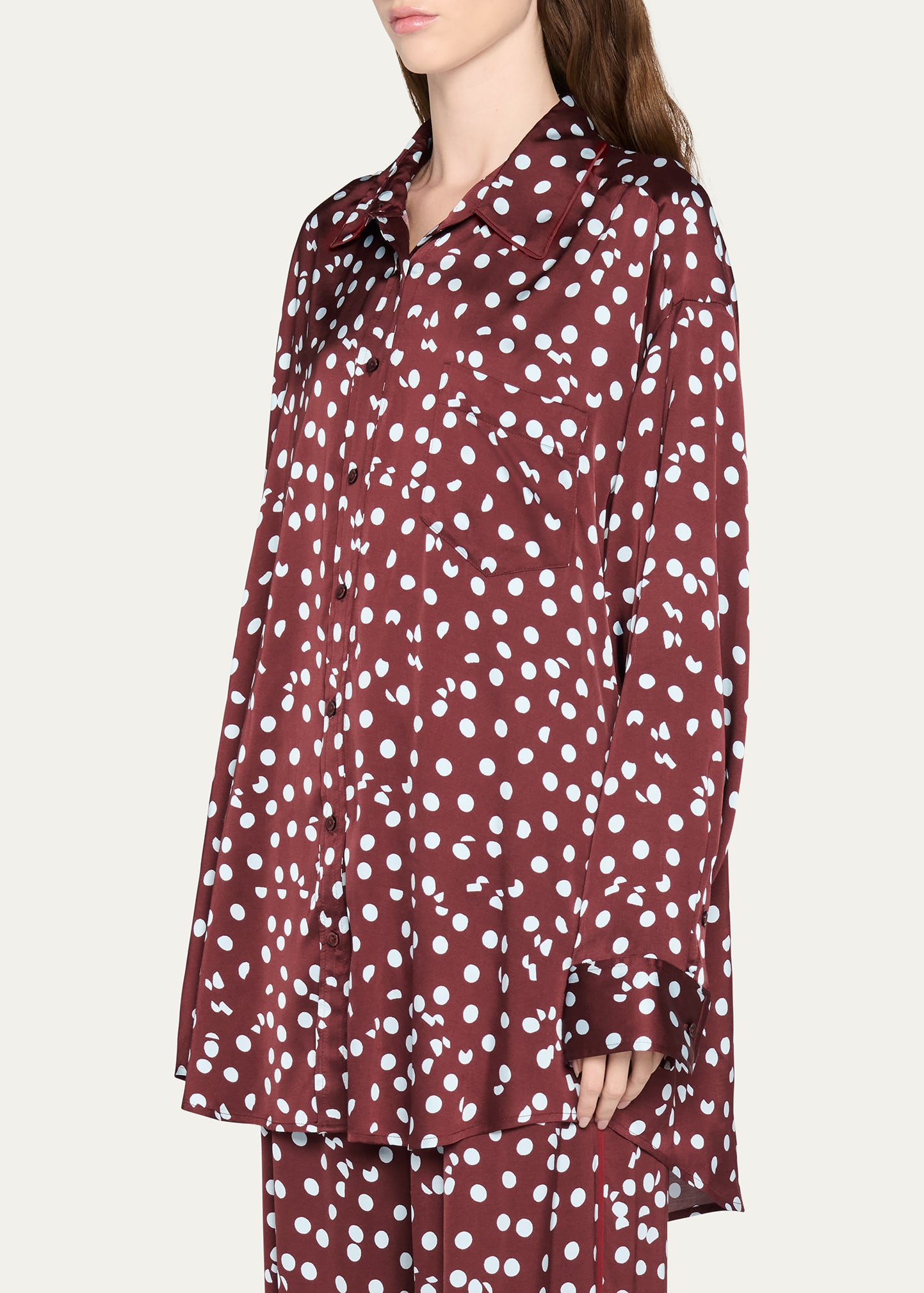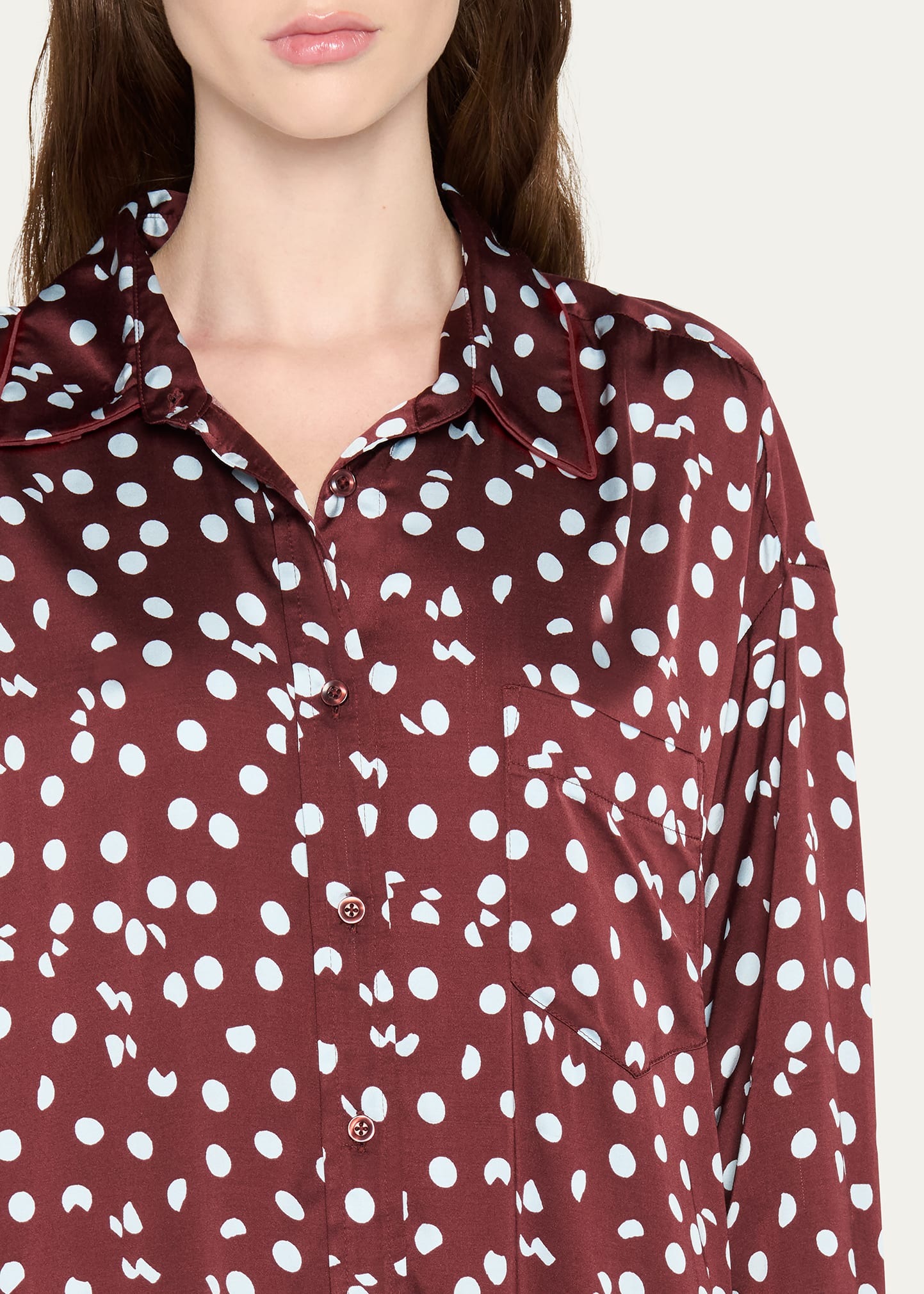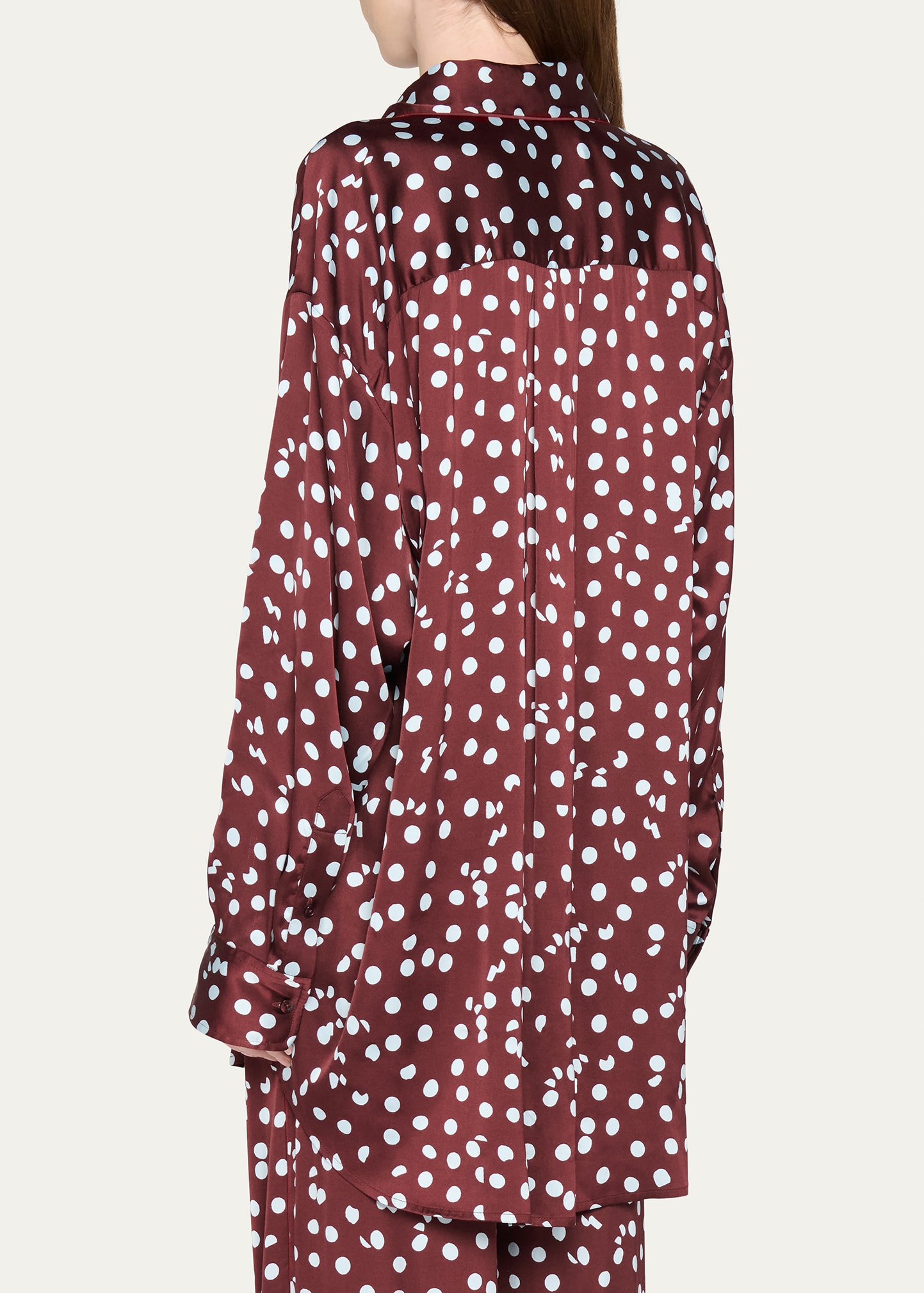 • The "Mercer" blouse from the Diane von Furstenberg x Henry Zankov collection blurs the line between loungewear and daywear. Crafted in silk with irregular polka dots, the oversized fit allows for comfortable and versatile wear.