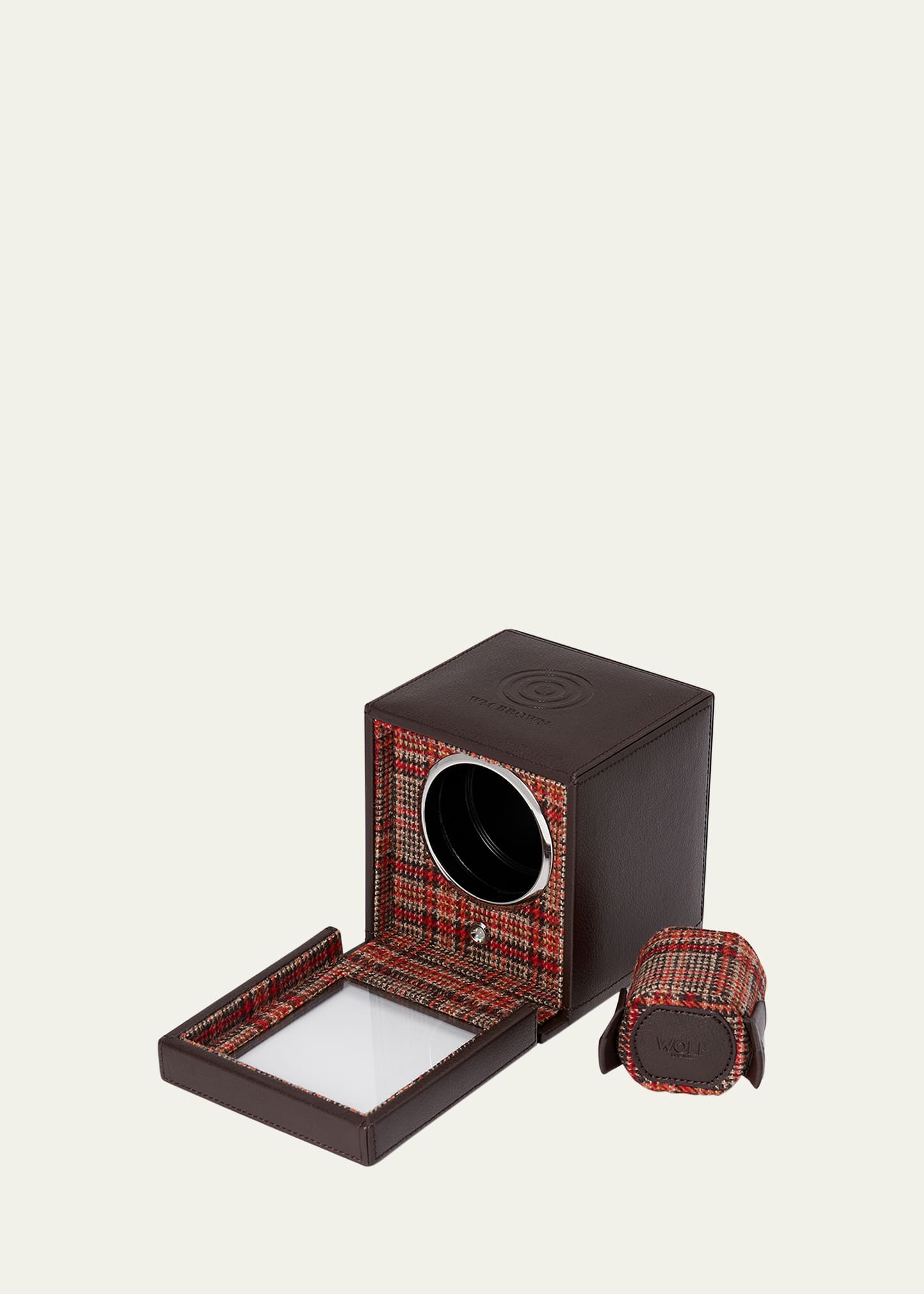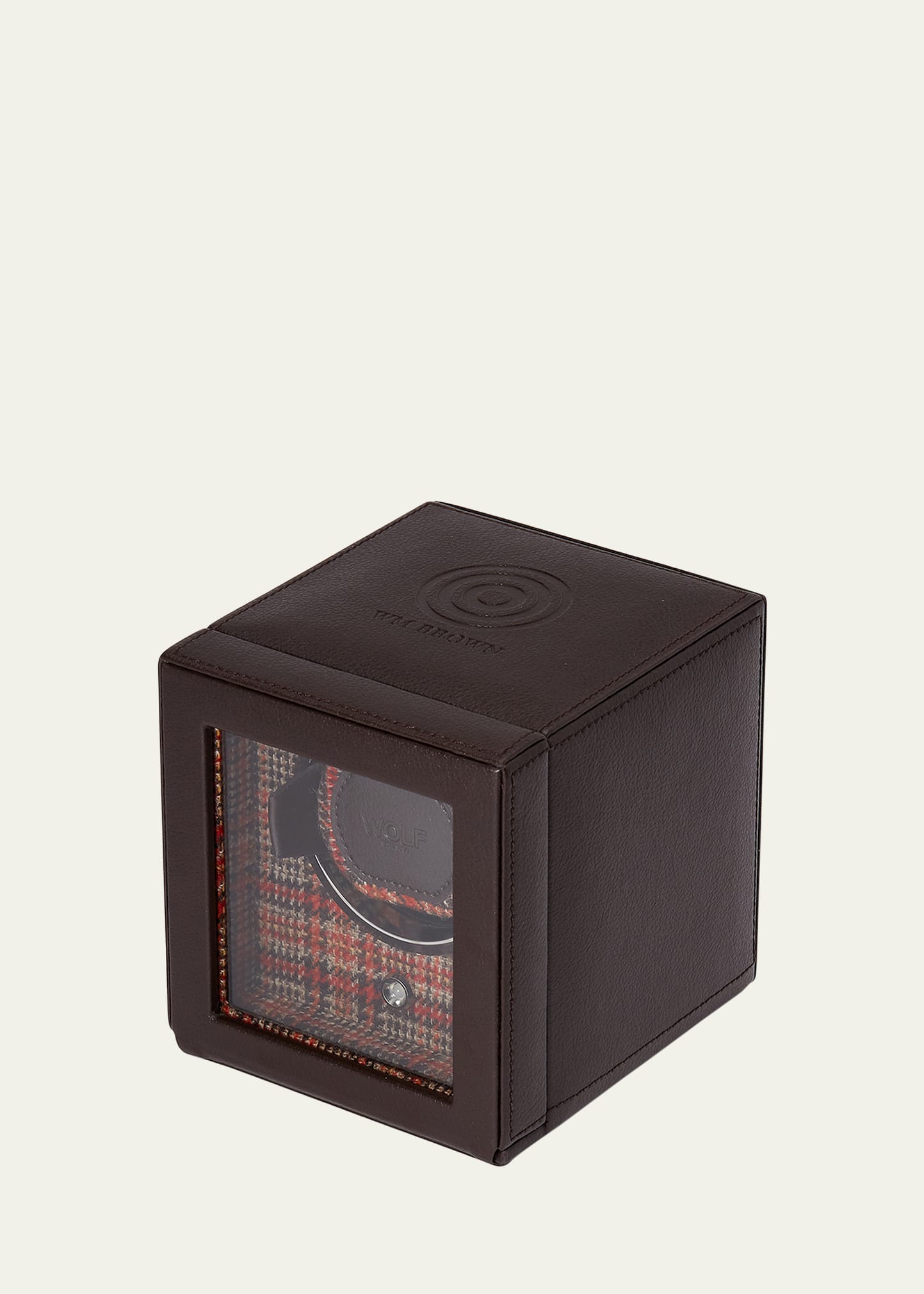 • Single watch winder is handcrafted of leather with Negroni tweed lining