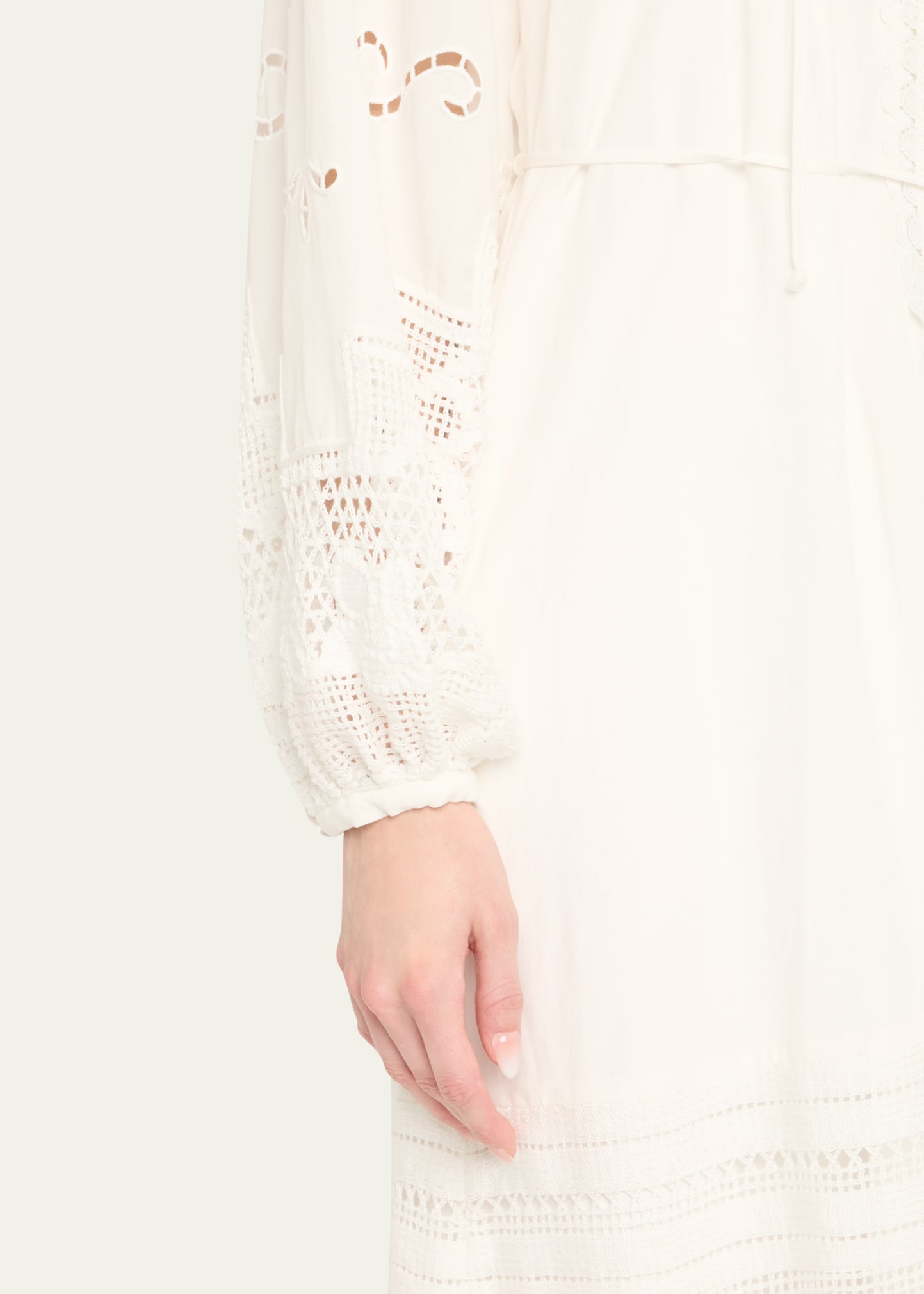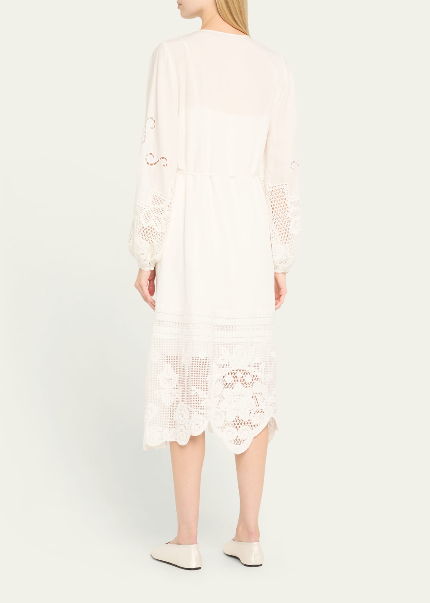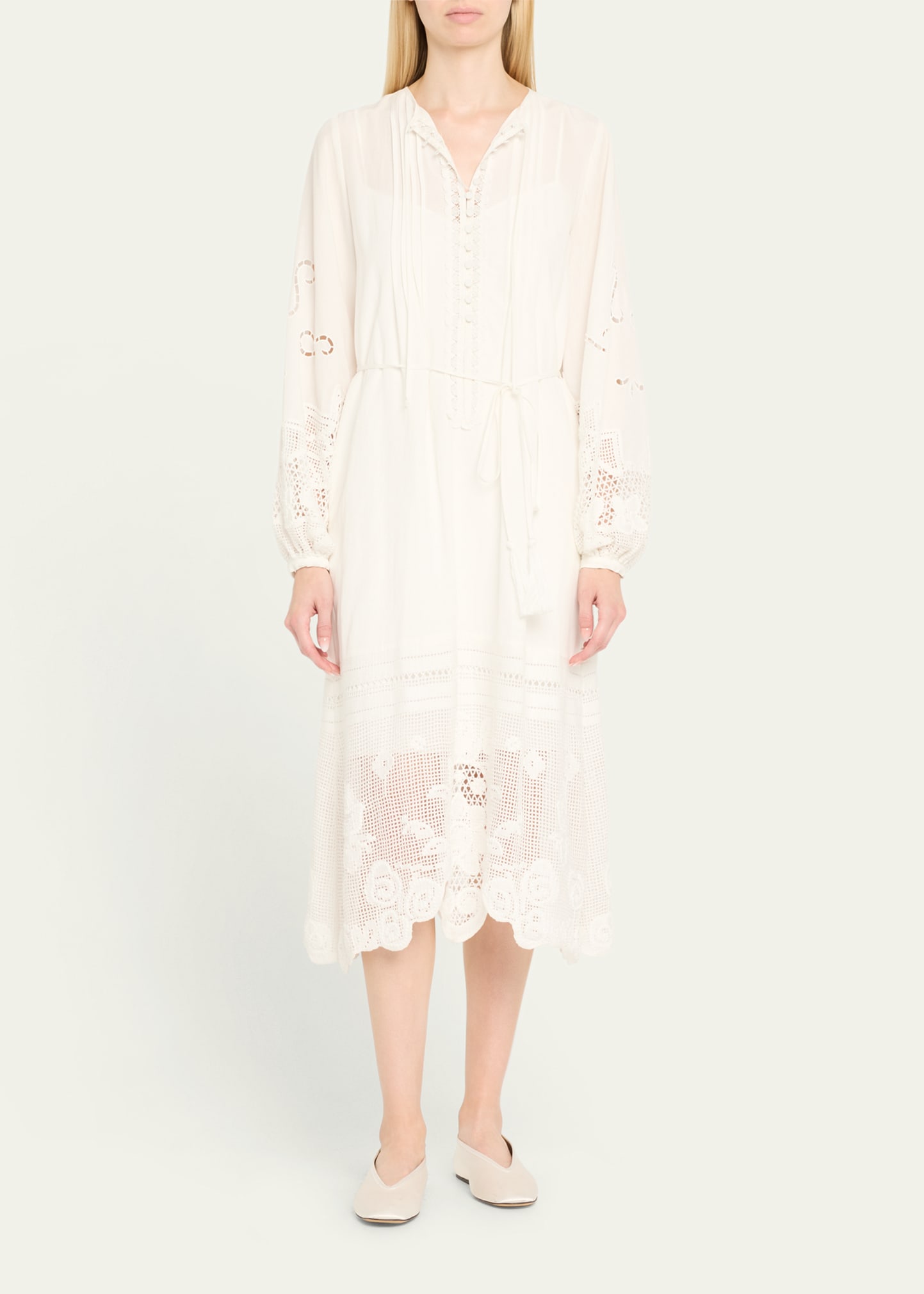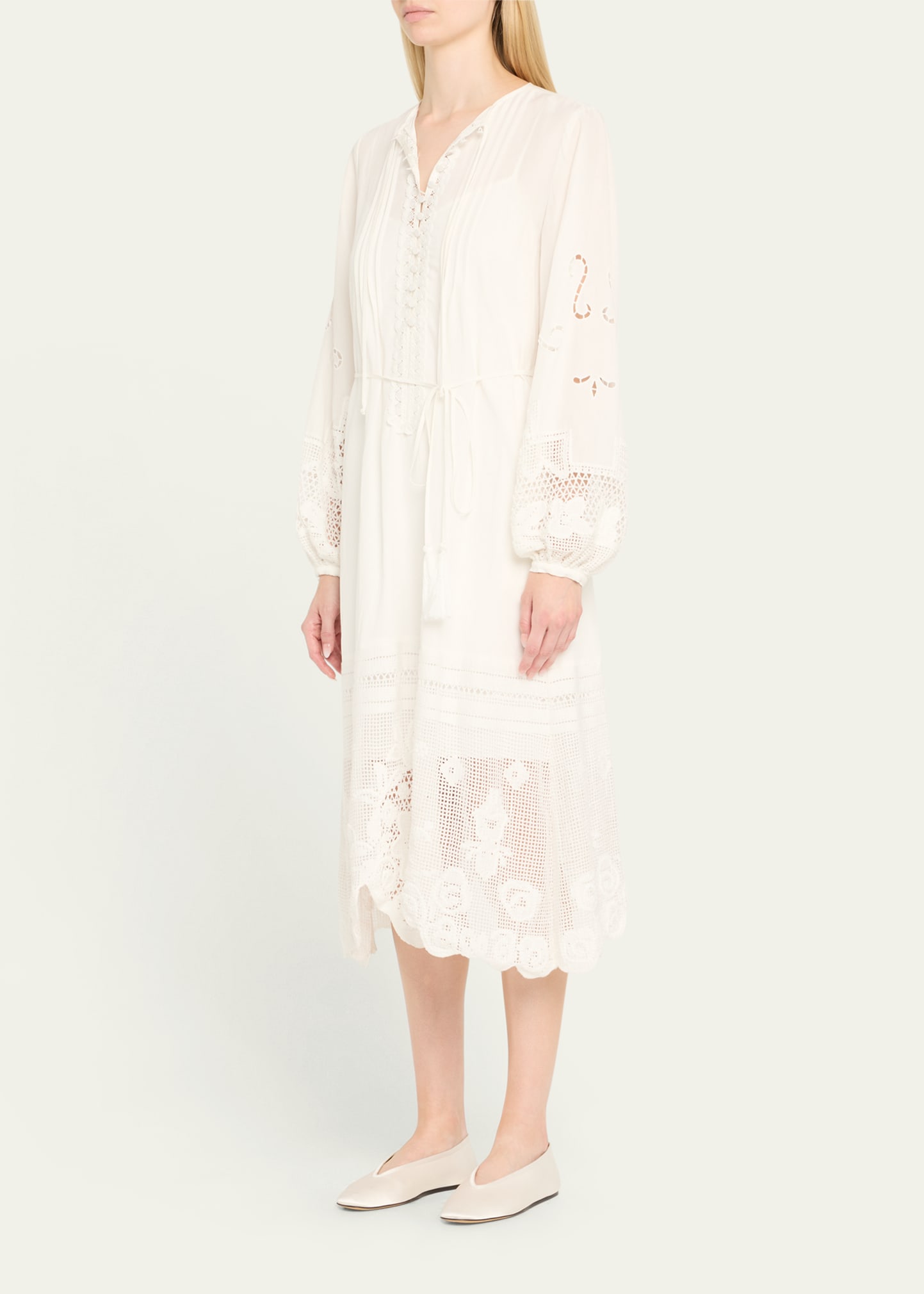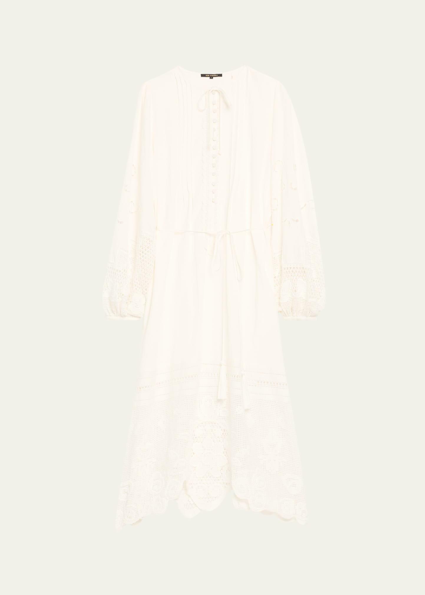 • Kobi Halperin "Yelle" midi dress elevated with pintucks, scalloped lace trim, and floral lace inset