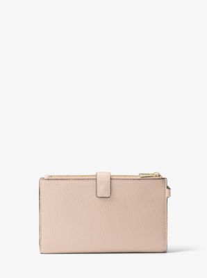 Done in a rich pebbled leather for timeless status, this sleek wallet has two zip sides that unfold to reveal a center with pockets for all the essentials, from credit cards to your smartphone. A wristlet strap perfects its versatility factor, so it can be carried alone or in a tote.