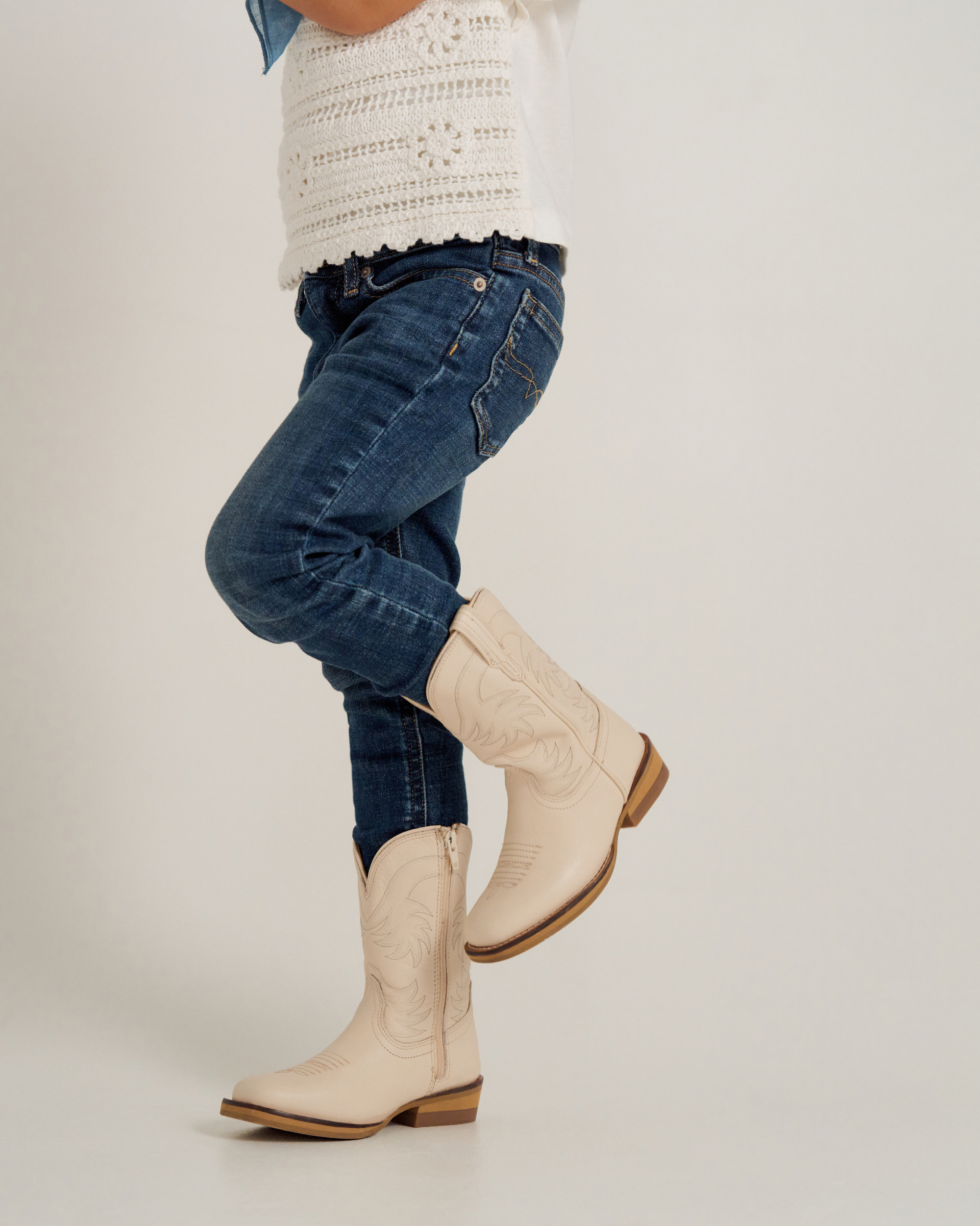 The Annie Toddler brings our best-selling cowgirl boot down to size — because style starts early. A 6” shaft with classic stitch detailing, sturdy square toe, and 1 1⁄4” rubber heel make it every bit the icon, just scaled for smaller strides. With a genuine leather collar, breathable mesh lining, and cushioned midsole, comfort keeps up with every move. Finished with an easy inside zipper and durable rubber outsole — it’s a fashion-forward first step into Western tradition.