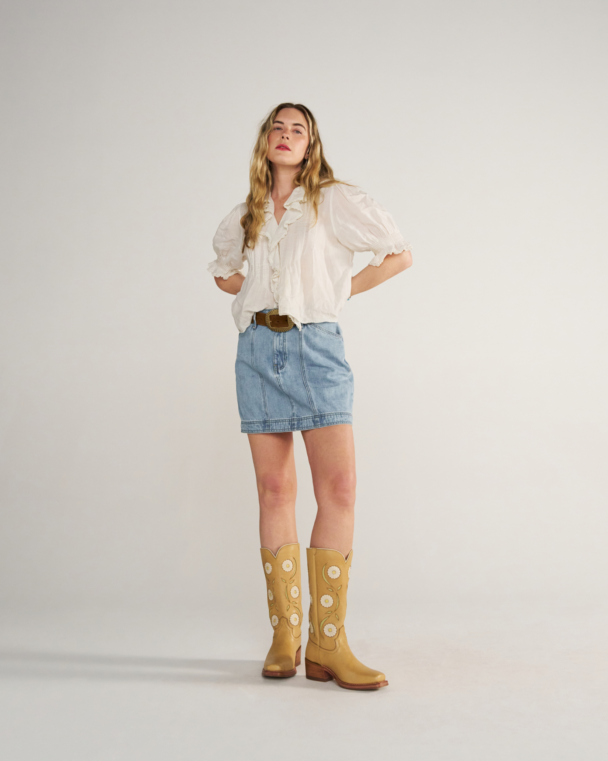 The High-Rise Denim Mini gives classic Western details a fresh, playful twist. Slanted pockets, front and back seam detailing, and a signature Western back yoke nod to heritage style — making it a piece that’s effortlessly bold and ready for anything. Pair with tall boots to complete a look that moves from day to night with ease.