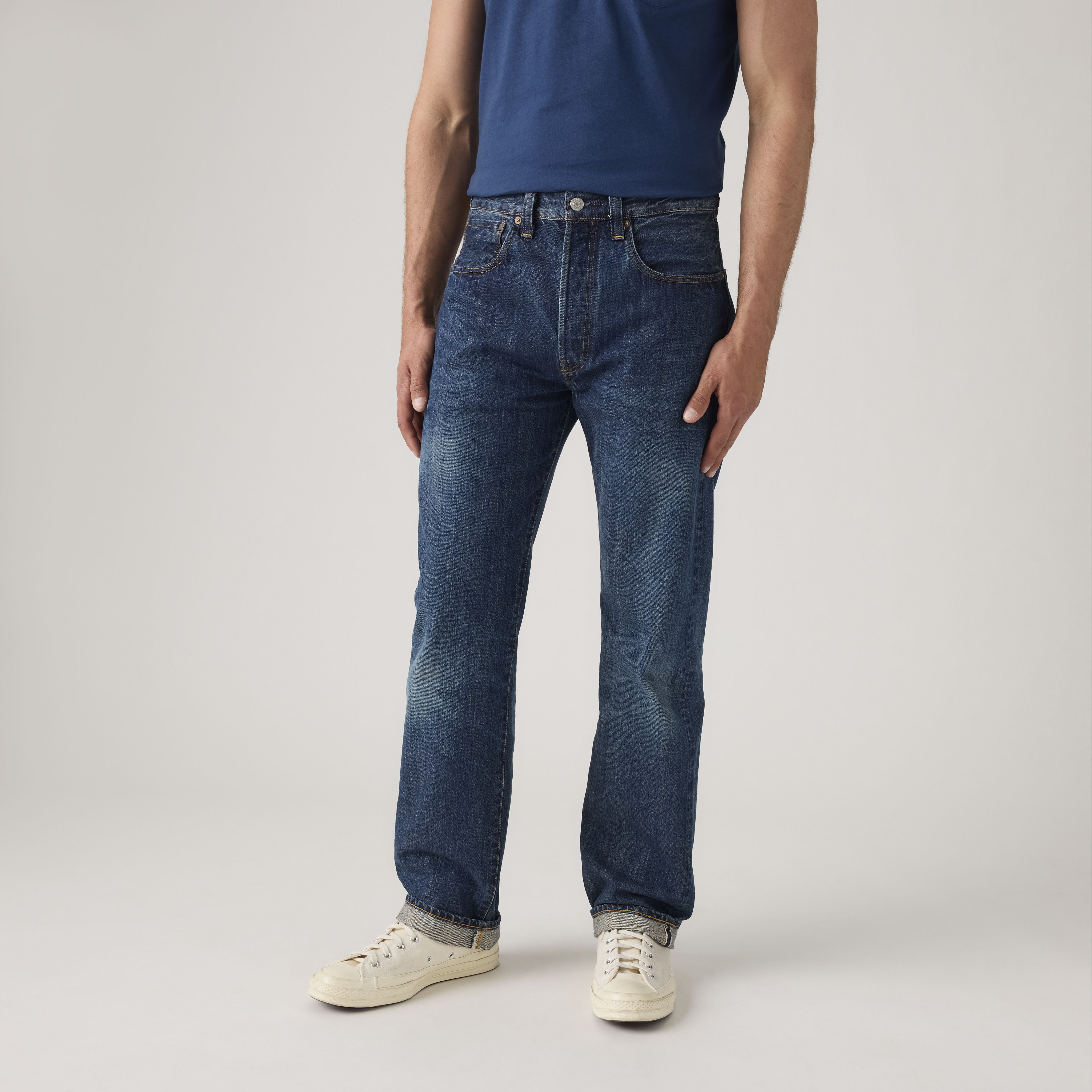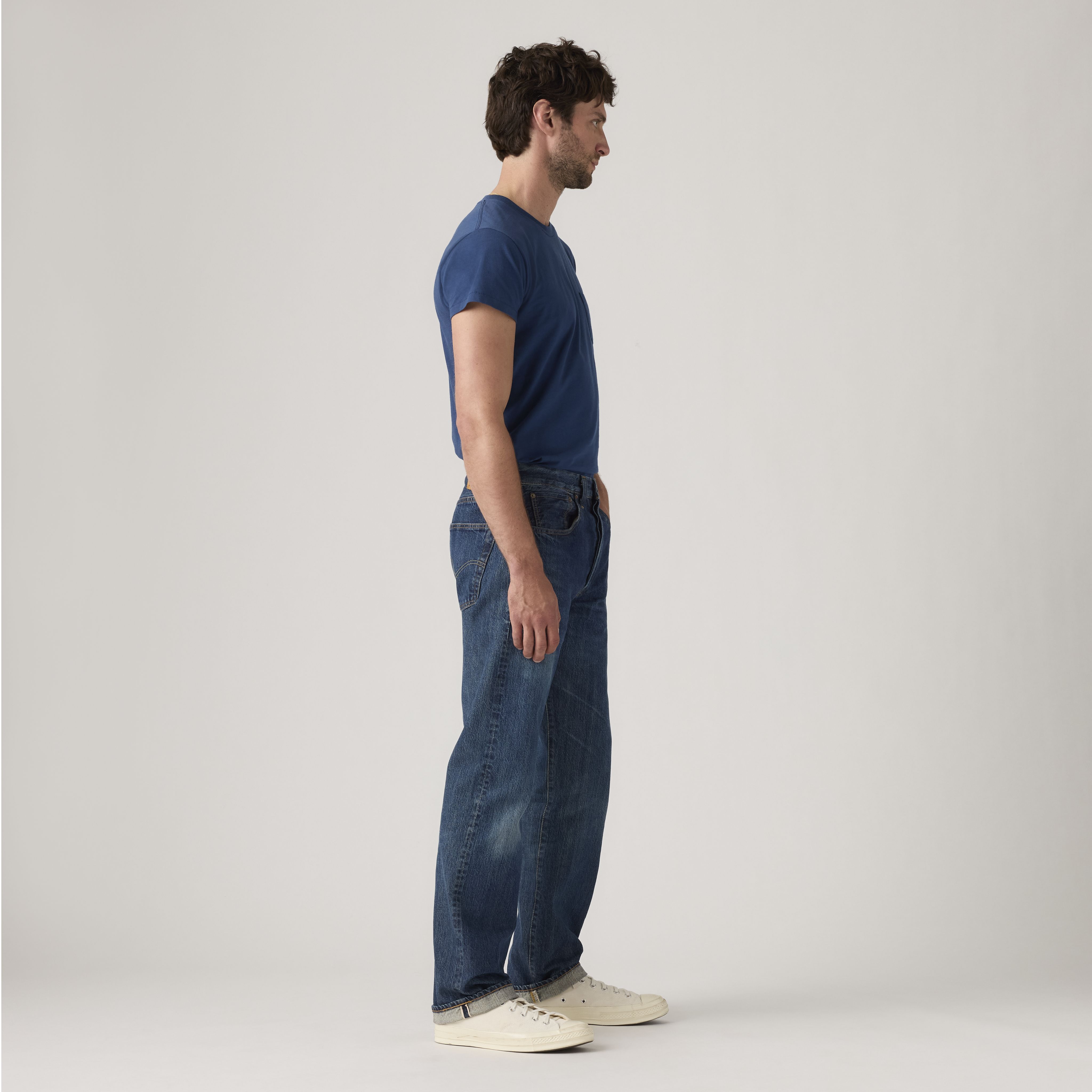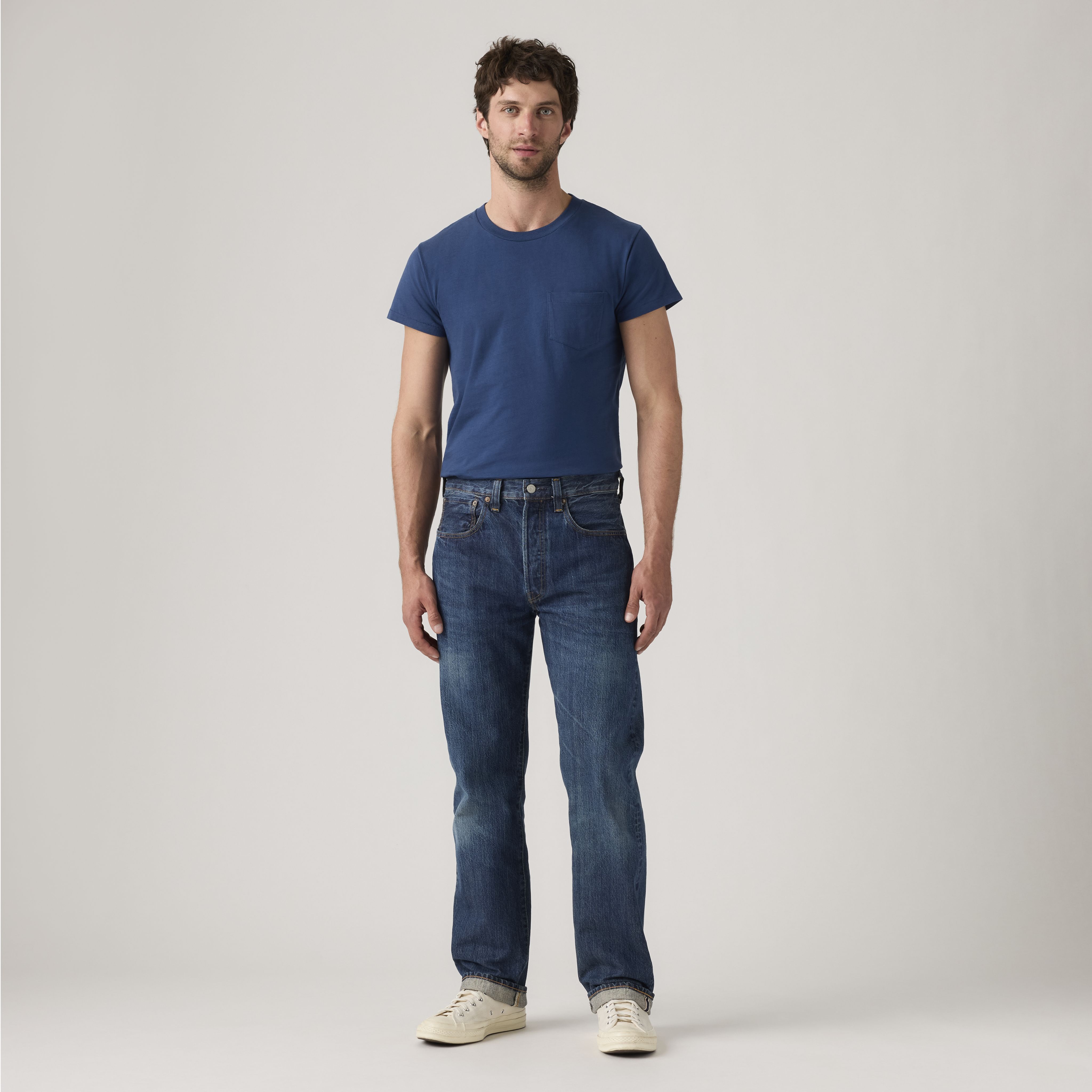 The year was 1947 and although the war had ended, the nation was much changed—and so were our 501® jeans. The end of rations allowed for the return of some familiar 501® features, like the watch pocket rivets. But it also ushered in some updates in response to the changing time and emerging middle class, like a modern, slimmer fit and the removal of extraneous details like the cinch and suspender buttons.