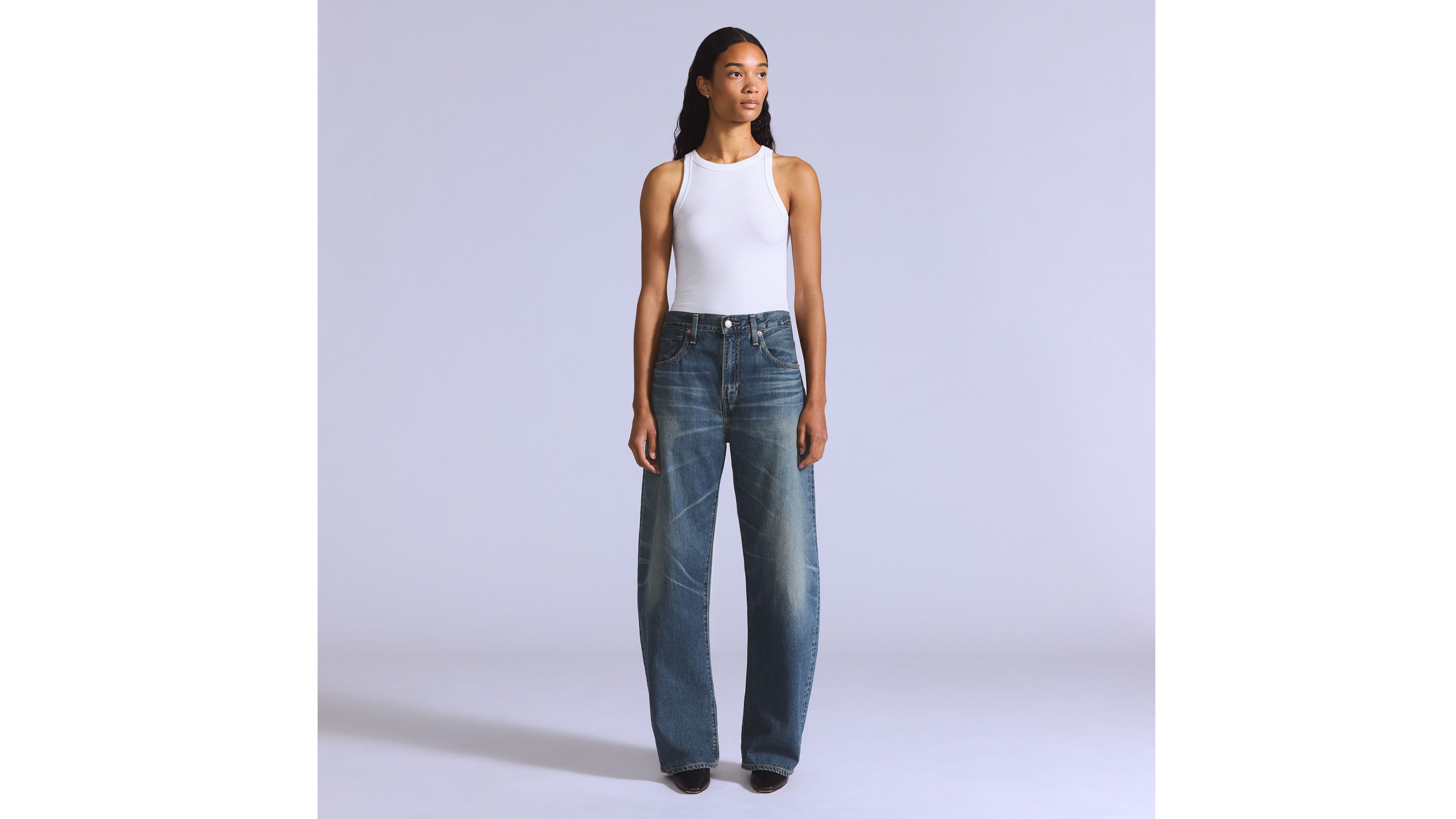 The perfectly sculpted curve. We designed our Drop Barrel jeans with a mid rise, a relaxed, slouchy fit and a barrel-shaped leg.