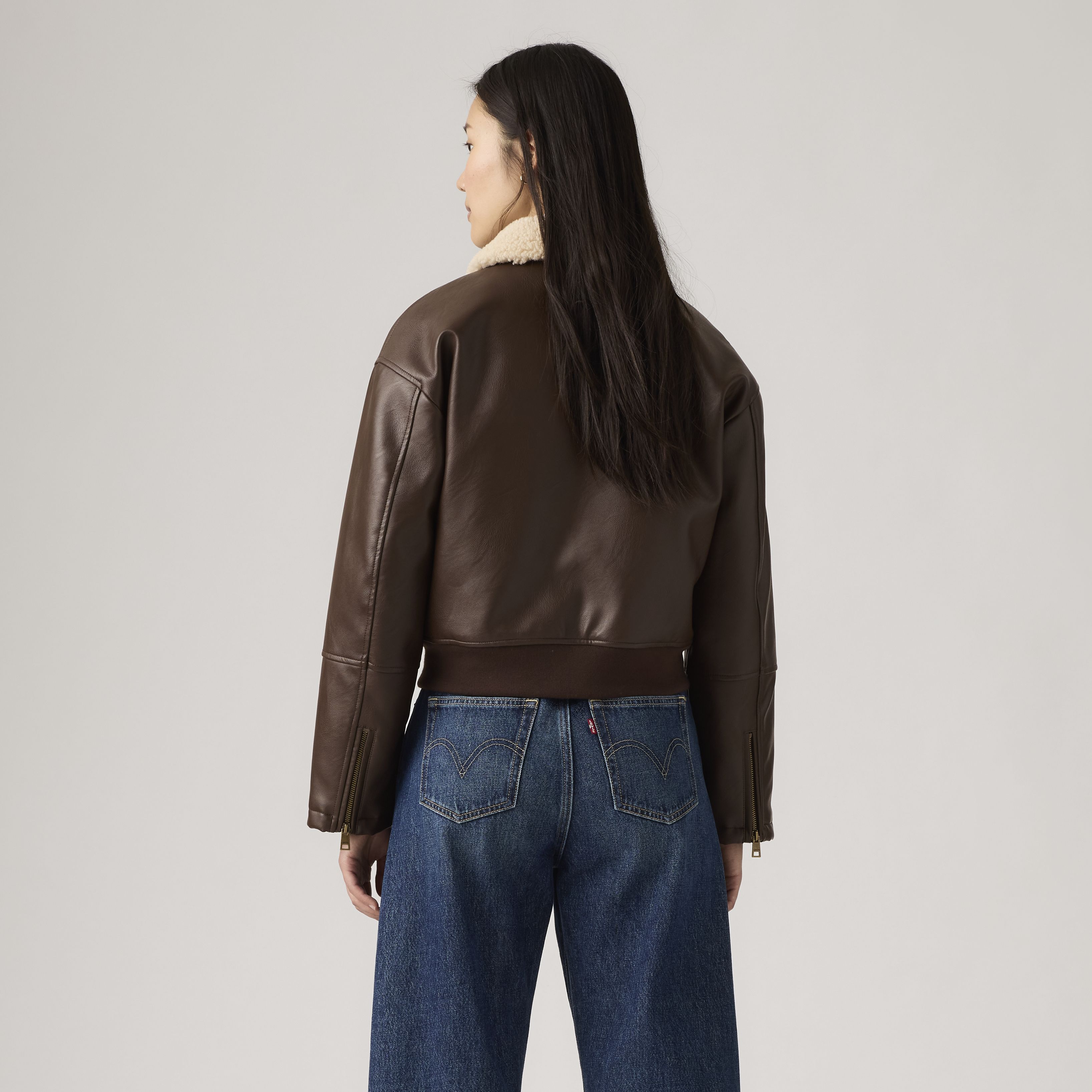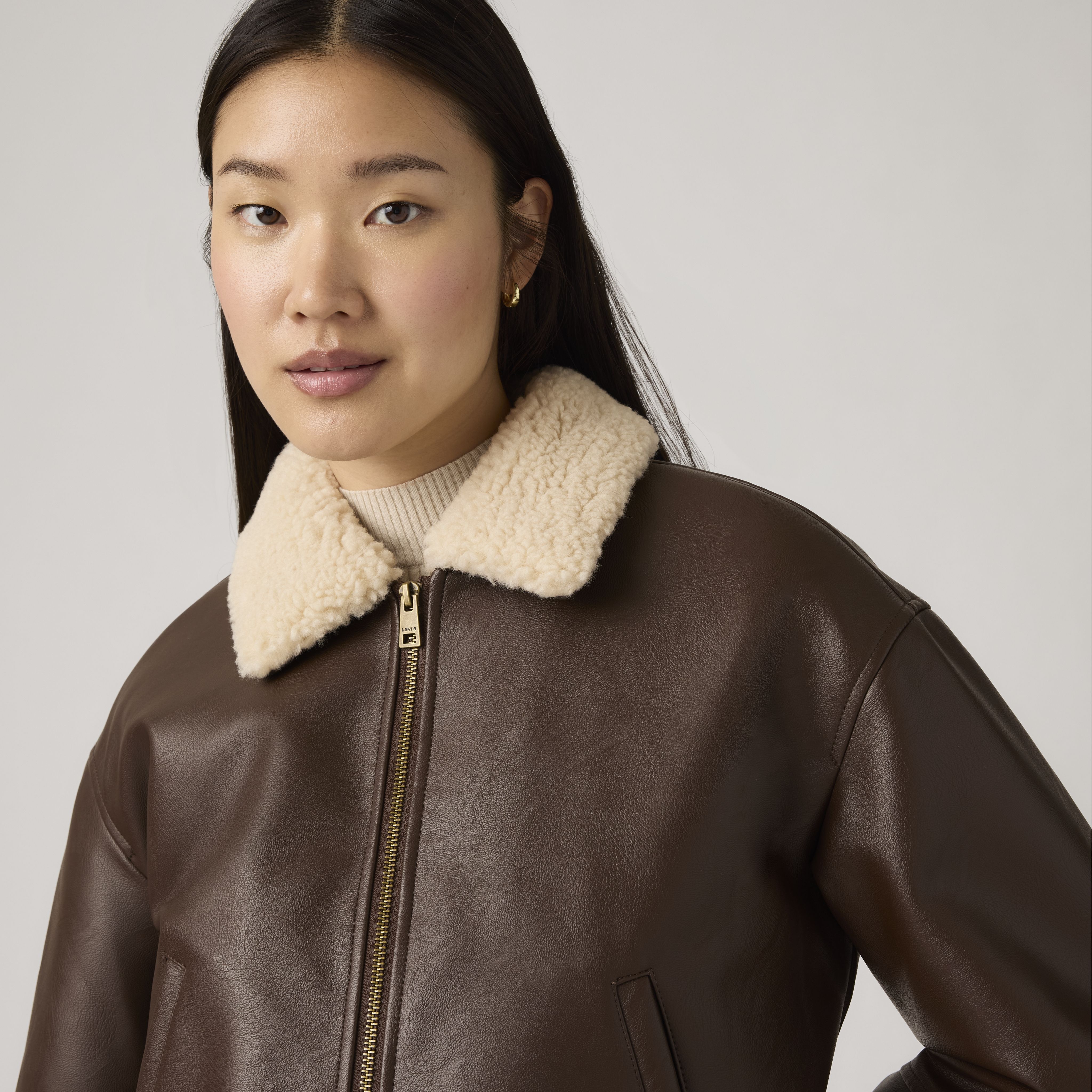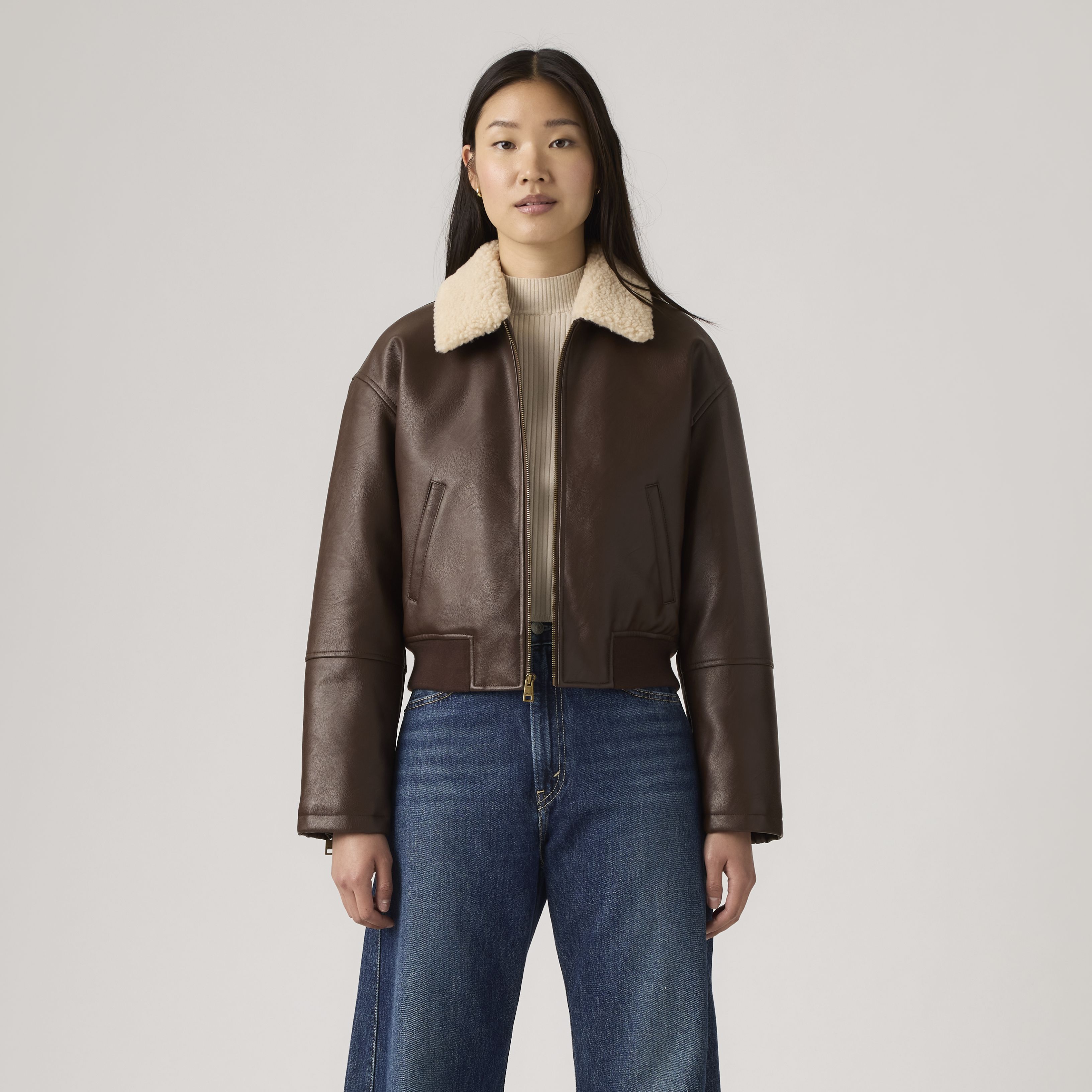 Channel timeless bomber style with a modern twist in the Levi's® Faux Leather Bomber Jacket. Crafted from textured faux leather, this jacket features a standout sherpa collar for a cozy contrast. The ribbed hem and cuffs offer a snug, flattering fit, while the full front zipper makes layering effortless. Whether you're dressing up denim or adding edge to a dress, this piece brings warmth, attitude, and iconic Levi's® style to any outfit.
