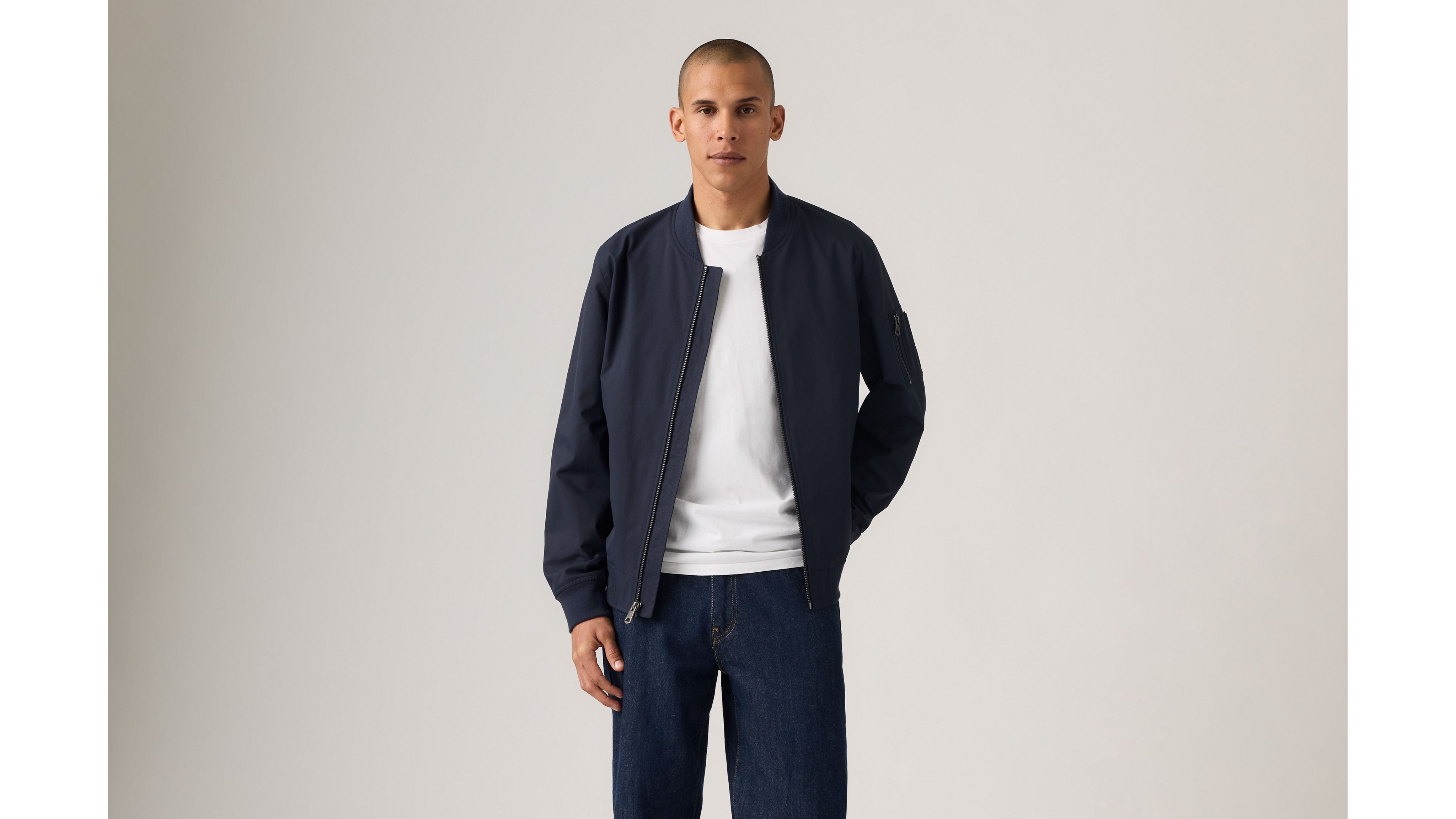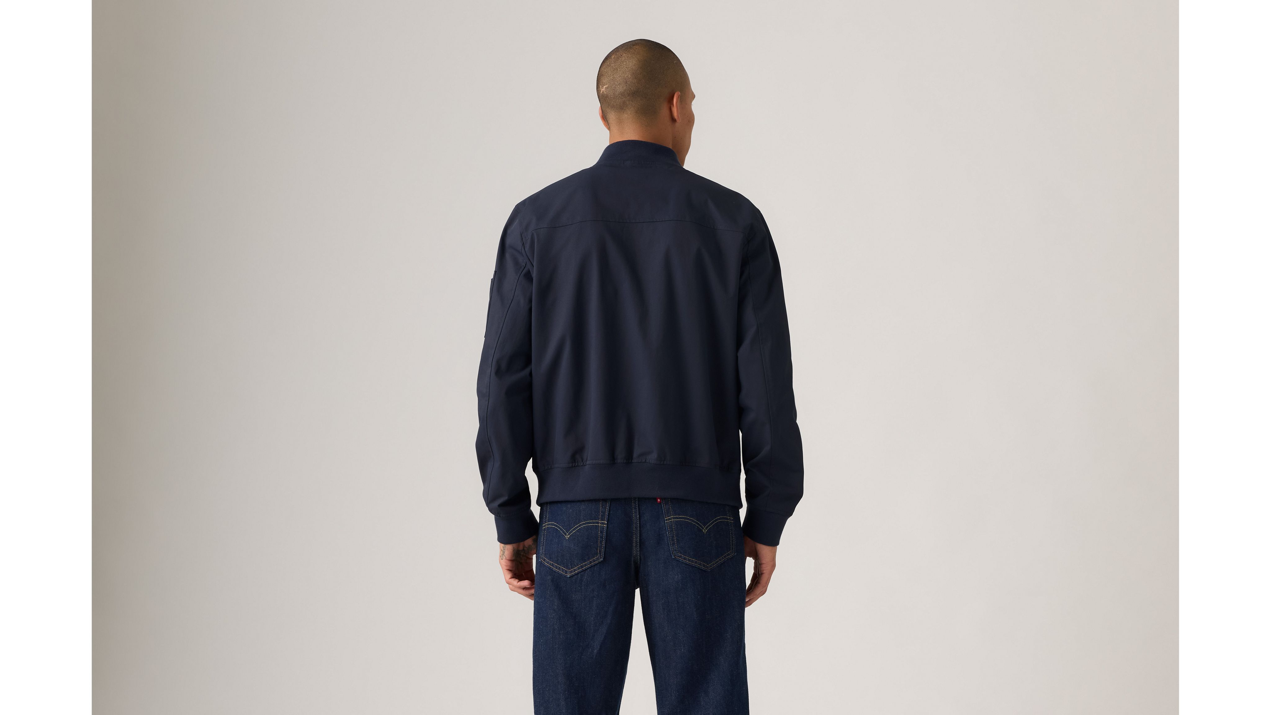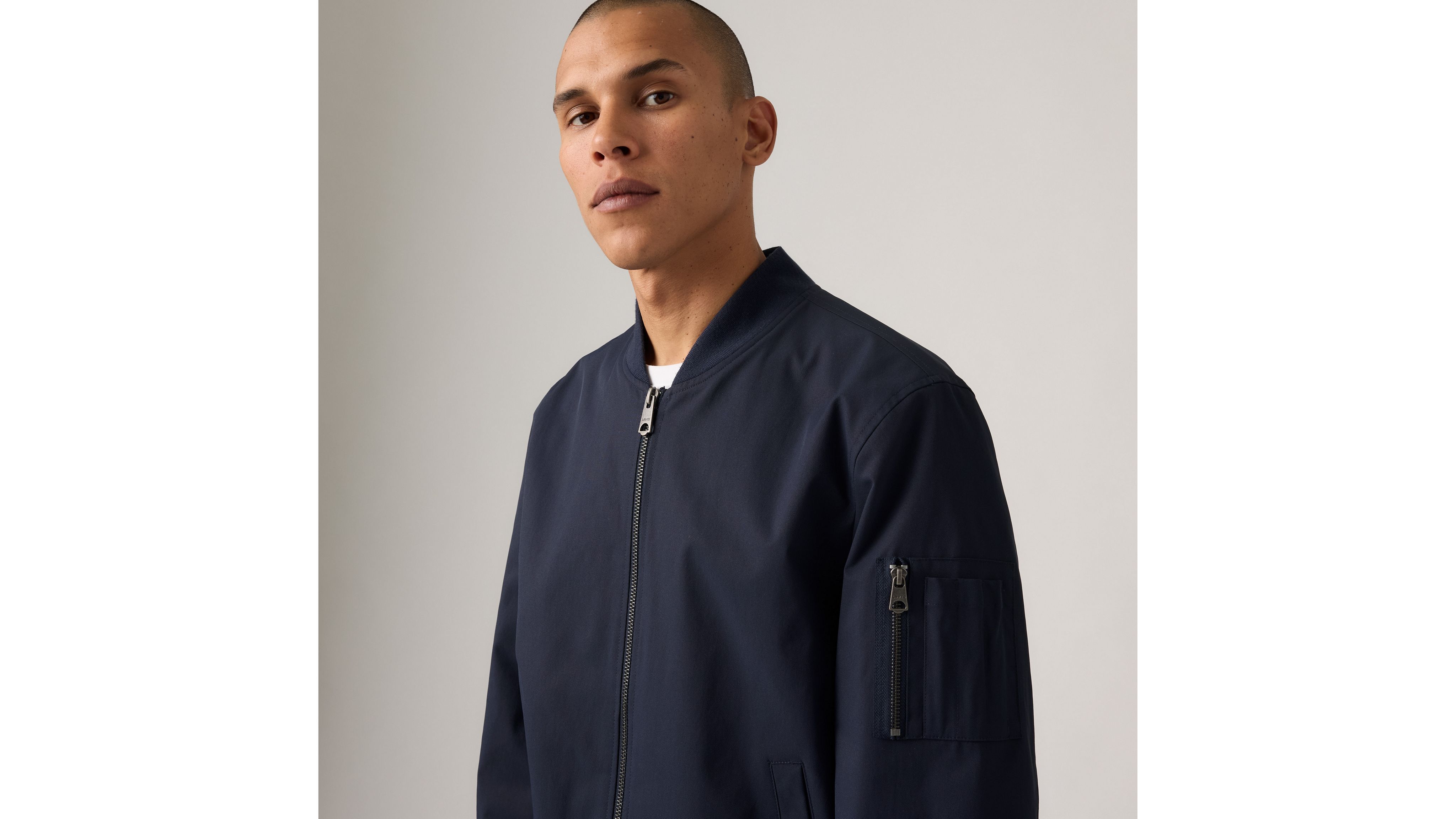 This Levi's® Men's Flight Jacket showcases a sleek, structured silhouette with a full front zipper closure and two side pockets for functionality. The jacket features a zippered utility pocket on the right sleeve, adding a touch of authentic flight-inspired style.