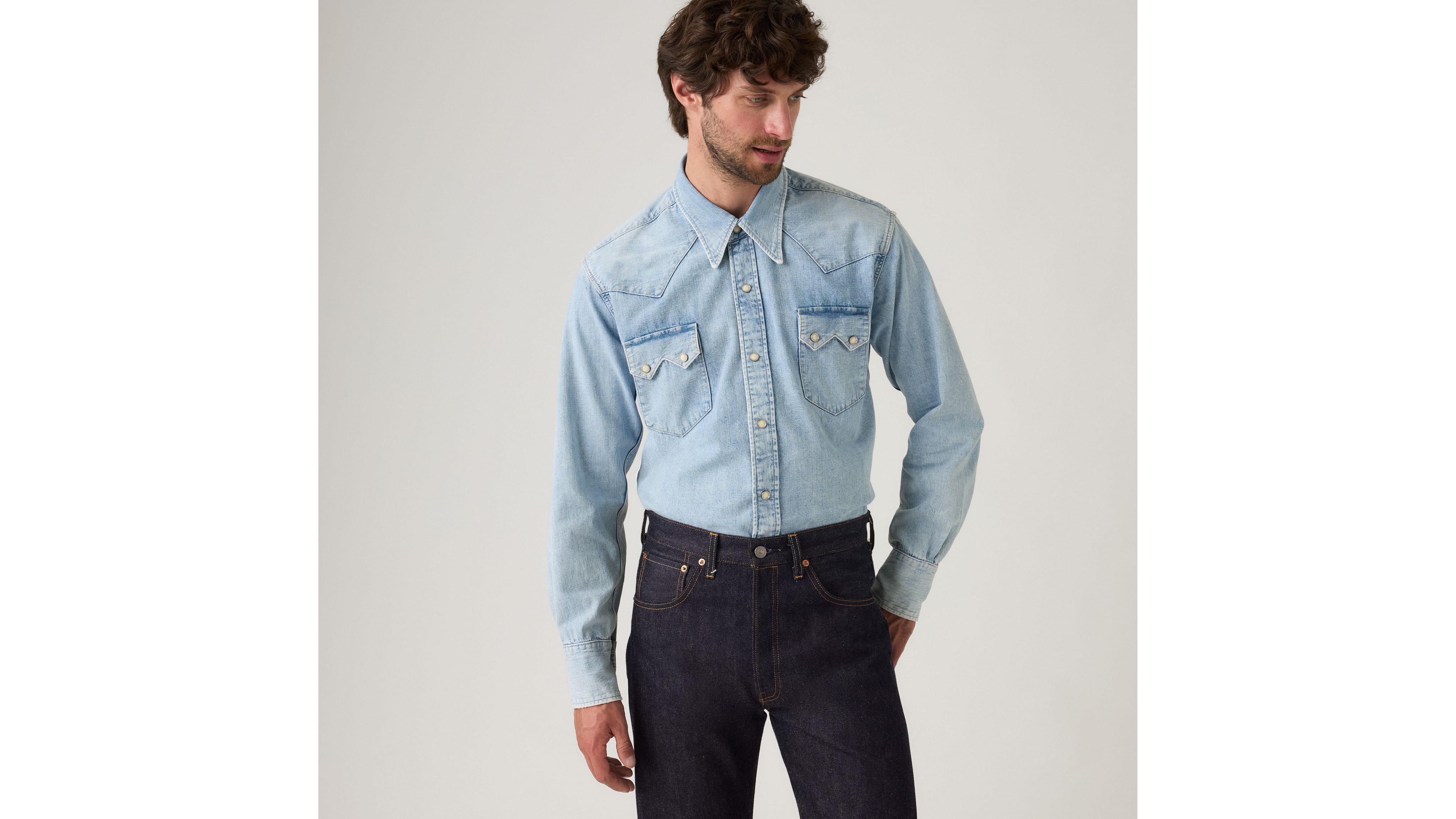 This iconic 1955 Sawtooth Shirt has a regular fit, Mother-of-Pearl snap buttons, western yoke details and the iconic Levi's® shorthorn label. This garment has gone through a unique color dyeing process—color transfer may occur onto other surfaces.