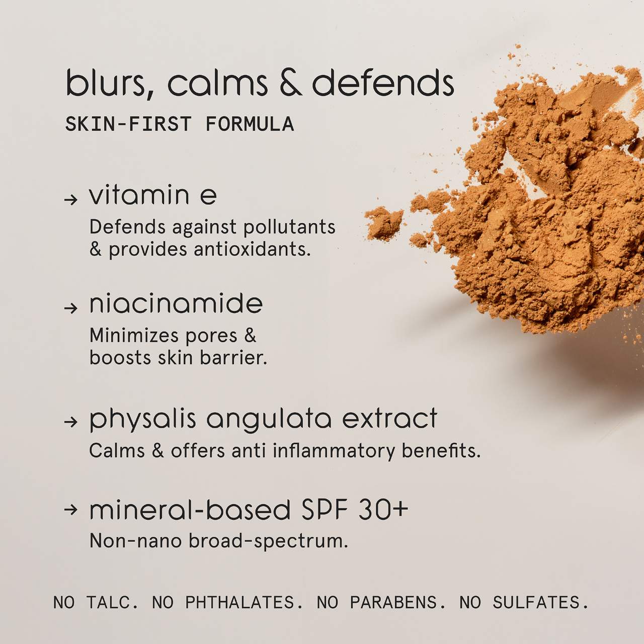 Titanium Dioxide 12.5%, Zinc Oxide: 22.5%, Dimethicone/Vinyl Dimethicone Crosspolymer, Mica, Polymethylsilsesquioxane, Calcium Sodium Borosilicate, Butyloctyl Salicylate, Tridecyl Salicylate, Niacinamide, Silica, Iron Oxides, Isodecyl Salicylate, Octyldodecanol, Dimethicone, Isoceteth-10, Phenylpropanol, Propanediol, Physalis Angulata Extract, Caprylic/Capric Triglyceride, Methicone, Caprylyl Glycol, Tocopherol.