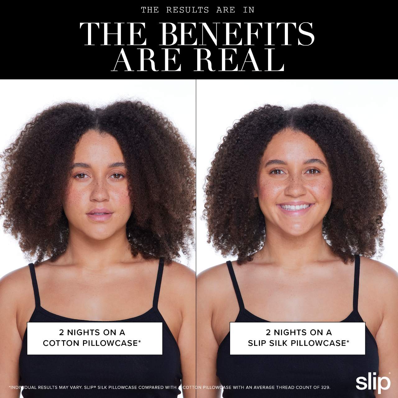 What Else You Need to Know: The beauty secret of celebrity hairstylists, dermatologists, and beauty experts, Slip pure silk products are made using slipsilkTM. Specially commissioned and made to exacting standards, slipsilk was developed and refined for over 10 years to provide the ultimate combination of shine, thickness, softness, and durability.Why switch to a slip pure silk pillowcase? Real results, real benefits in just 4 nights! Clinically shown* to visibly improve: - The appearance of fine lines - Skin hydration - Skin texture and smoothness - Skin radiance, luminosity or brightness Over 95% of users agreed sleep creases, sleep lines and sleep wrinkles were fewer and less noticeable.* Dermatologist recommended.** Slipsilk. Laboratory Tested. Hypoallergenic. The beauty secret of celebrity hairstylists, dermatologists and beauty experts. THE SLIPSILK DIFFERENCE: Slip pure silk products are made using slipsilk, developed and refined for over ten years to provide the ultimate combination of shine, thickness, softness and durability. ANTI AGING: We spend a third of our lives in bed. In laboratory testing, slip pure silk pillowcases were shown to absorb significantly less face cream than cotton pillowcases, so they can help keep your skin’s moisture and valuable face and hair products where they belong, on your face and hair. Slipsilk was also shown to create 43% less friction on average†, which can reduce stretching and tugging on delicate facial skin. ANTI SLEEP CREASE: Slipsilk has been shown to reduce friction by 43% on average†, allowing skin to glide along the pillow, which can reduce pressure on creased skin. ANTI BED HEAD: Ordinary cotton pillowcases can cause hair tangling during the night. In laboratory testing, slipsilk has been shown to reduce friction by 43% on average†. *Based on a study (clinical grading and consumer perception) of over 100 women, aged 35-65, who were regular users of cotton or synthetic (non-silk) satin pillowcases. Clinical grading showed statistically significant improvement. Individual results may vary. **Based on a survey of dermatologists in the United States conducted in April 2023. †Compared to widely available cotton pillowcases with a 220-360 thread count.