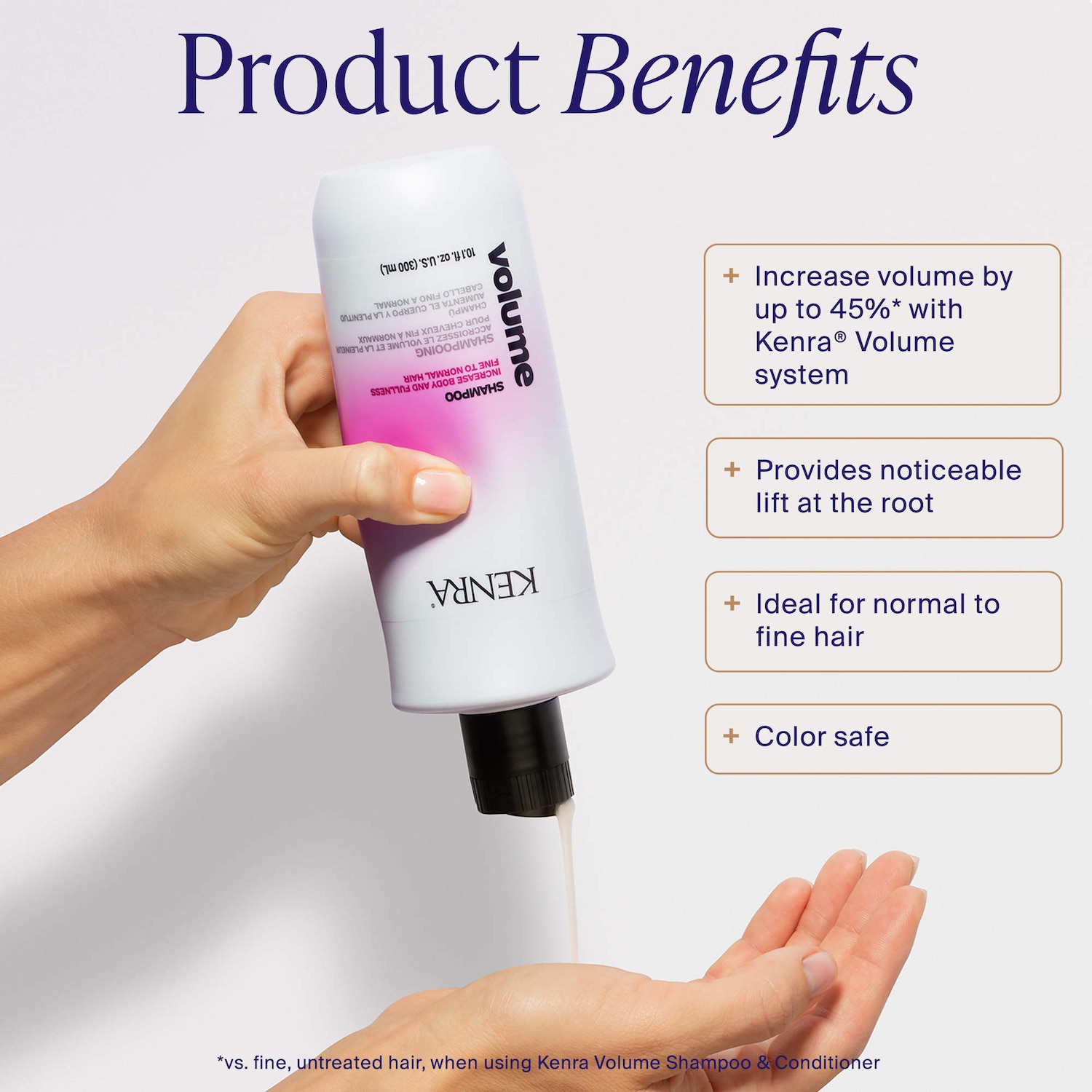 *Versus fine, untreated hair when using Kenra Volume Shampoo and Conditioner.