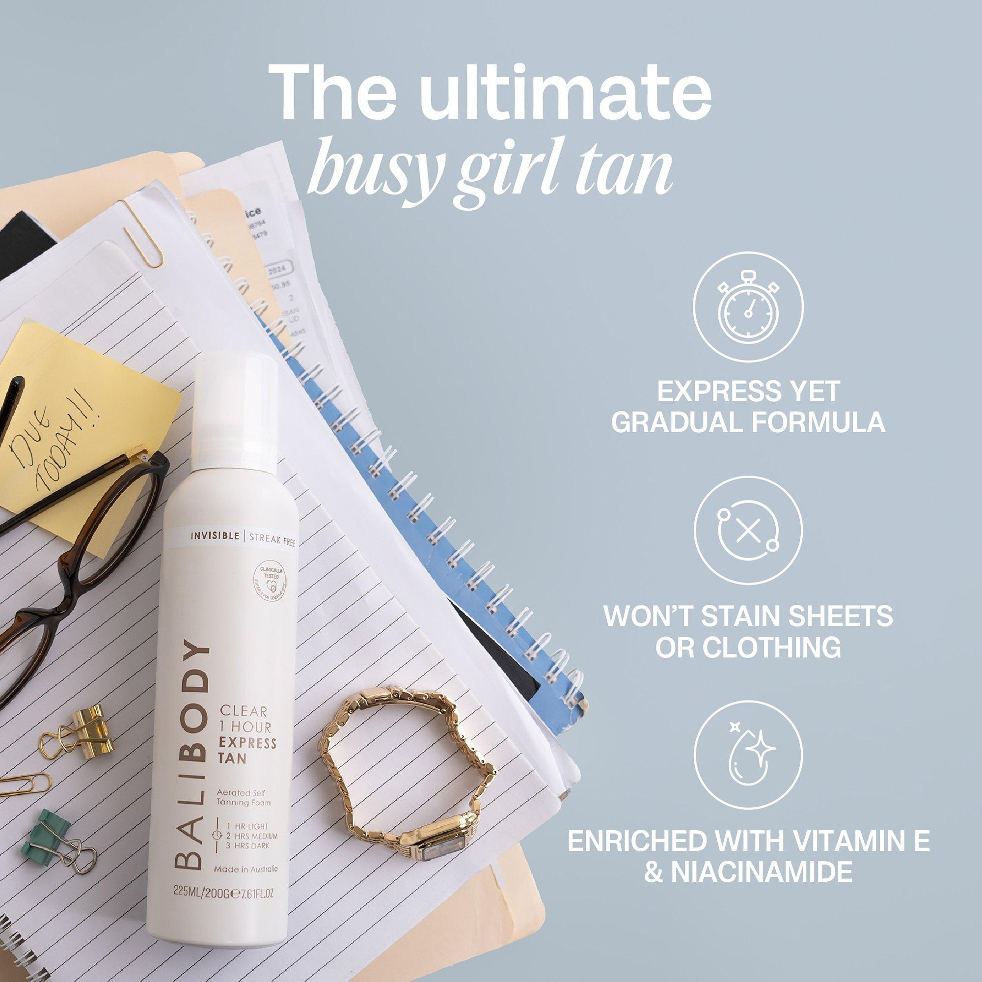 This express yet gradual formula rapidly delivers a bronzed glow that can also be layered over days for a deeper finish. No rinse, stains or transfer - perfect for busy girls on the go.