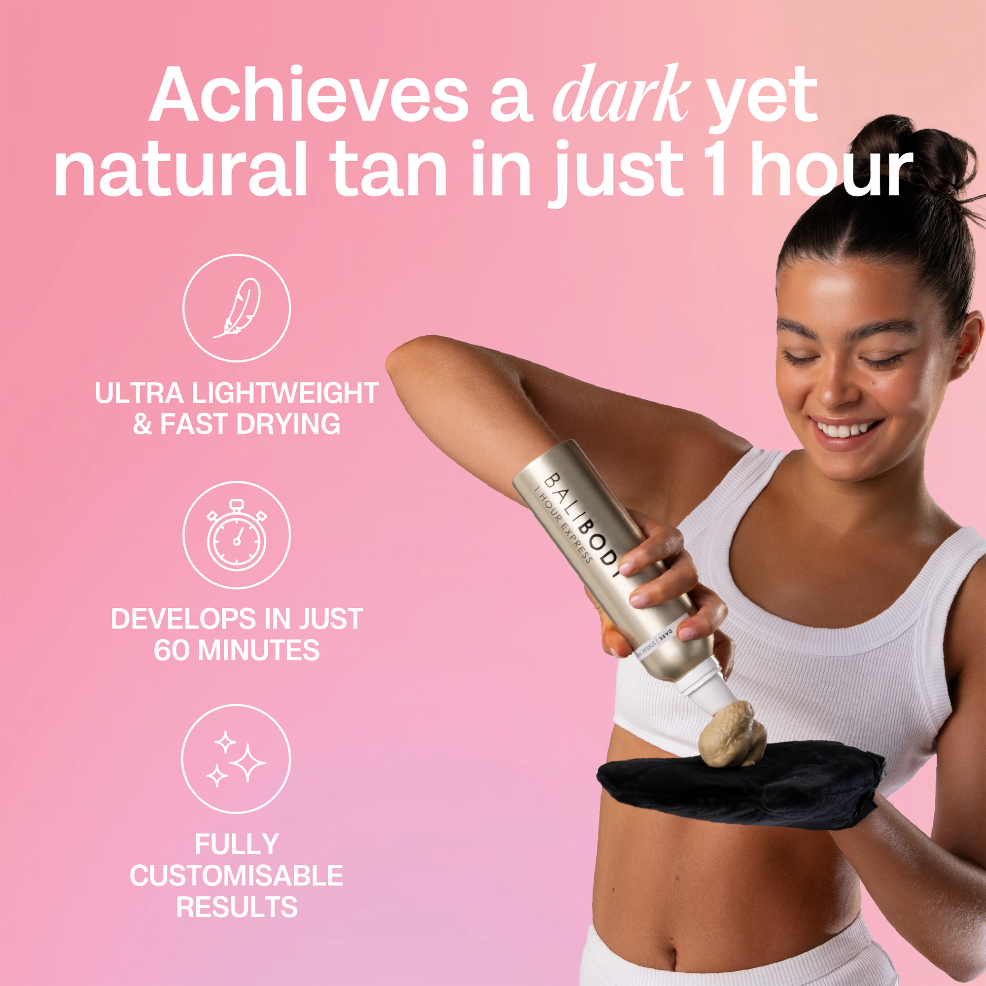 This express yet gradual formula rapidly delivers a bronzed glow that can also be layered over days for a deeper finish. No rinse, stains or transfer - perfect for busy girls on the go.