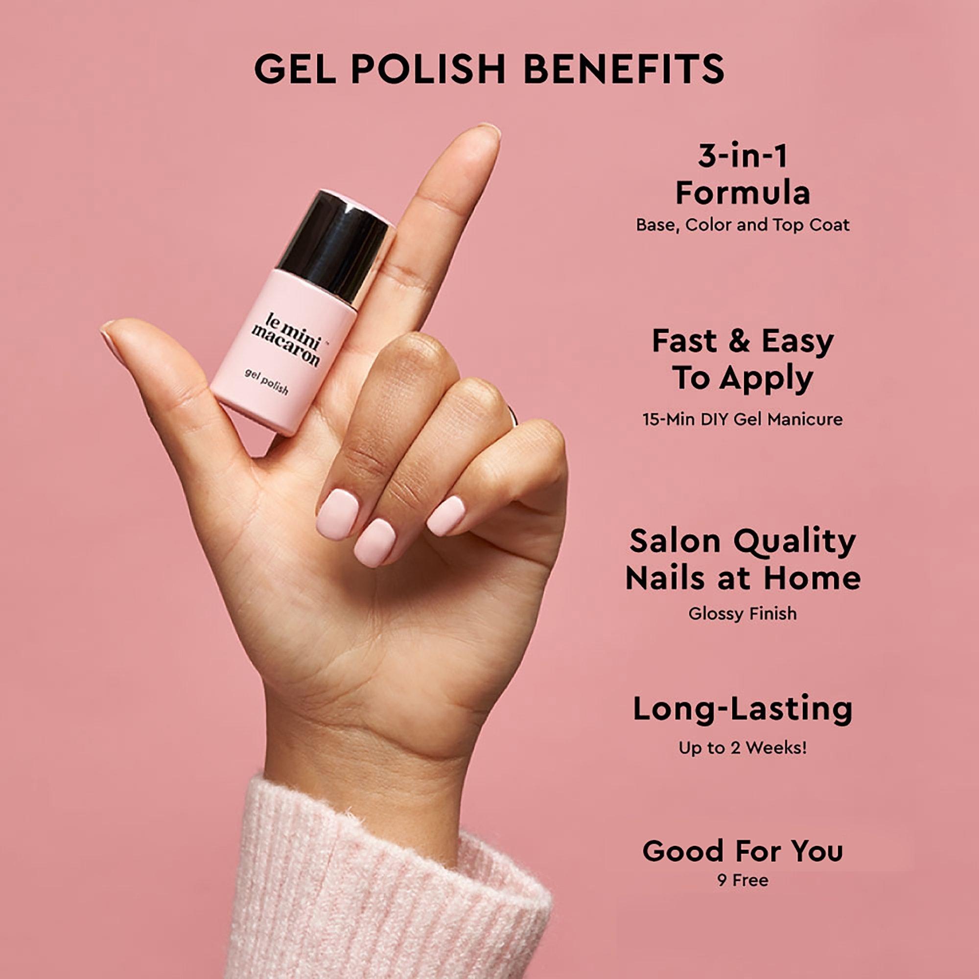 Le Mini Macaron's Gel Polish is a Do-It-Yourself gel manicure at home! A glossy, salon-quality gel manicure in just 15 minutes! The chip-free, no-wipe formula contains basecoat, color, and topcoat in just one bottle!