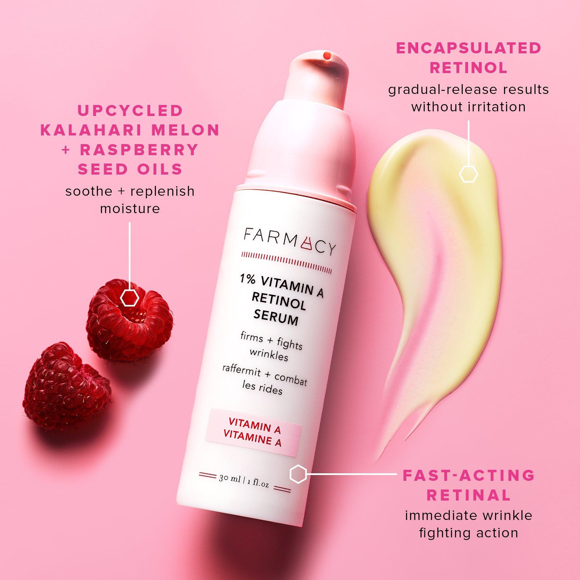 Farmacy's 1% Vitamin A Retinol Serum is a clinically proven serum with a double dose of fast-acting retinal and encapsulated retinol that visibly firms, targets fine lines and wrinkles, and improves texture while nourishing the skin with minimal irritation.