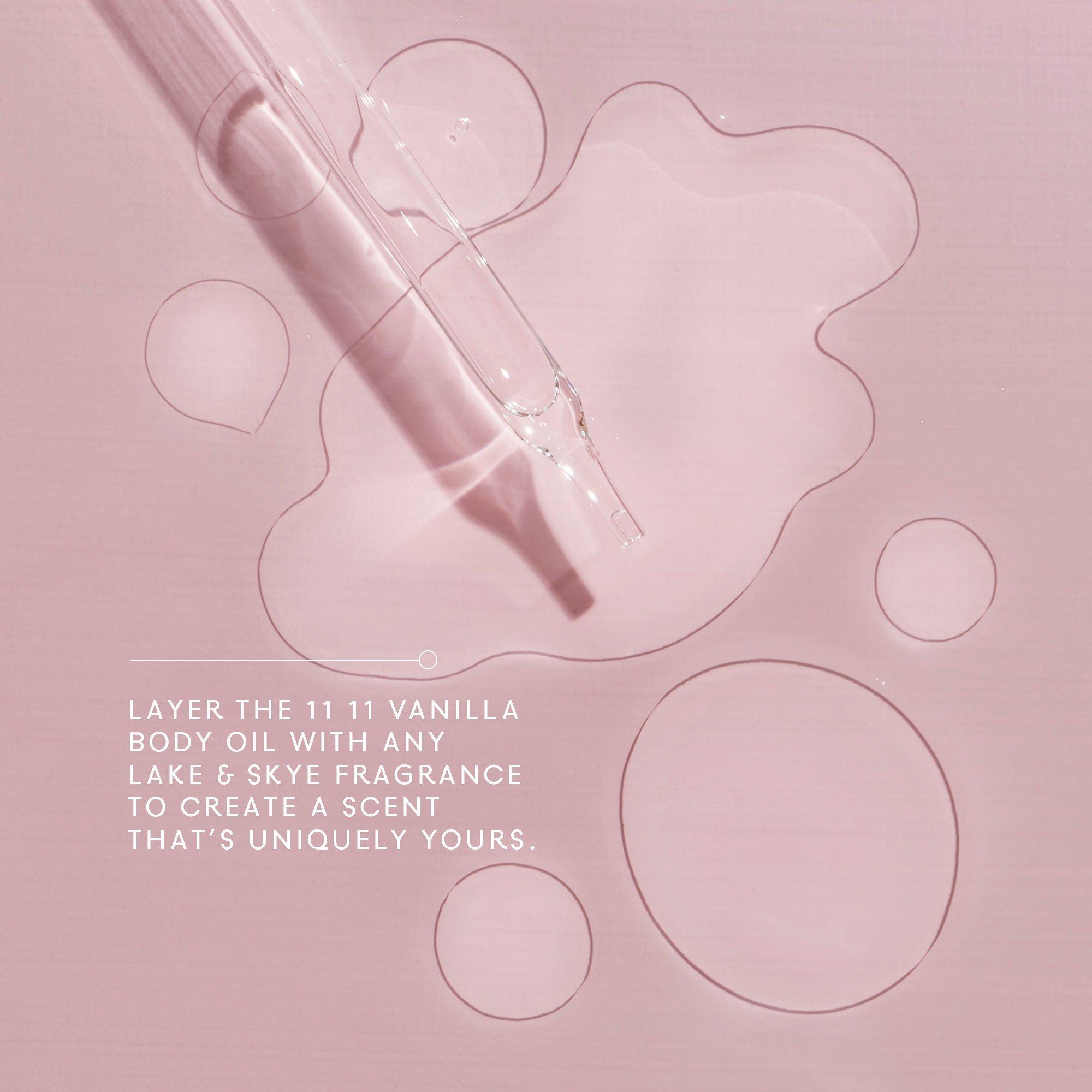 Soft & warm with just the right amount of sweetness, 11 11 Vanilla Body Oil is a luxurious take on Lake & Skye's classic 11 11 fragrance. Notes of vanilla crème & marshmallow with fresh star apple, sea salt, & a signature musk to create the feeling of being wrapped up in cashmere.