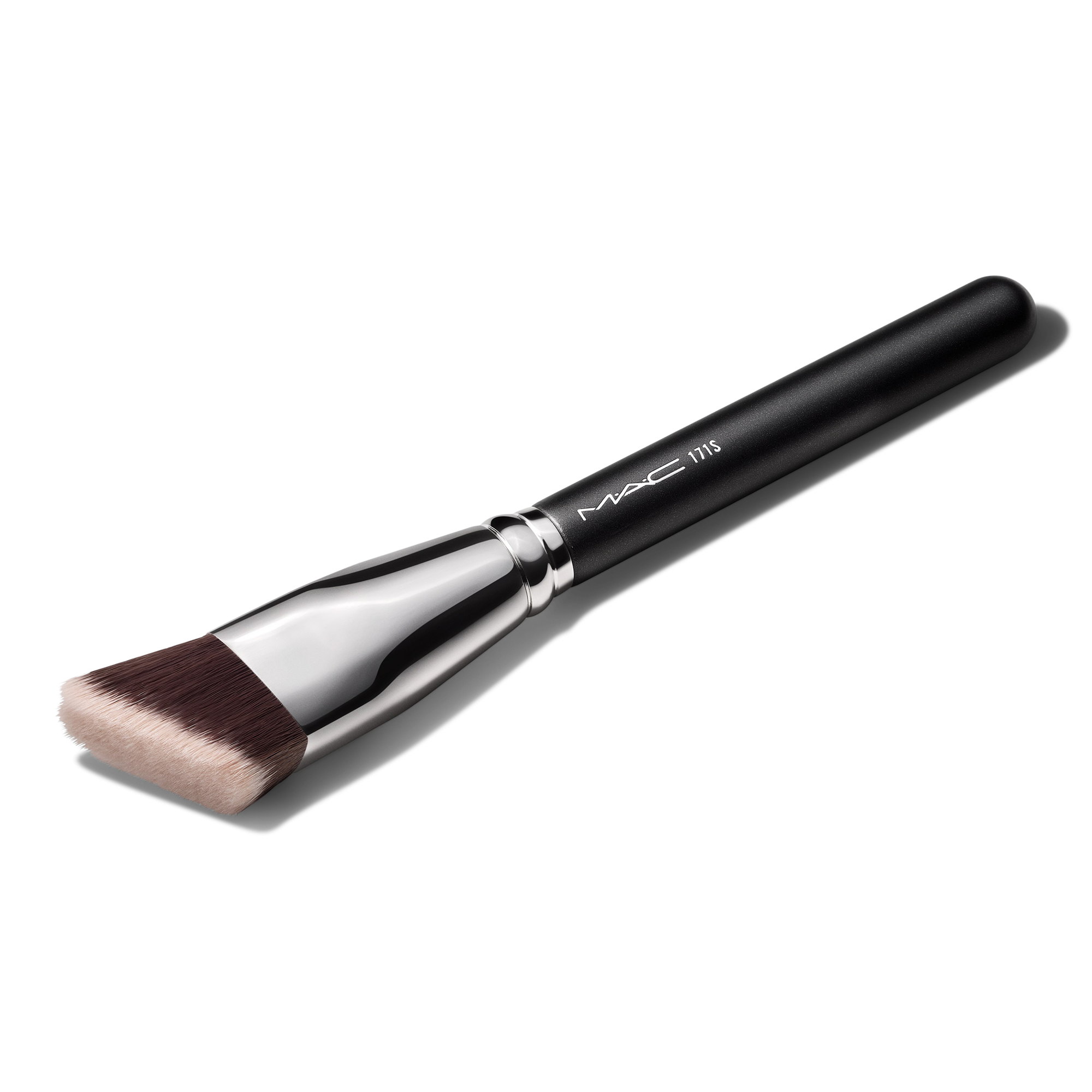 MAC 171 Smooth Edge All-Over Face Brush: a contour-hugging brush with sloped edges for the application of concealers, cream and liquid foundations, and tinted moisturizers. Angled to cover hard-to-reach areas around lips and brows.