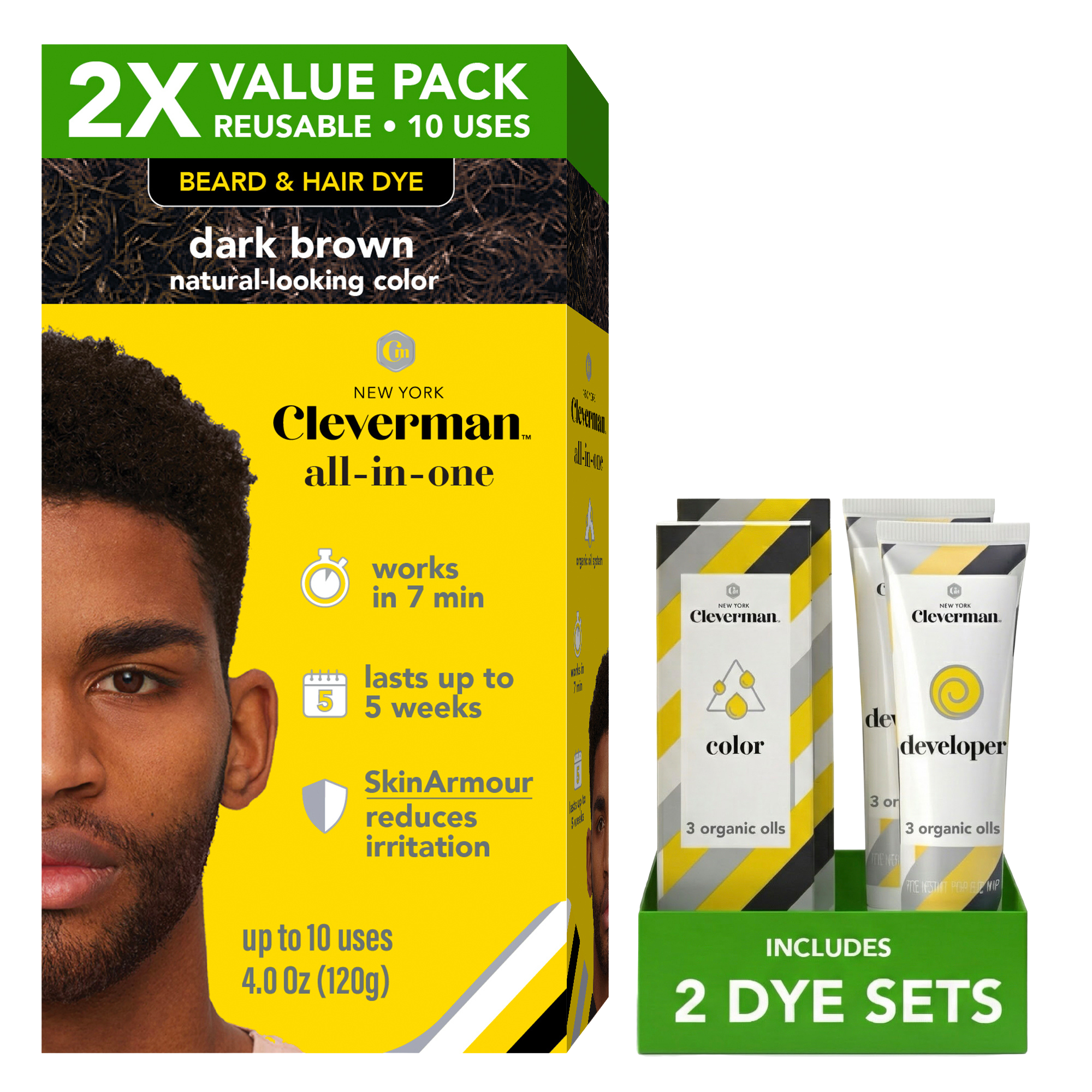 All-in-one hair & beard dye kit for natural-looking gray coverage on hair, beard, and mustache. Fast 7-minute results, lasts up to 5 weeks. Ammonia-free, vegan formula with nourishing oils. Easy to use and reusable, with up to 10 applications per kit (4.0 Oz).