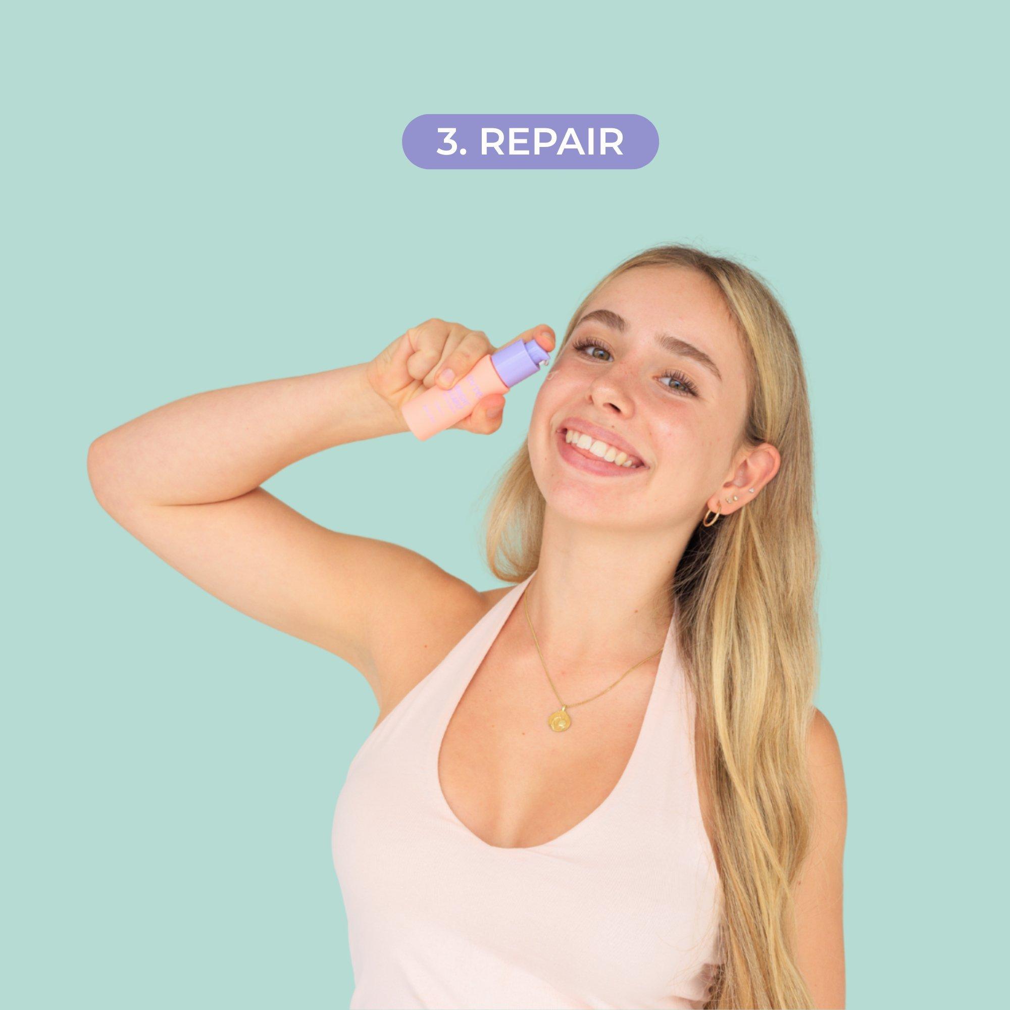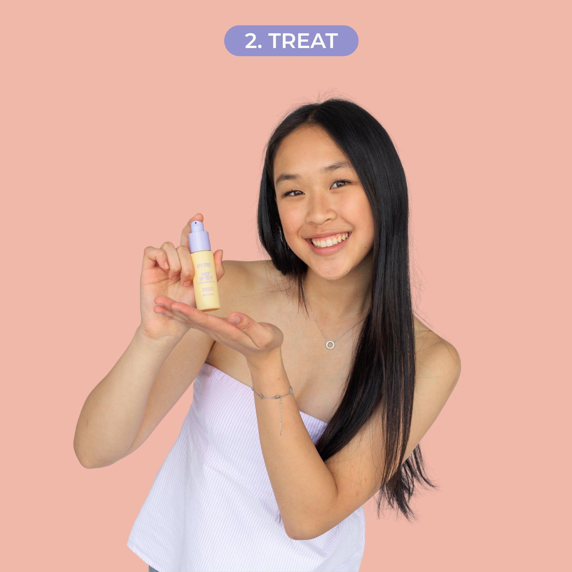 A targeted three-step routine for blemish-prone teen skin, includes cleanser, clarifying oil, and repair serum with salicylic acid and niacinamide. Treats without dehydrating. Formulated for teen skin - hormone friendly. Certified cruelty and palm free with all natural ingredients.