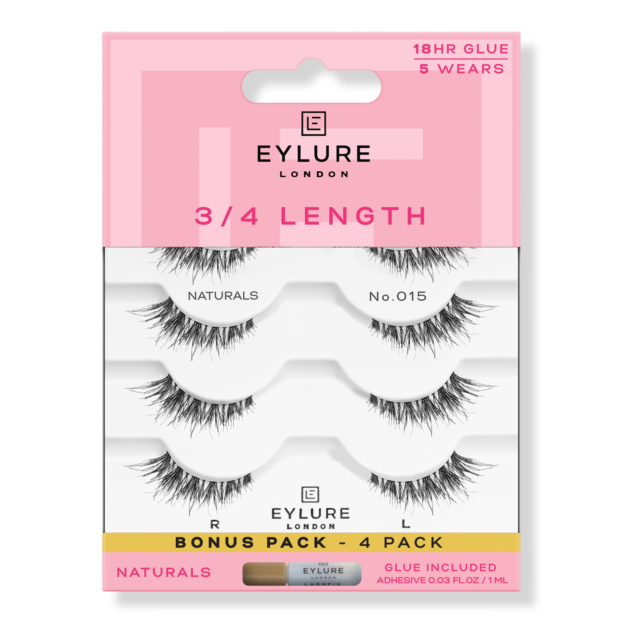 Soften your gaze and elevate your look with Eylure's 3/4 Length No. 015 Eyelashes, the perfect lash for getting glamorous on the go. Handmade and reusable for up to 5 wears, every lash pack comes with latex free lash adhesive. Now available in a Multipack with a bonus lash.