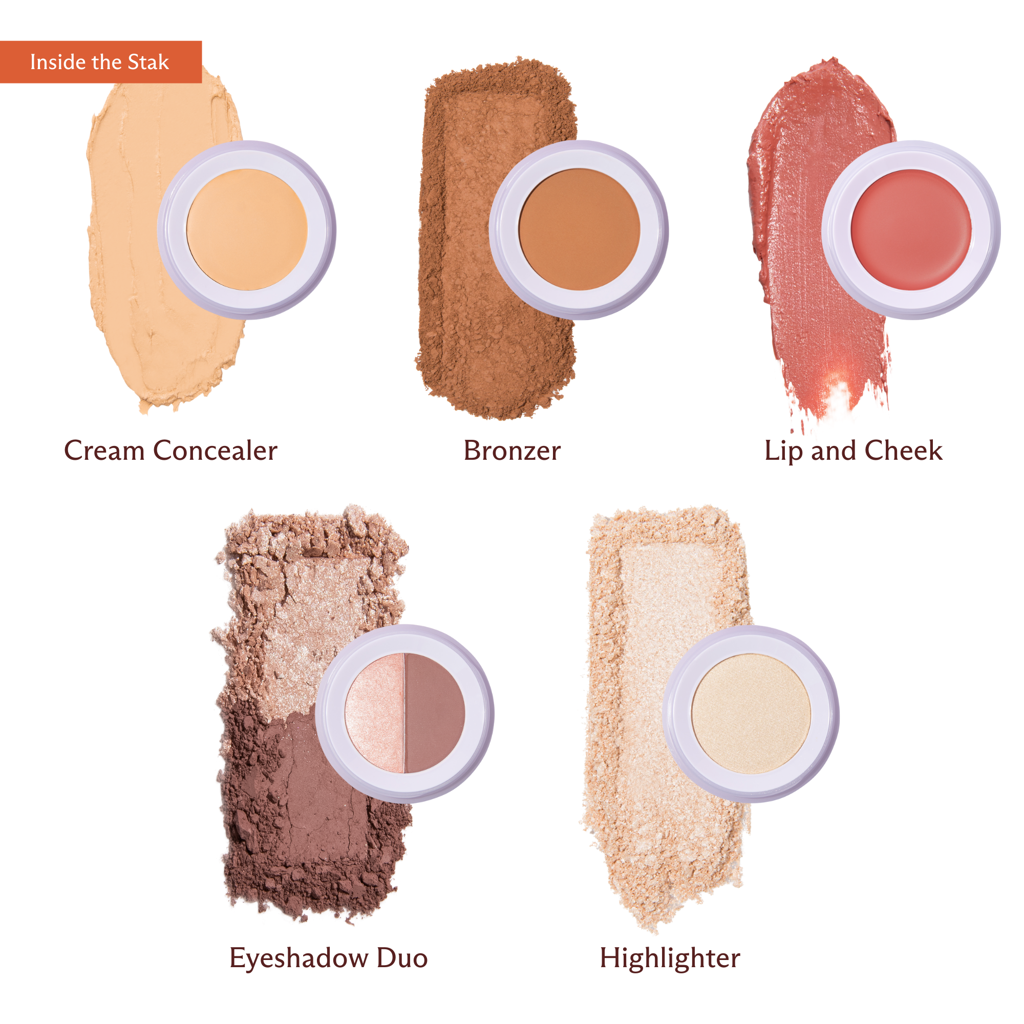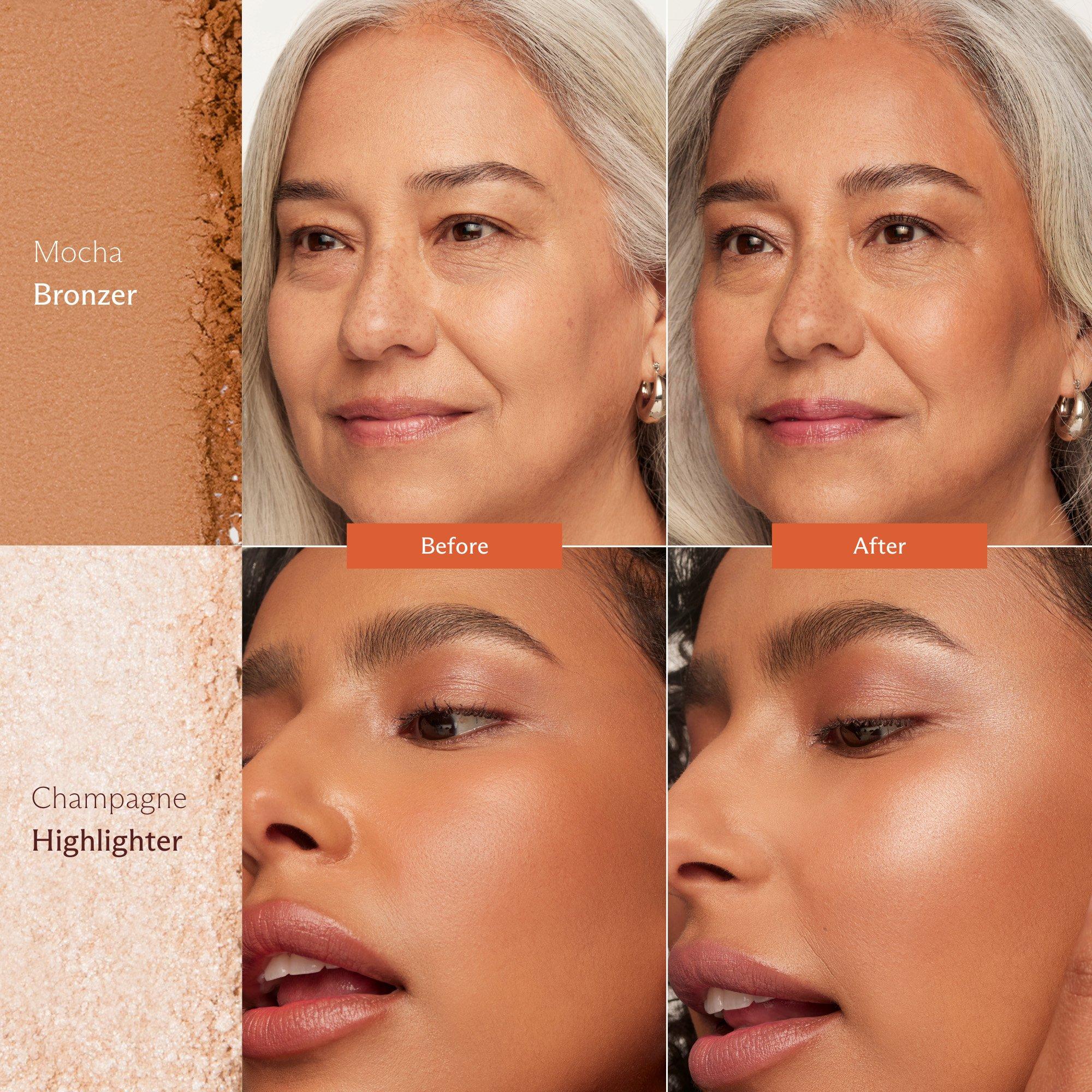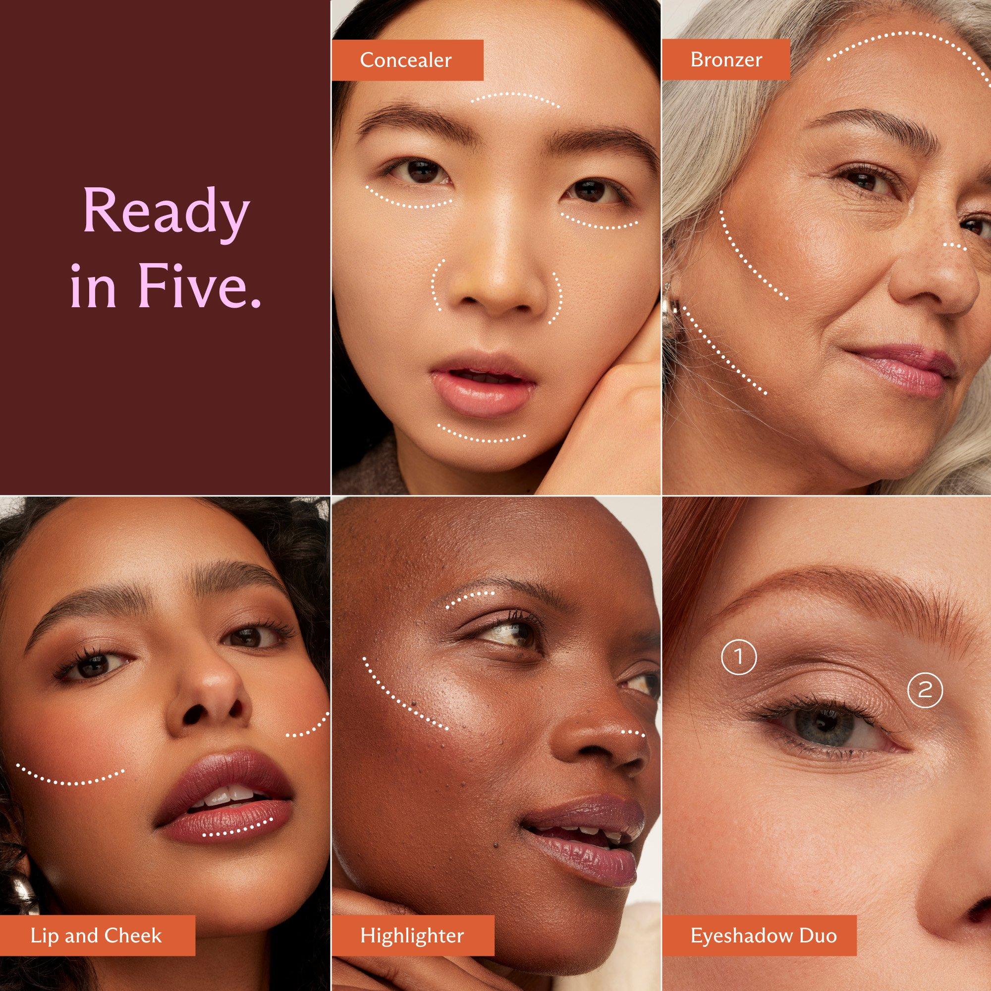Your all-in-one stackable set for a full face in minutes. Brighten with concealer, add warmth with bronzer, sweep on eyeshadow, and finish with lip, cheek, and highlighter. Kit complete with travel mirror and mini brush for effortless application anytime, anywhere.