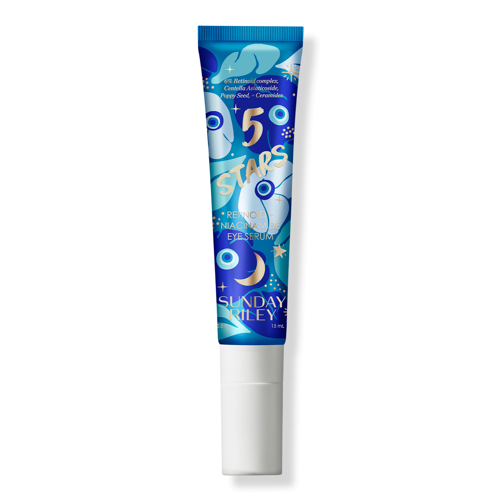 Sunday Riley's 5 Stars Retinoid & Niacinamide Eye Serum is powered by 6% retinoid complex and bioactive centella asiatica to support natural collagen production. Balanced with poppy seed extract, ceramides, olive oil and shea butter to hydrate and restore skin while you sleep.