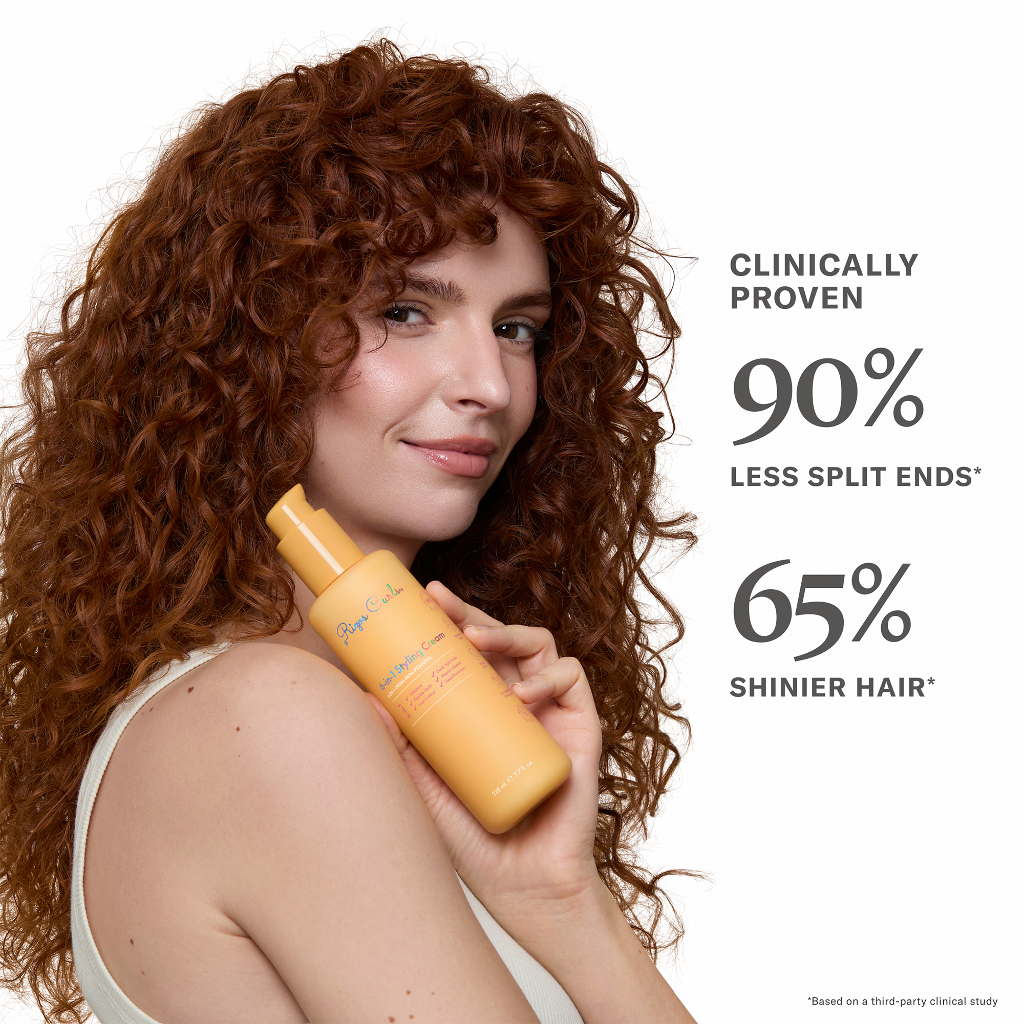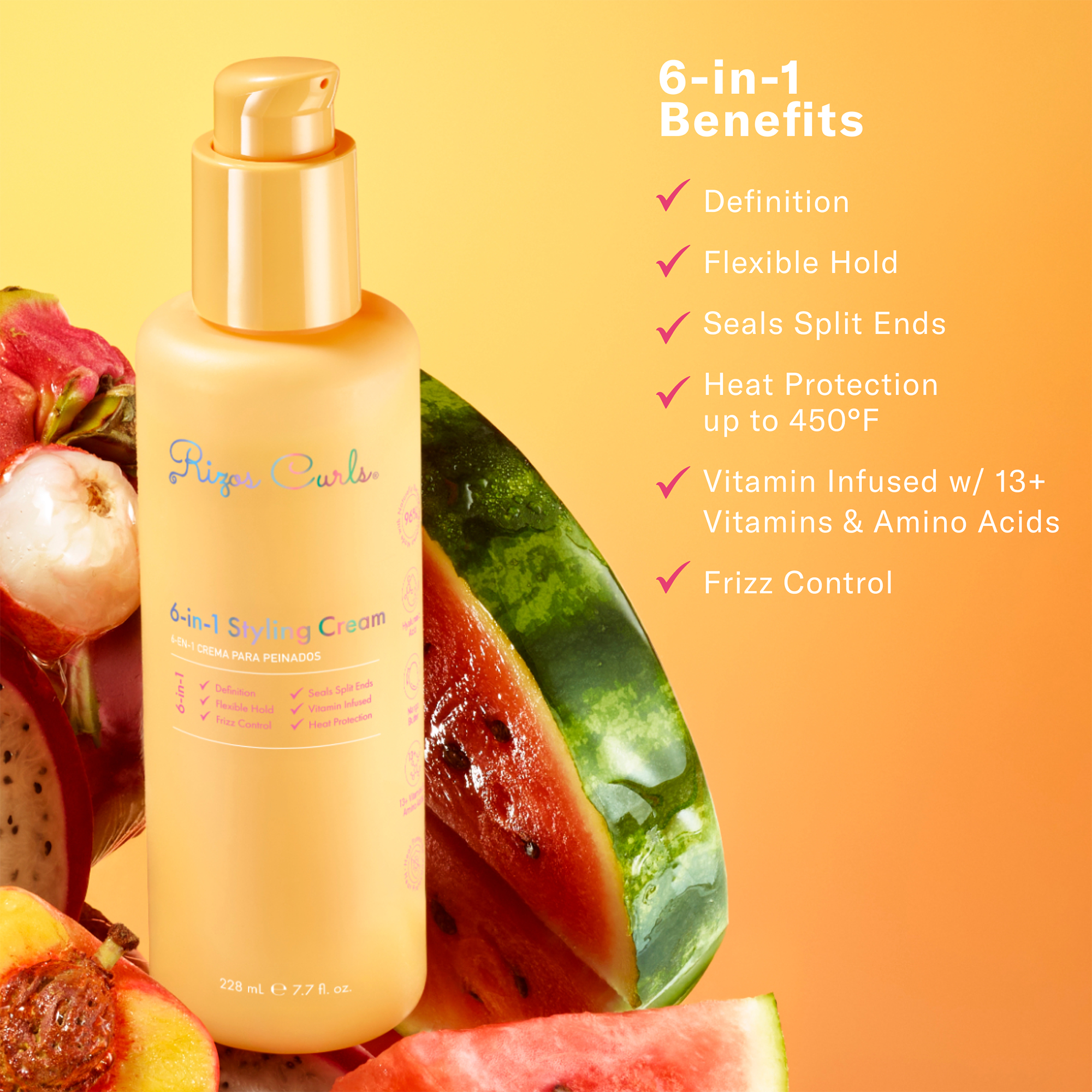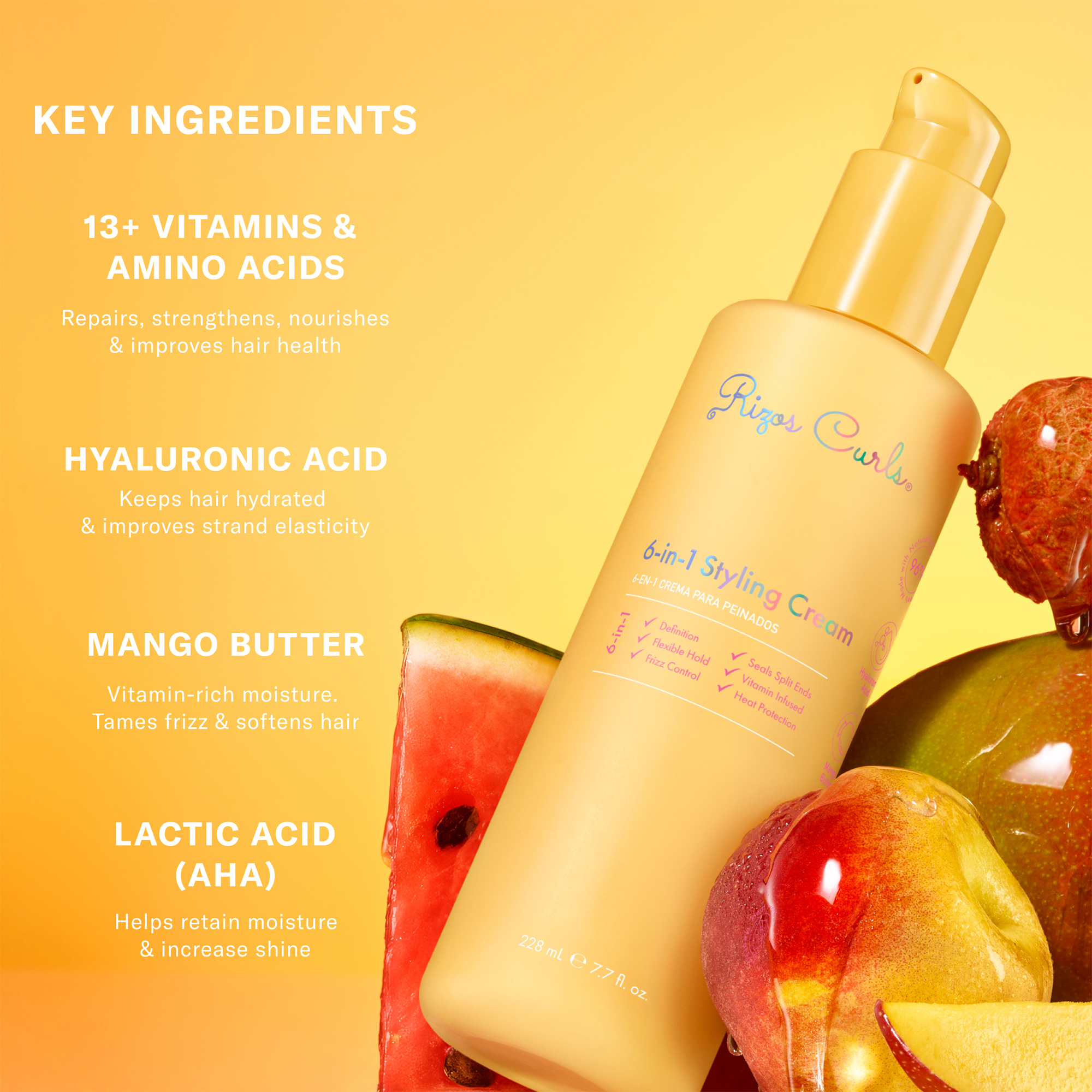 Rizos Curls 6-in-1 Styling Cream is a lightweight multitasking styler that defines curls, fights frizz, provides flexible hold, and offers heat protection. Infused with 13+ vitamins, amino acids, and Hyaluronic Acid, which help repair damaged ends, nourish and moisturize without weighing hair down.