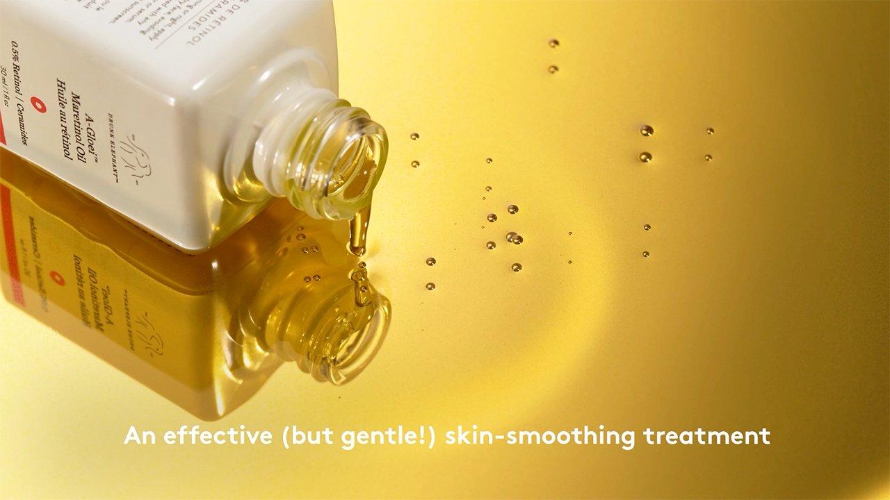 Drunk Elephant A-Gloei Marula + Retinol Oil is a skin-smoothing treatment that combines vegan retinol, virgin marula oil, and ceramides to refine skin's texture and minimize the appearance of lines, hyperpigmentation, blemishes, and sun damage while locking in moisture and restoring a healthy glow.