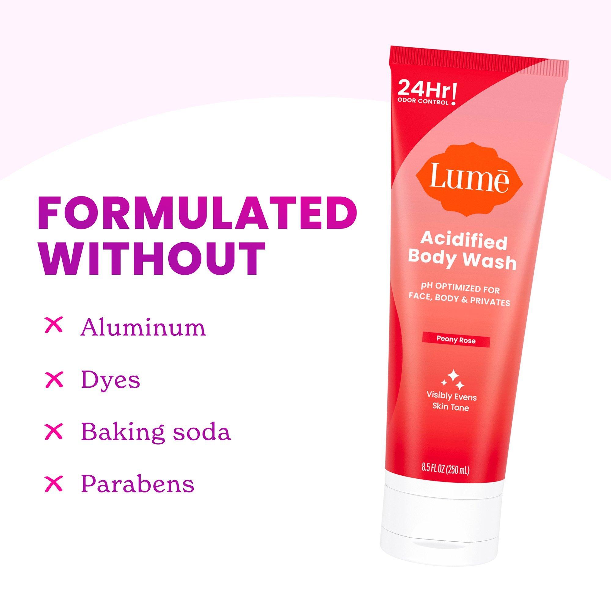 Go beyond clean with Lume Acidified Body Wash for women. Life can leave you feeling less than fresh—especially in odor prone areas. Lume’s body wash for women puts more power in your shower with an acidified formula that knocks out existing odor while priming your skin to control new odor.
