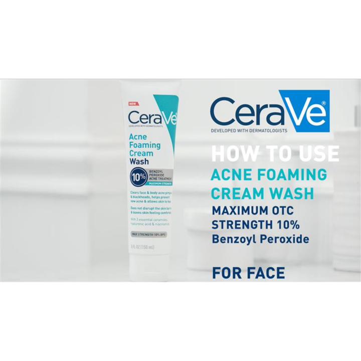 CeraVe Acne Foaming Cream Wash with 10% BPO for Face & Body is CeraVe's first acne-treatment product with maximum OTC strength 10% benzoyl peroxide is developed with dermatologists & clinically tested to clear, treat, and help prevent acne pimples and blackheads on the face and body.