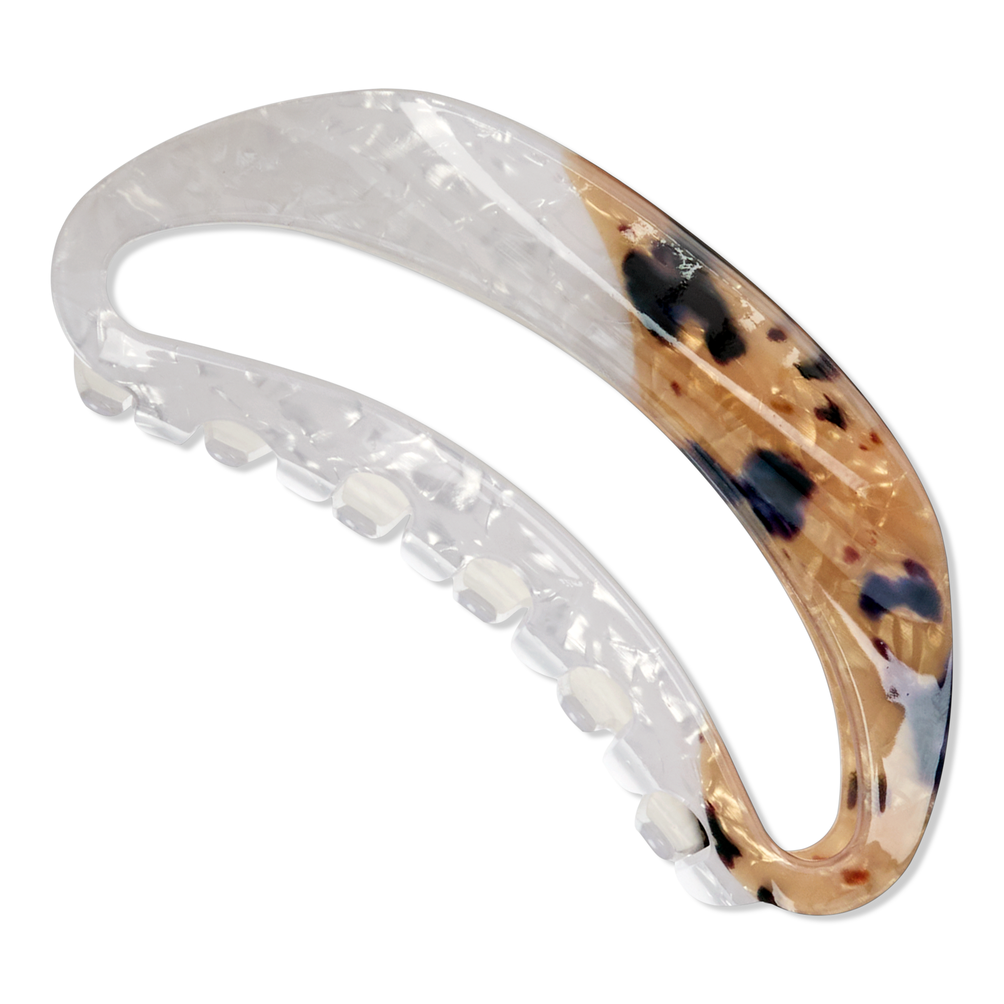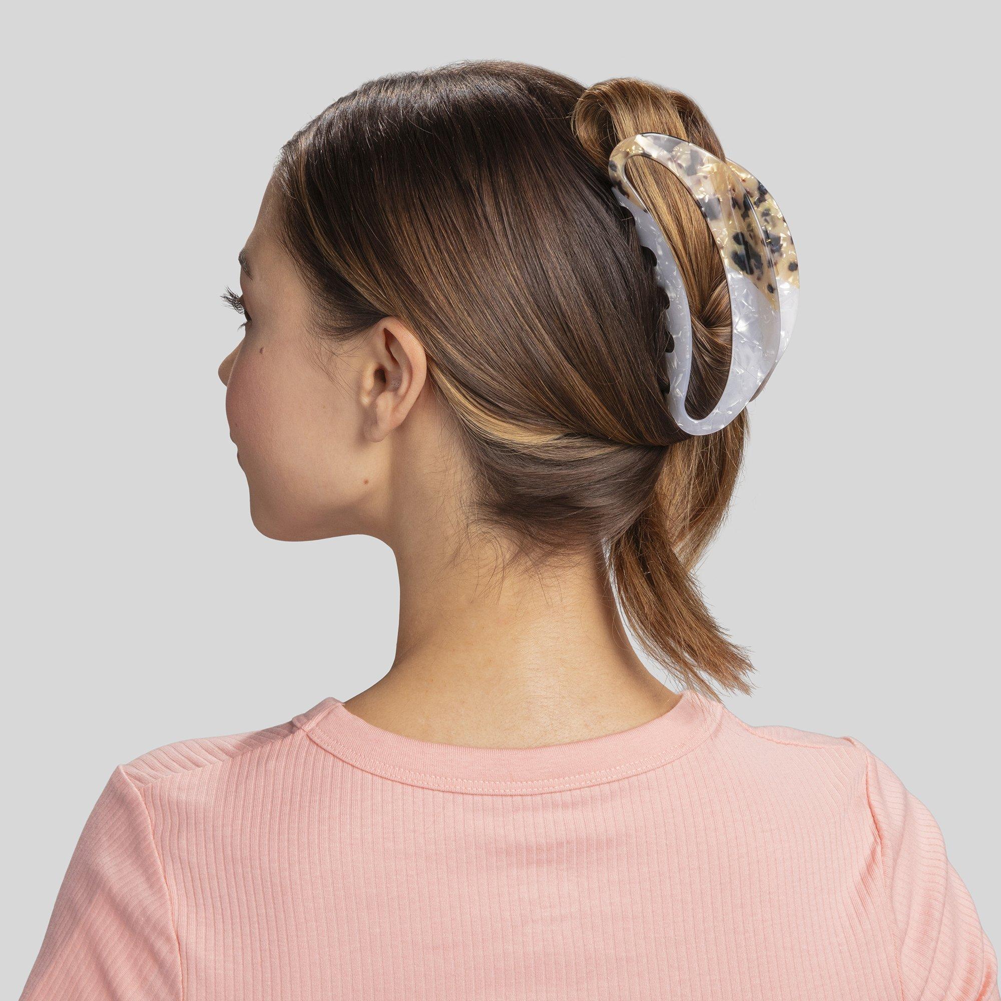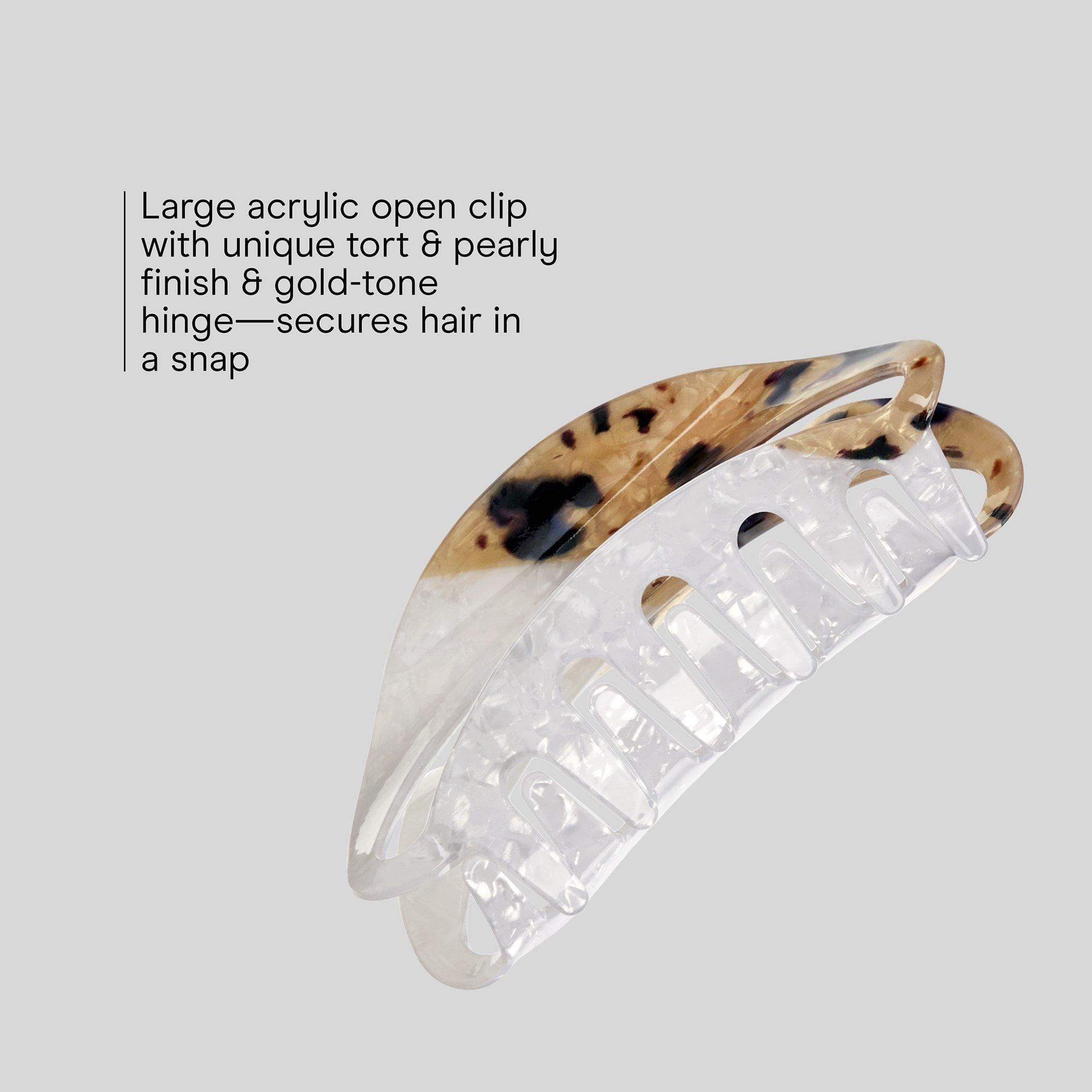 Turn heads with the Conair mixed-finish open-center claw clip. With its mixed acrylic finish and gold-tone hinge detail, this large open clip delivers easy hold with a clean, fashion-forward look.