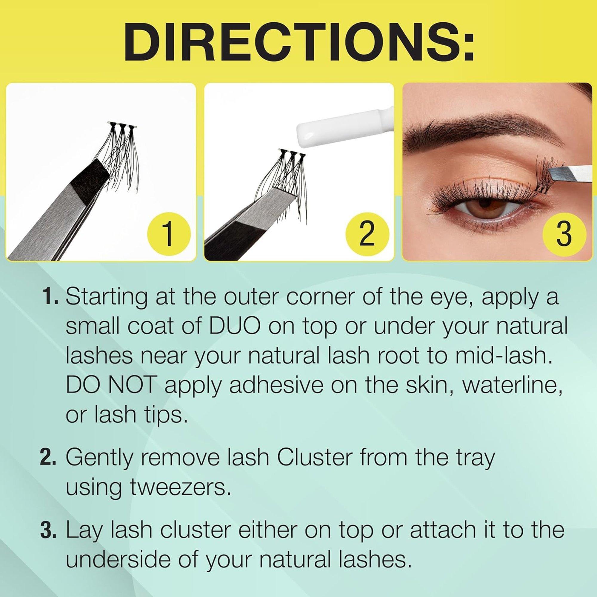 Place over natural lash, close to the lash line without touching eyelid. Apply additional lashes for desired look.