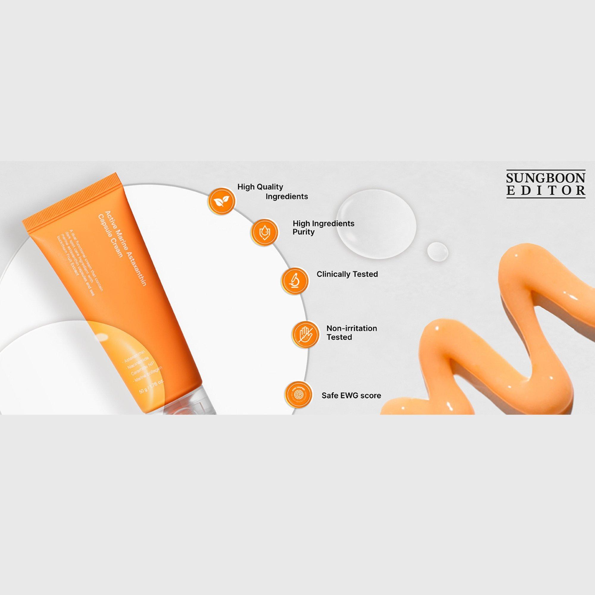 Clinically tested SUNGBOON EDITOR Active Marine Astaxanthin Capsule Cream, enriched with astaxanthin, niacinamide, patented RESMERIN HR & glutathione, prevents pigmentation, evens out, hydrates, and gently exfoliates. Safe for daily use, even on sensitive skin.