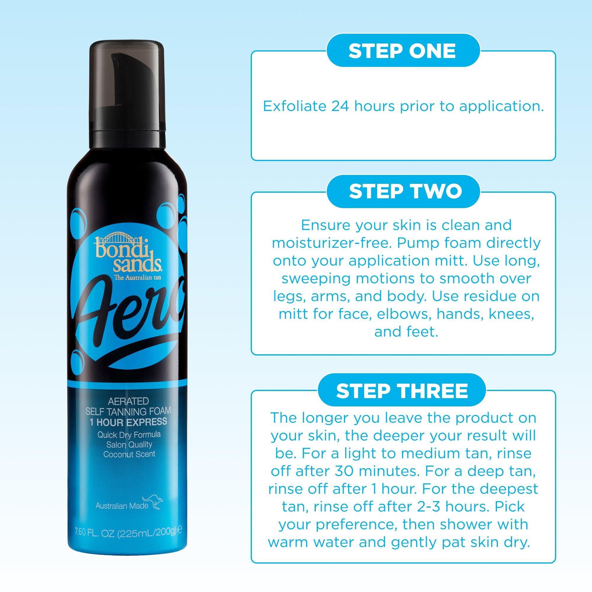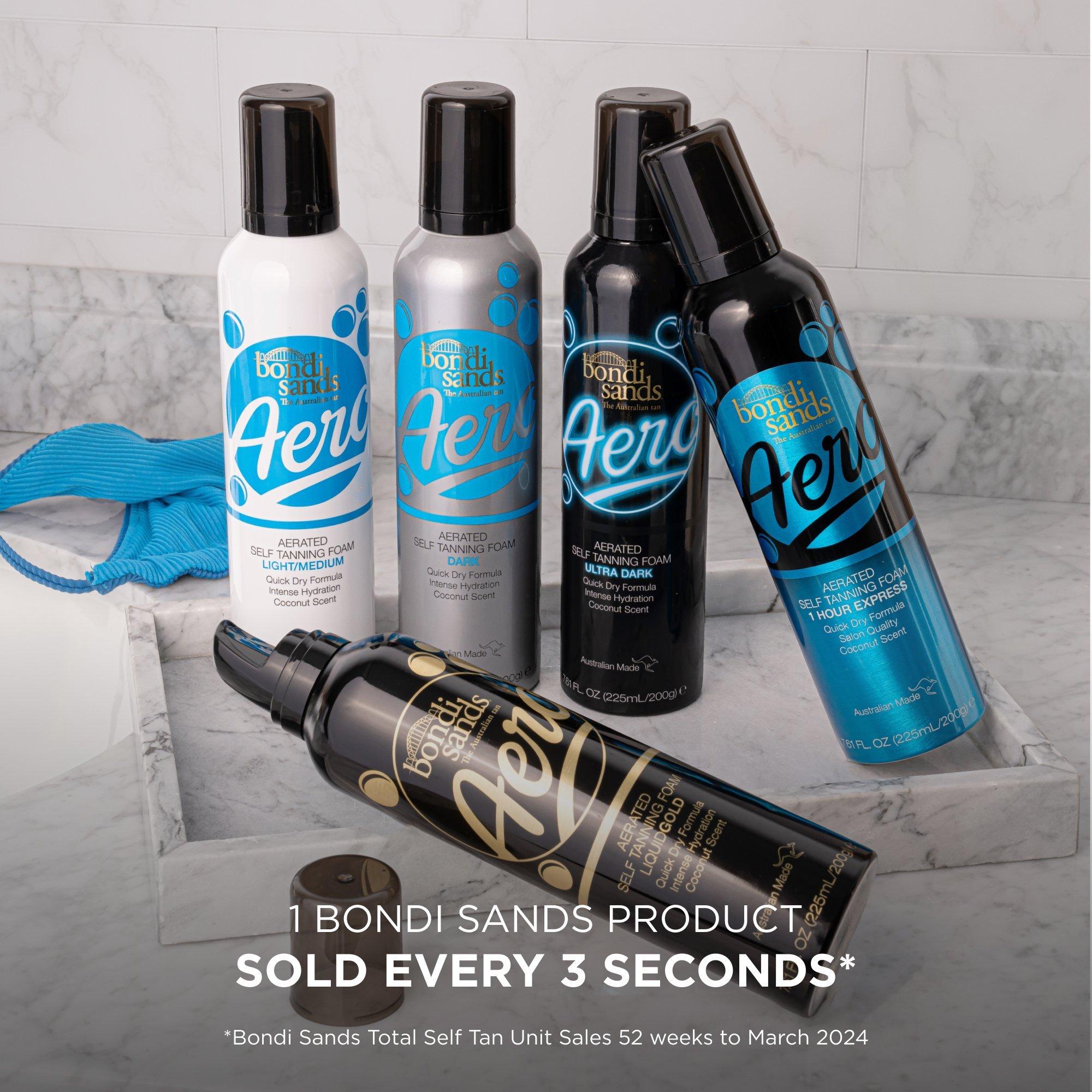Sand, sea and sun, the enviable Australian image. Experience a sun-kissed Australian tan in just 1 hour with Bondi Sands Aero Aerated Self Tanning Foam 1 Hour Express Infused with a scent of coconut, this ultra lightweight aerosol foam will leave your skin glowing like a day on Bondi beach.