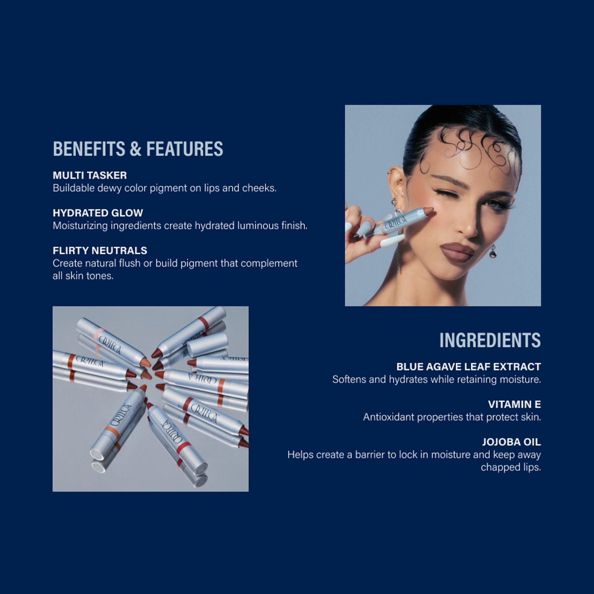 Apply to lip and/or cheek and re-apply for buildable color. Create flush for full face with one stick.