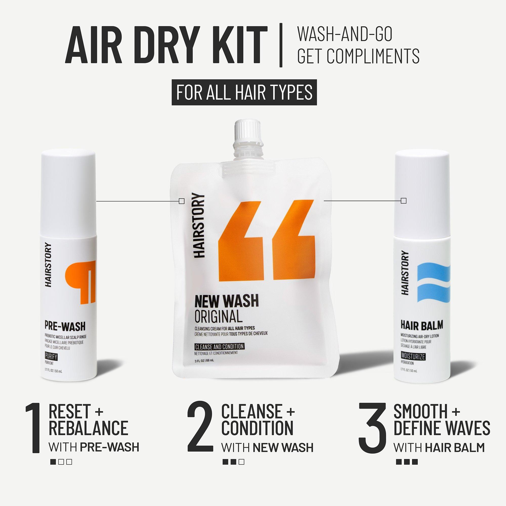 The Hairstory Air Dry Kit for All Hair Types is an easy wash-and-go routine for endless good hair days. Step 1: Deep-clean with Pre-Wash. Step 2: Cleanse and condition with New Wash Original. Step 3: Apply Hair Balm and let air-dry for smooth, moisturized strands and enhanced natural waves.