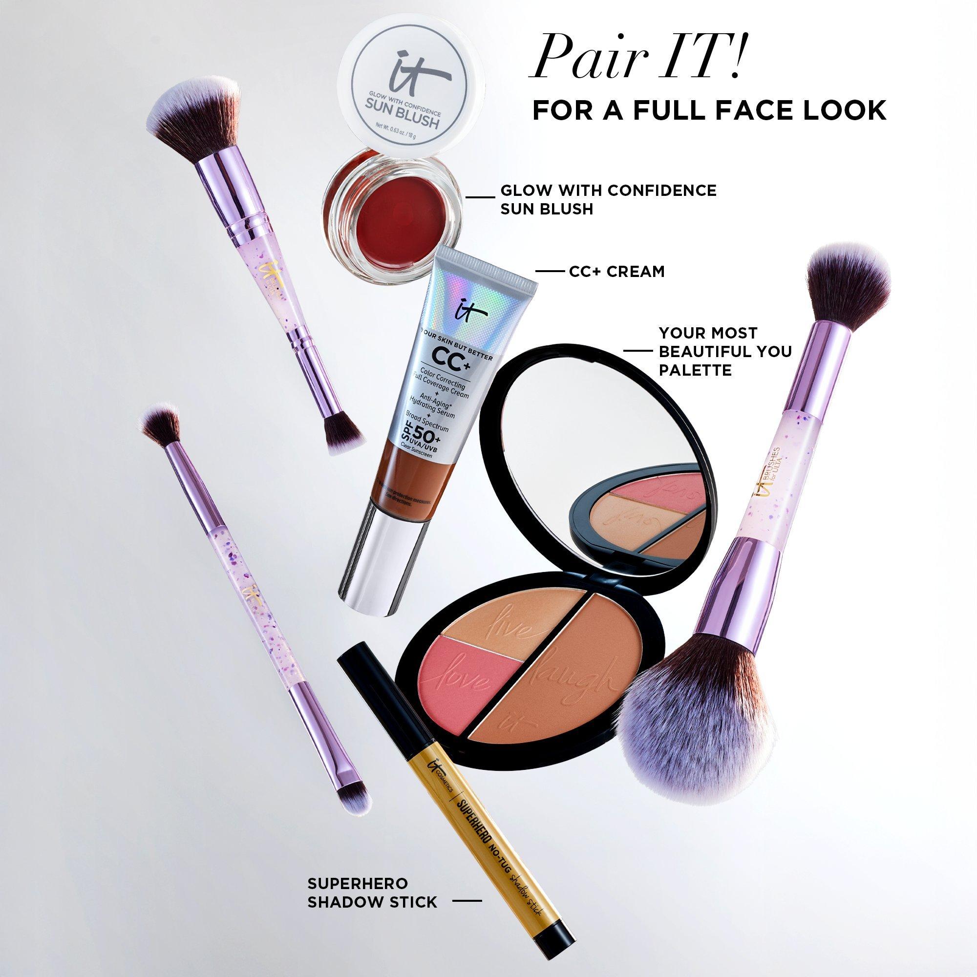 Unwrap an airbrushed finish with IT Brushes For ULTA's multitasking dual-ended brush set! This limited-edition galactic purple bundle includes your full face and eye essentials: a 2-in-1 concealer & foundation brush, powder brush, and shadow brush.