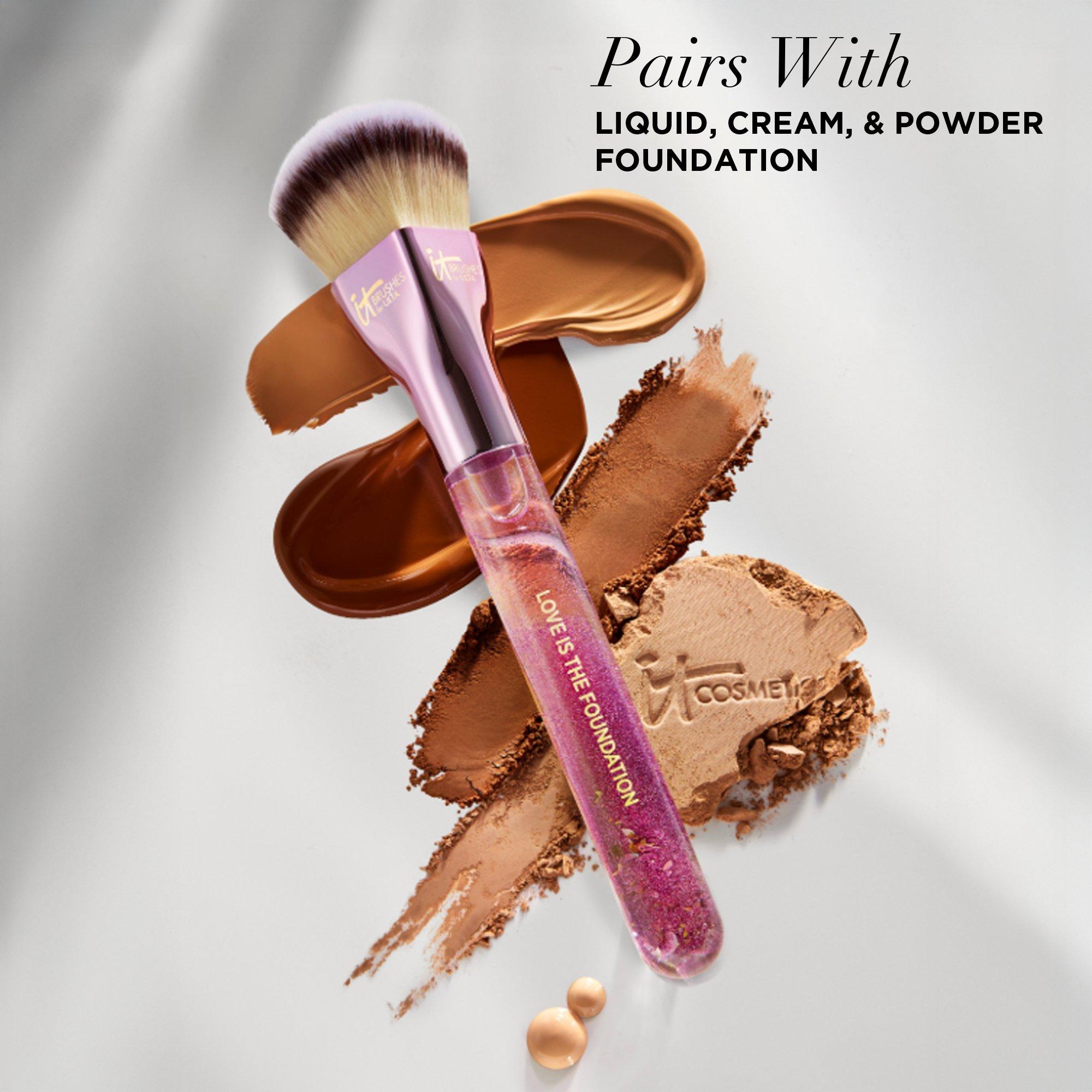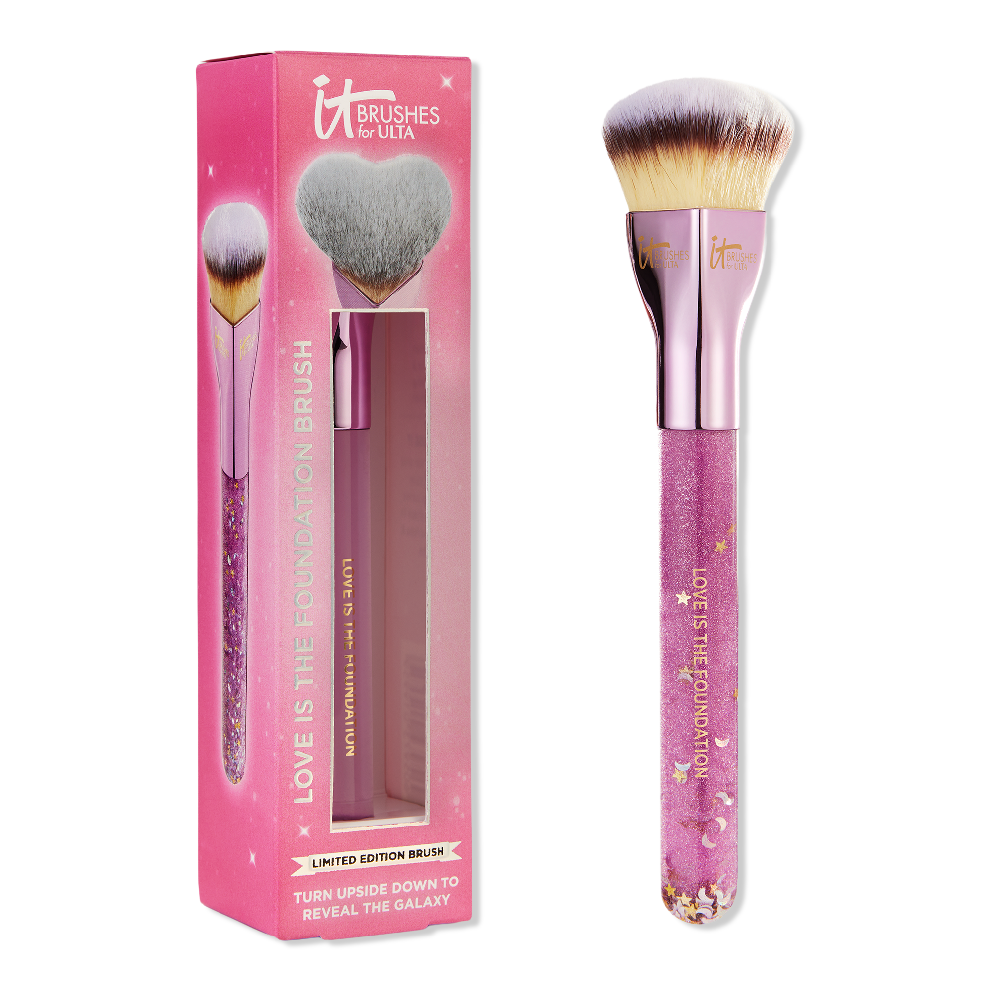 Unleash the galaxy! This limited-edition heart-shaped brush from IT Brushes features a custom liquid handle packed with glitter, stars, and moons. The ultra-plush brush head works effortlessly to apply your favorite liquid, cream, and powder foundations for a flawless-looking, airbrushed result!