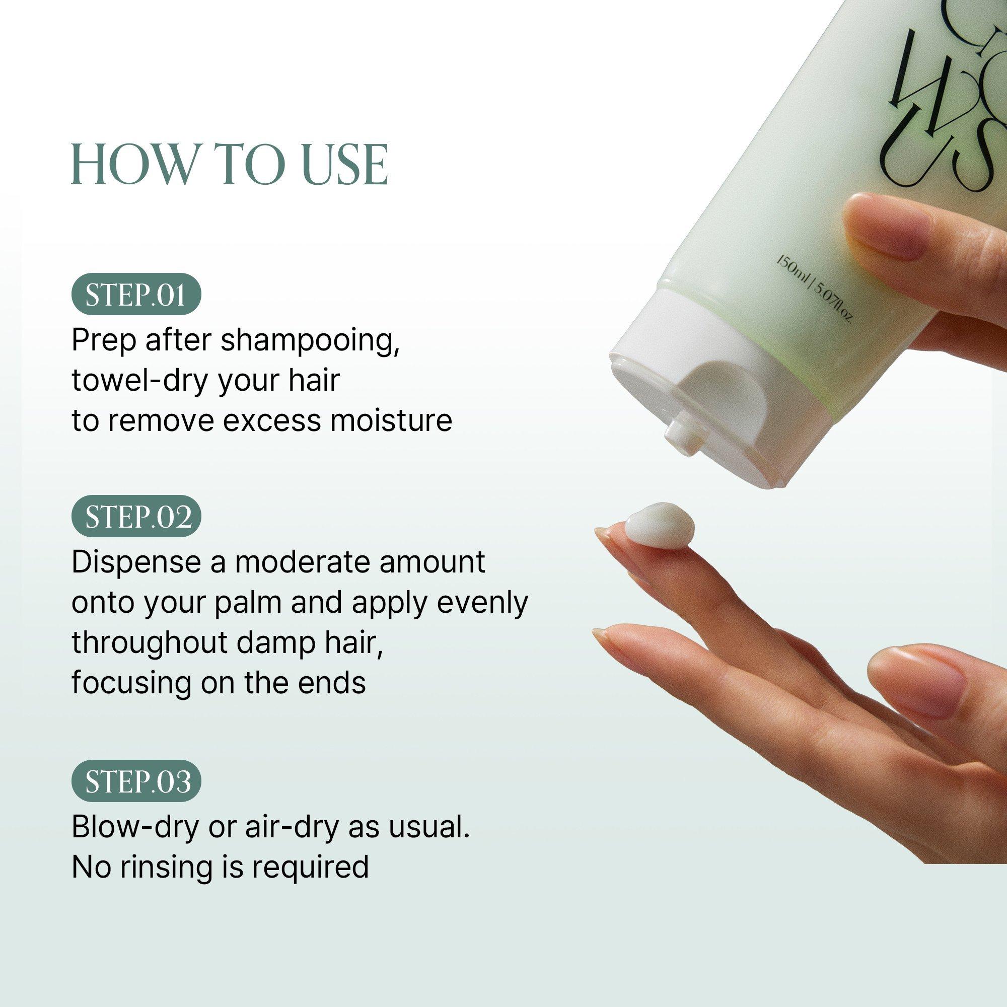 1. Apply a small amount to towel-dried hair, focusing on mid-lengths and ends.